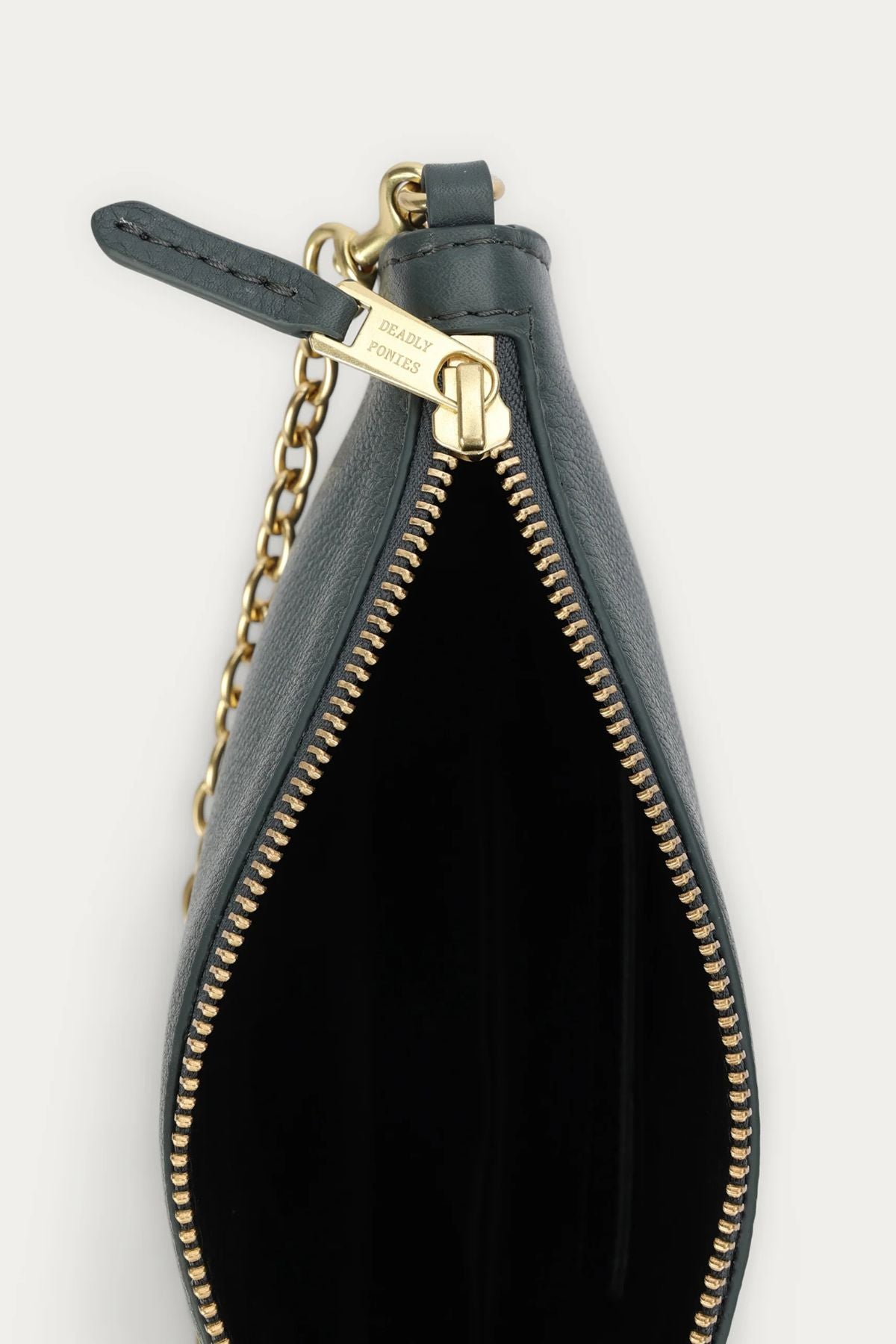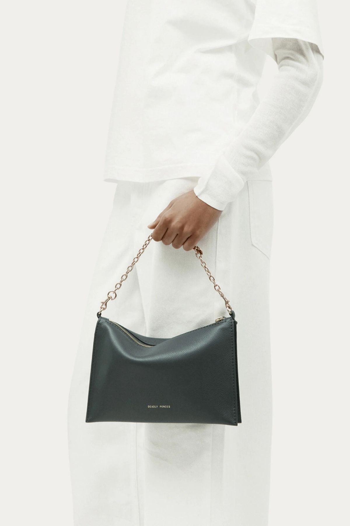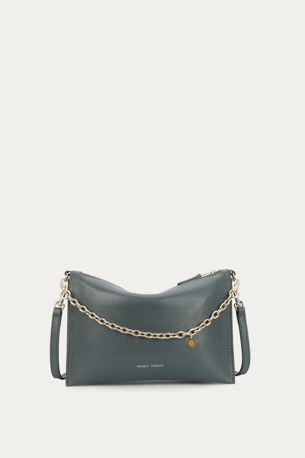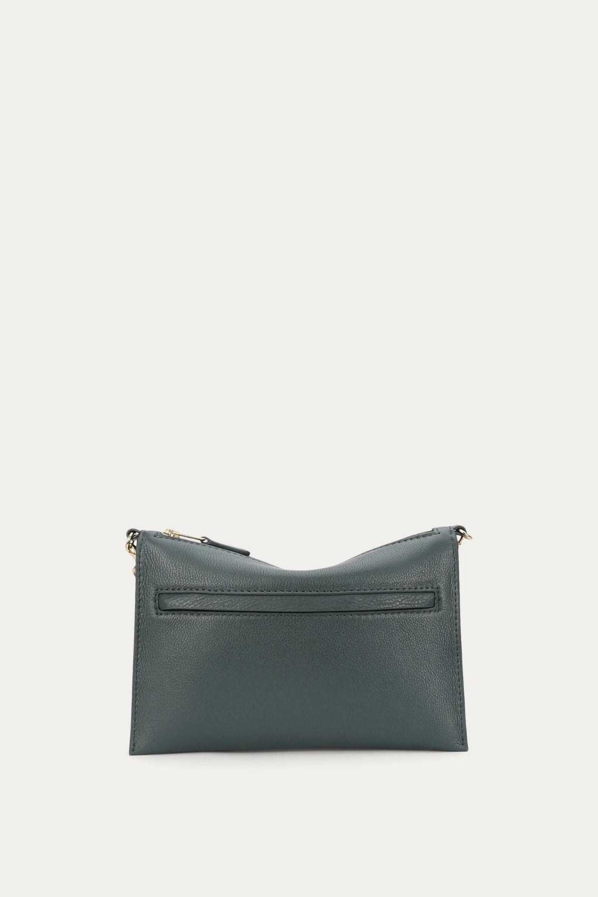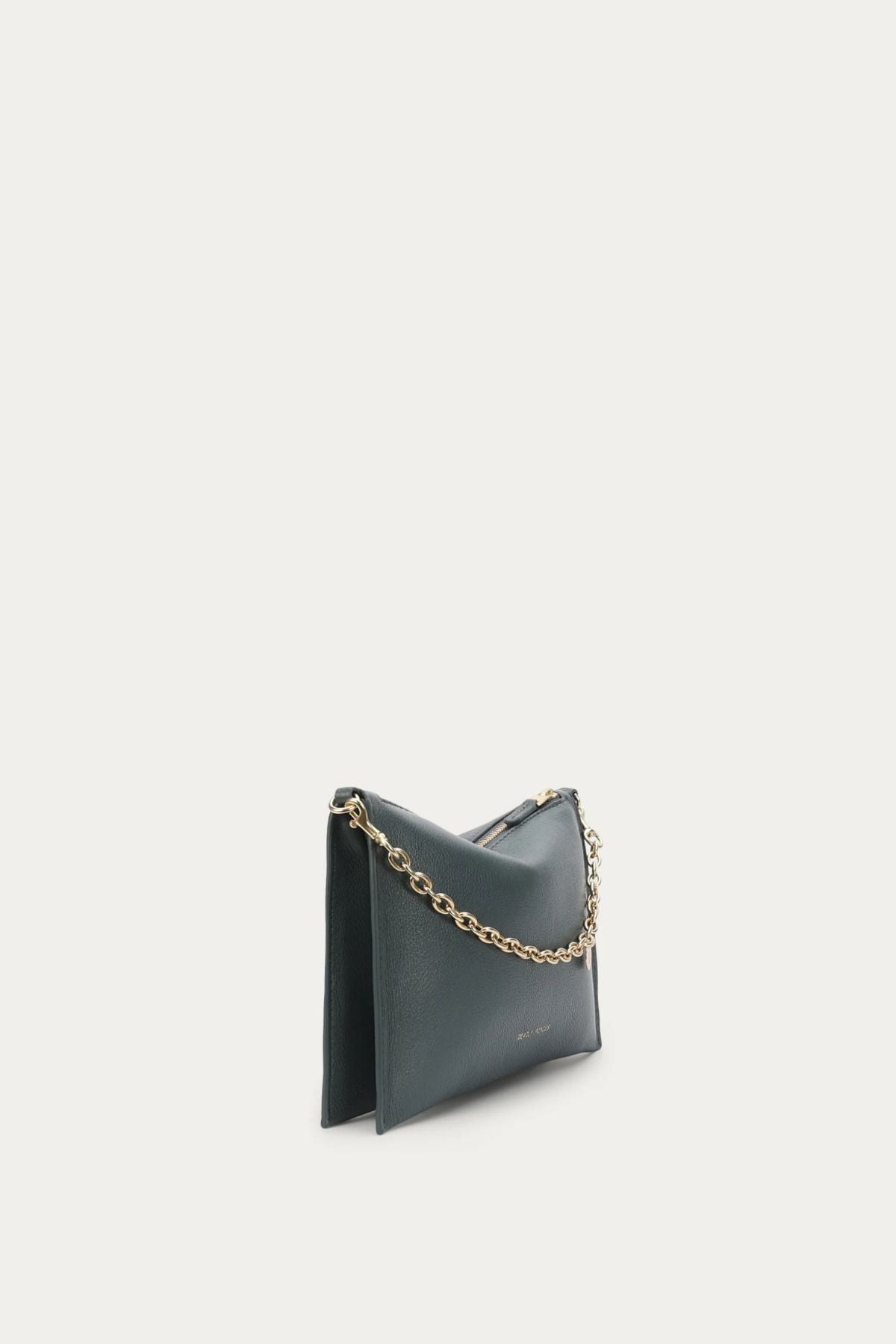 Finished with a detachable solid brass chain and an adjustable leather strap, it transitions easily from clutch to shoulder or crossbody wear. The brass hardware adds a warm contrast against the deep green leather, while the gold foil logo embossment on the front keeps the finish subtle and elevated. A zip closure opens to a compact interior with an internal slip pocket and external back zip pocket, giving you just enough organisation for your everyday essentials.