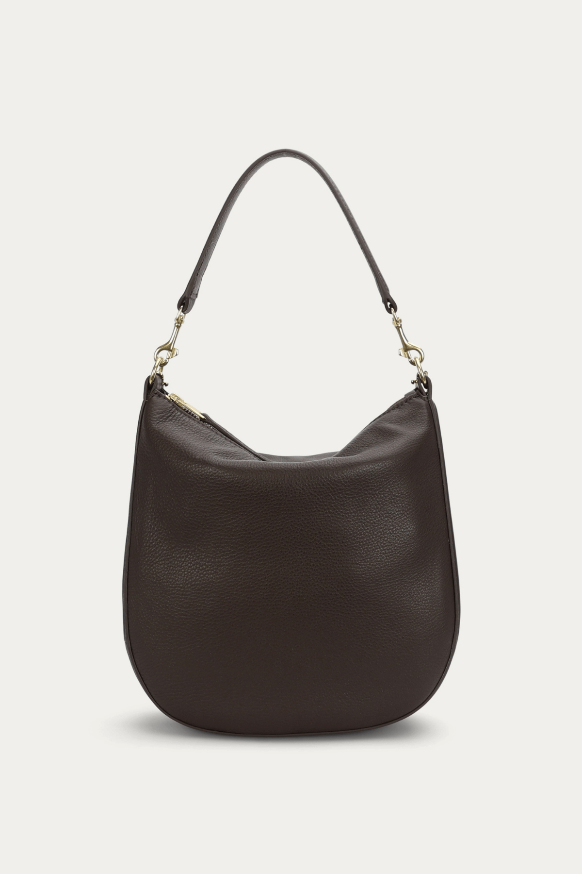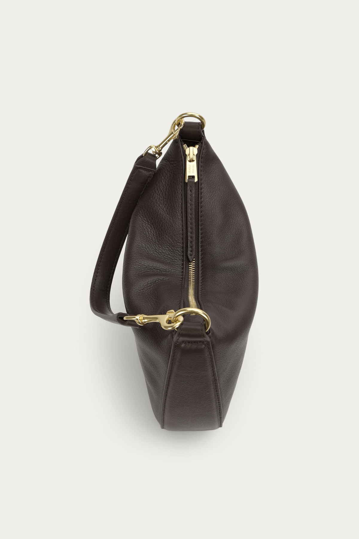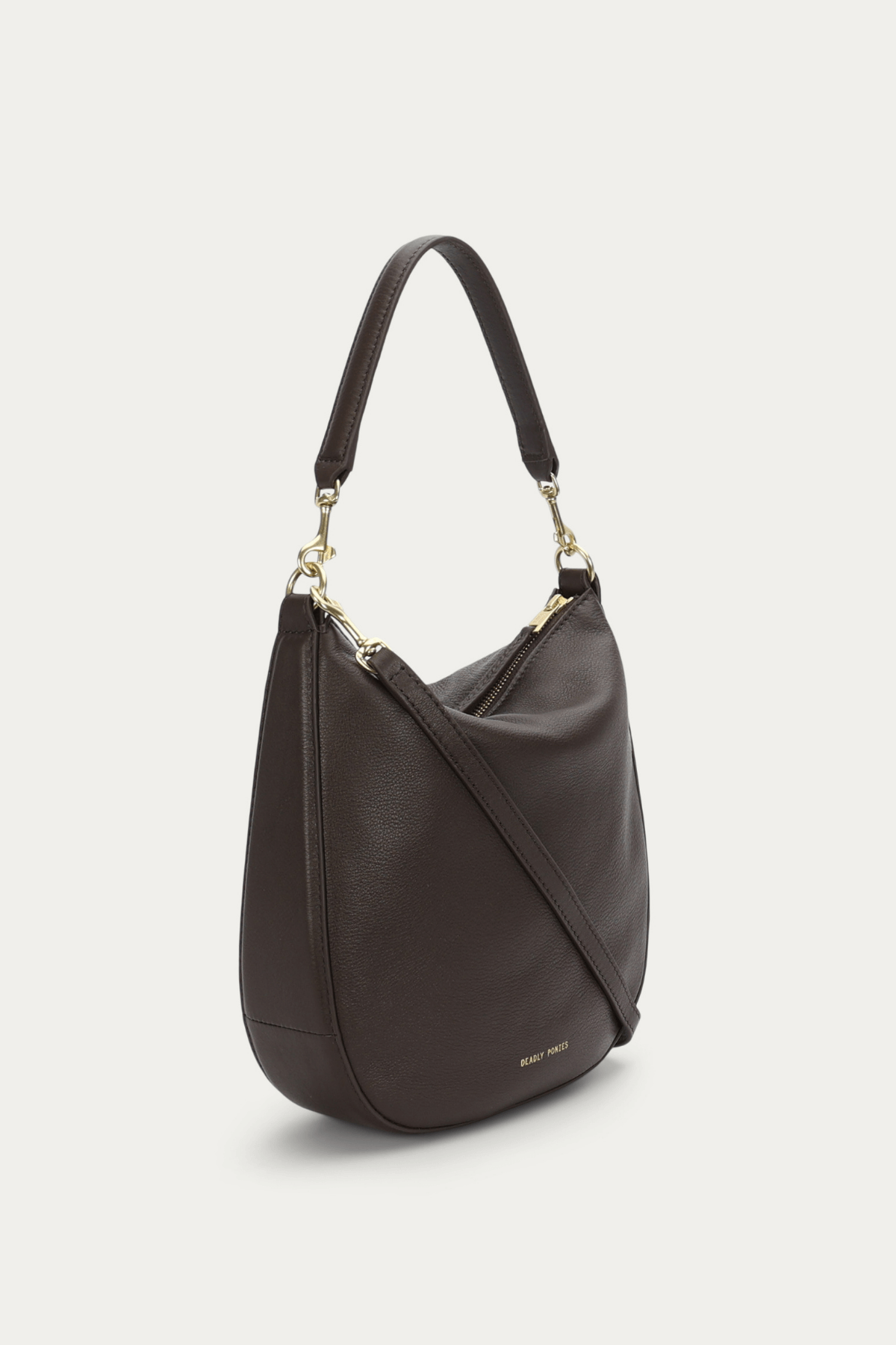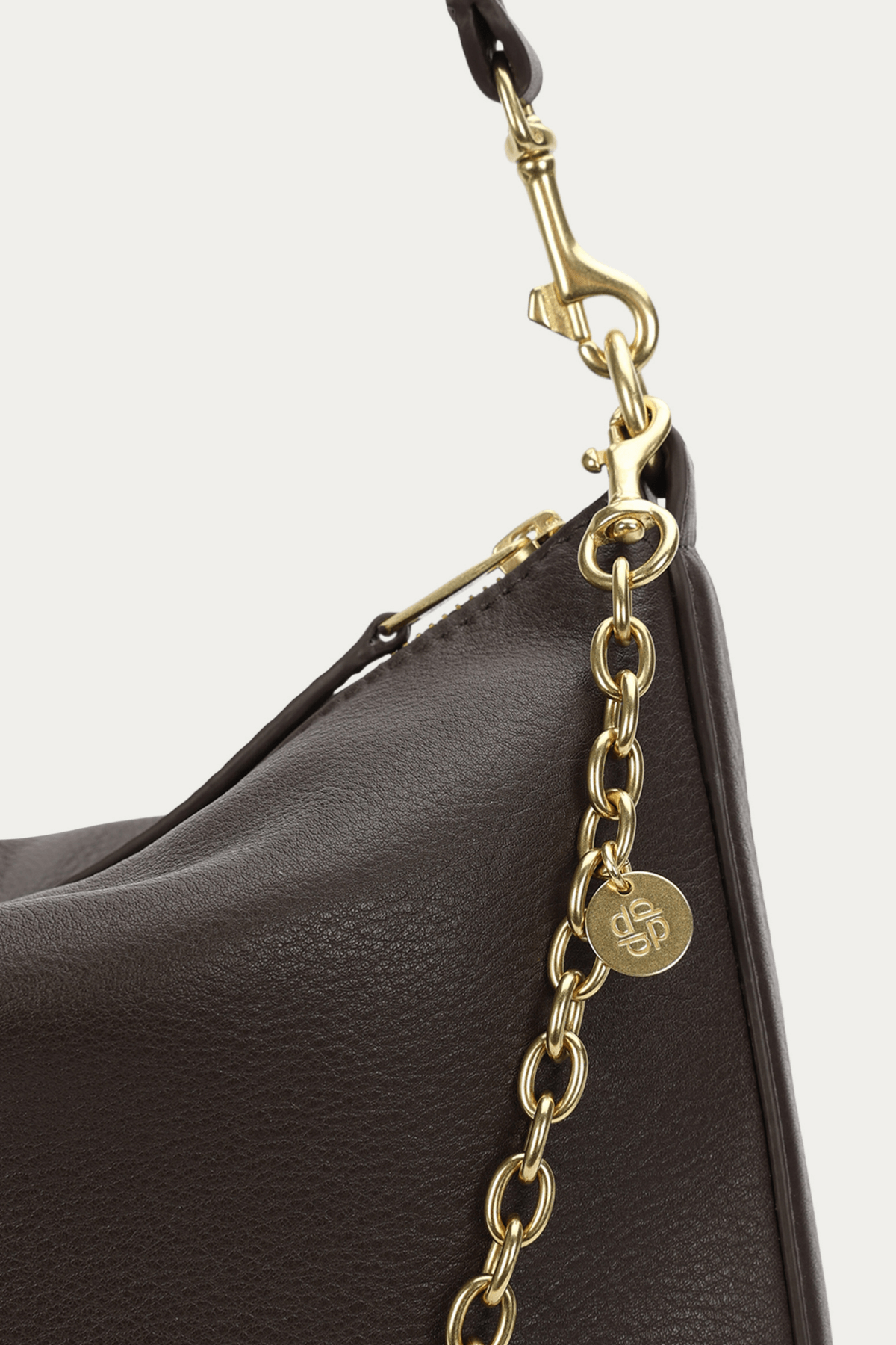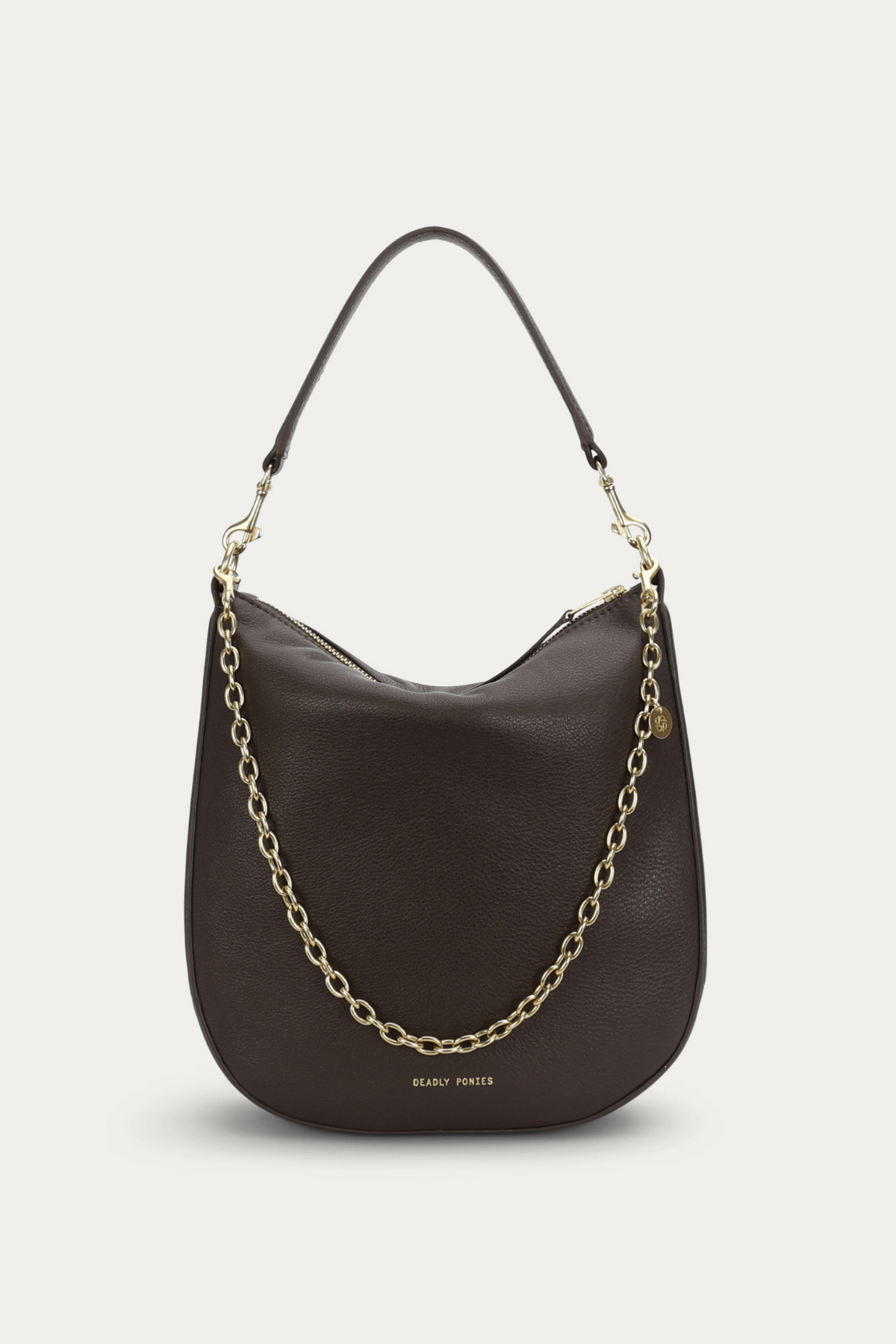 The Mr Sling in Java by Deadly Ponies is a versatile crossbody bag in buttery Calf Nappa, featuring soft folds, exposed gusset seams, a detachable brass chain, top handle, and zip-secured internal pockets. A timeless everyday companion for day-to-night wear.