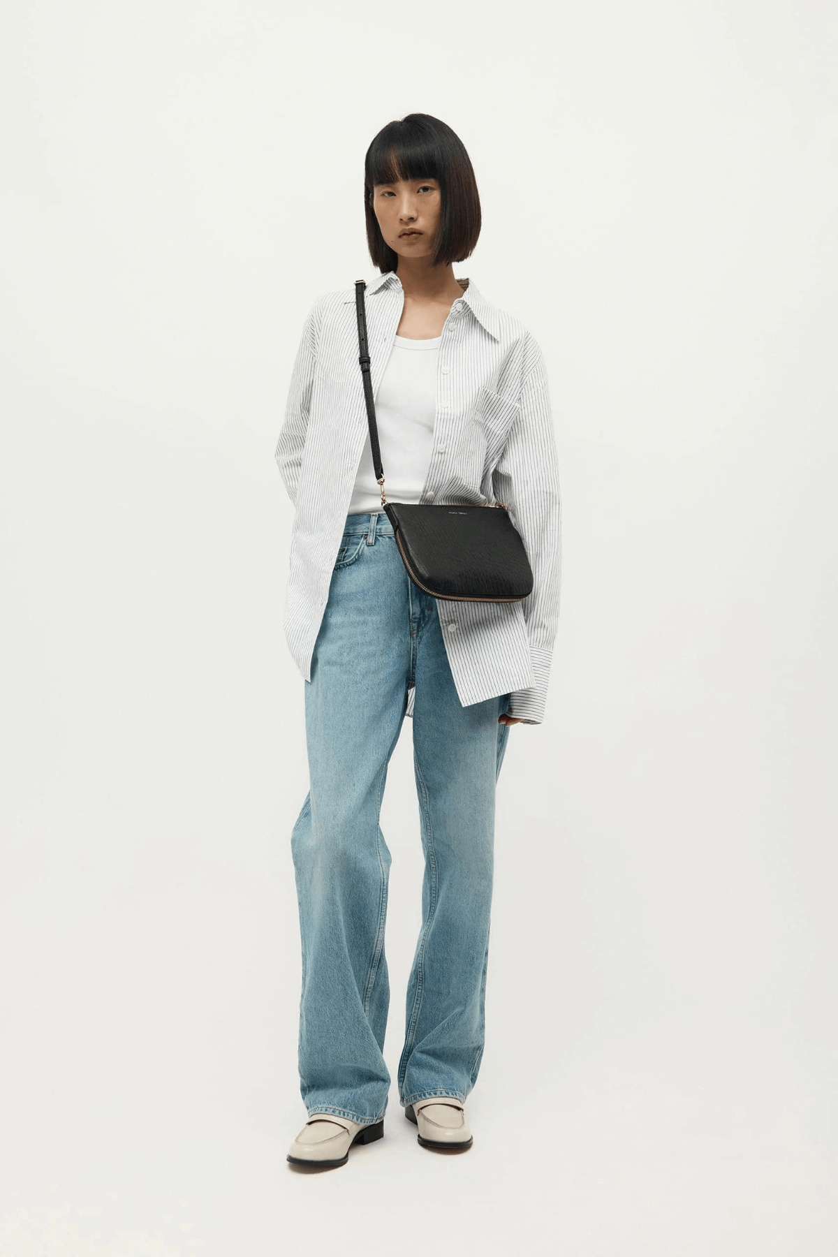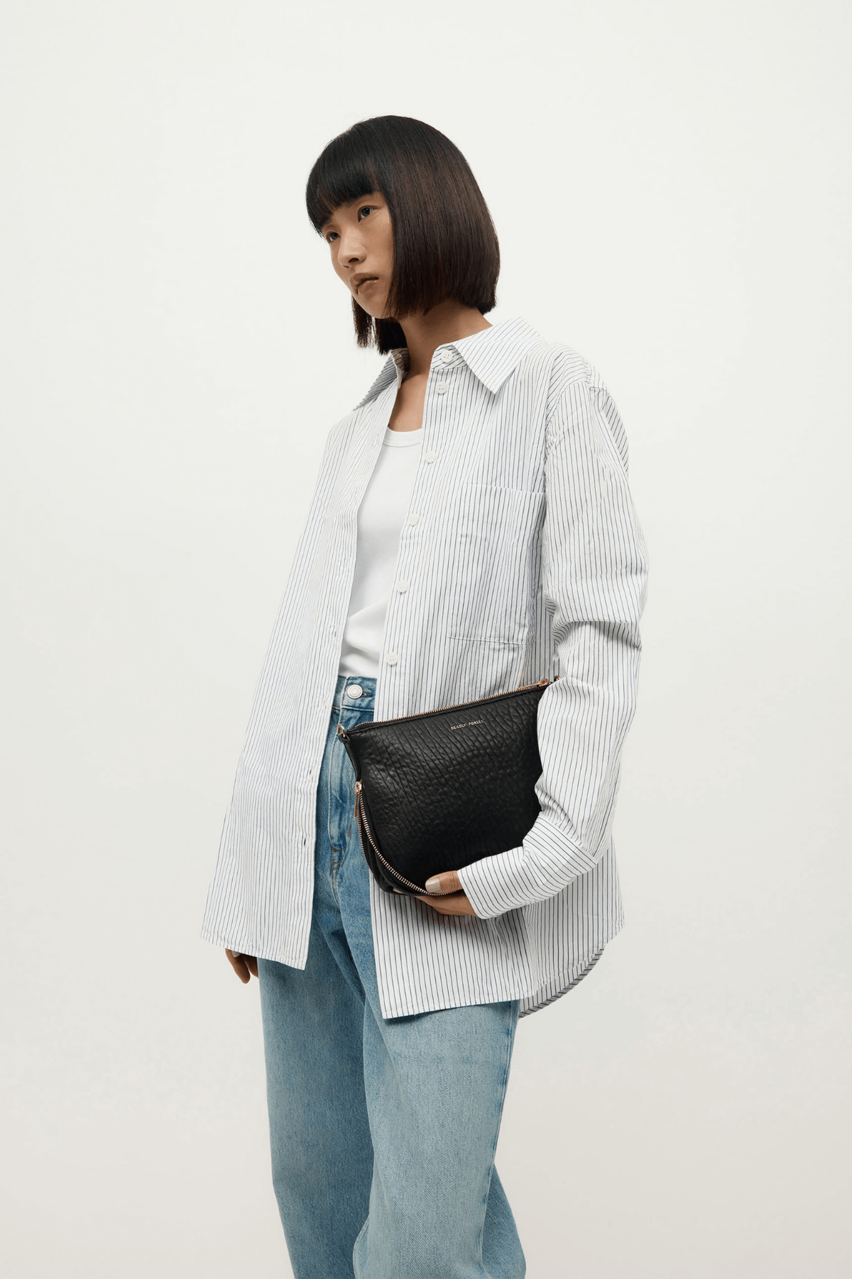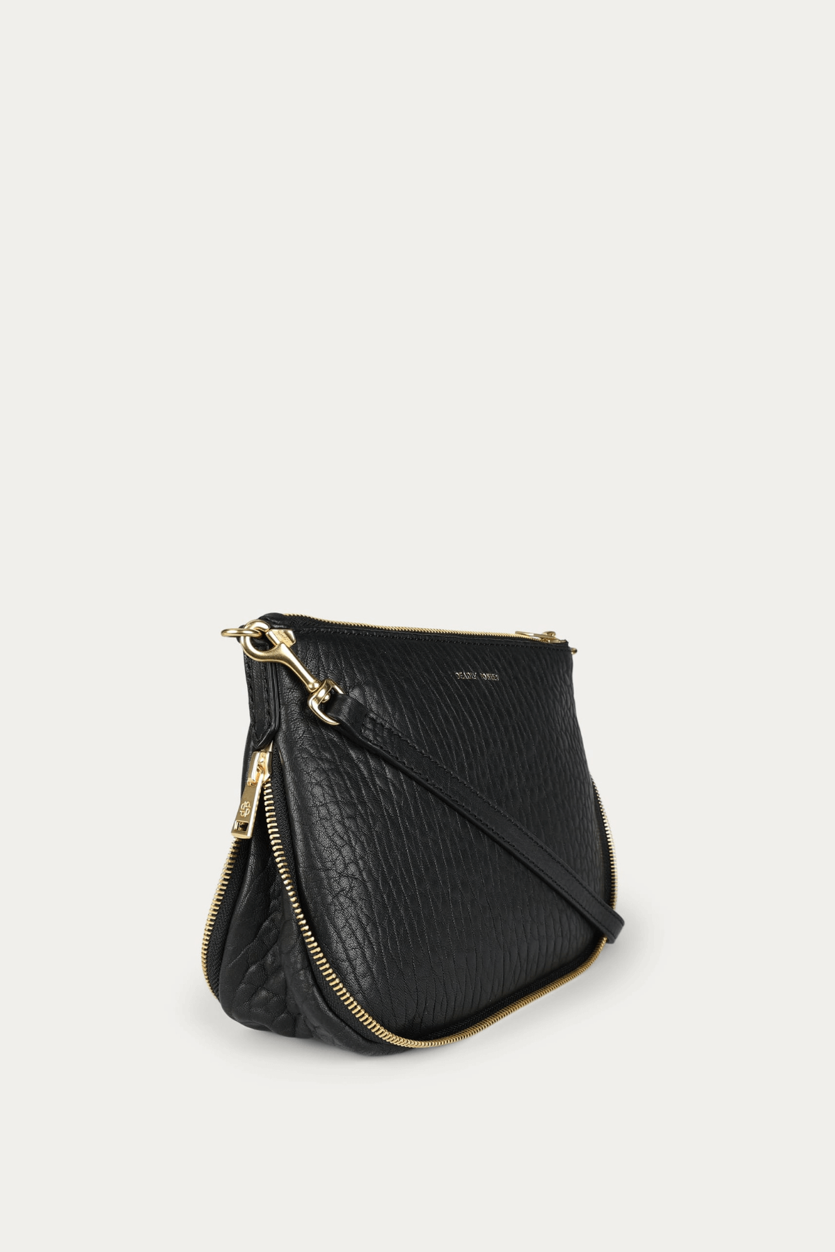 Mr Gator in Black from Deadly Ponies stands out with its distinctive texture, meticulously crafted from Deadly Ponies signature Bulle Lamb Nappa leather, known for its bubble-like texture, and complemented by sleek satin-finish brass hardware. Versatile in design, this piece can be worn crossbody or used as a clutch, thanks to its adjustable and detachable shoulder strap. The zipped gusset provides the option for a streamlined appearance or expanded capacity.