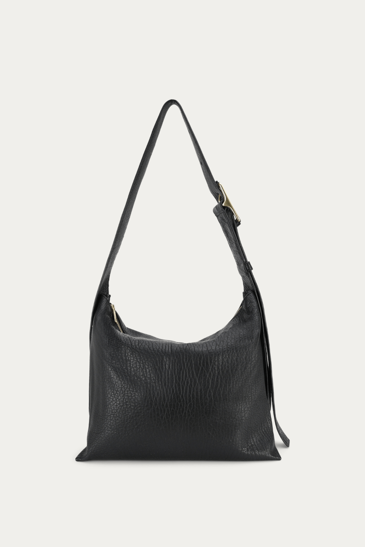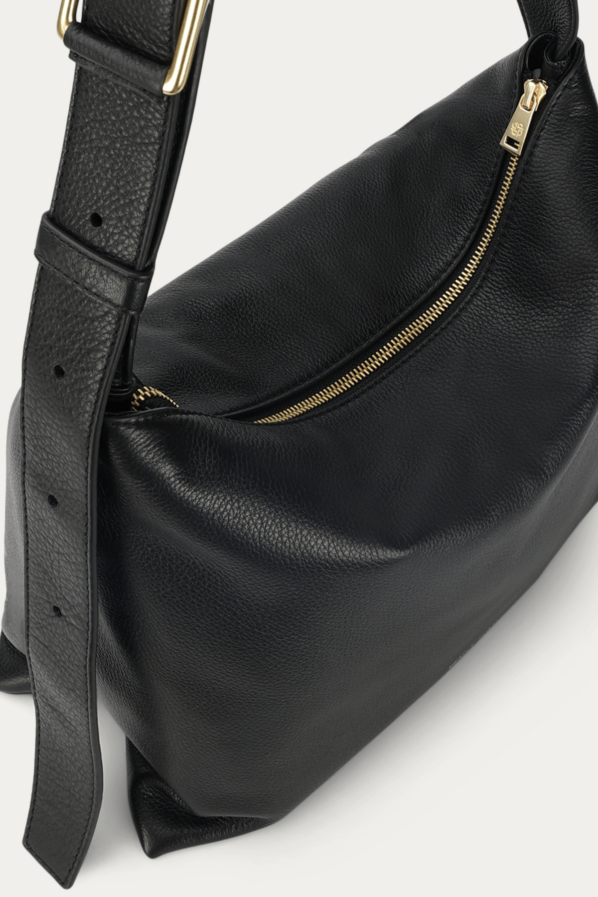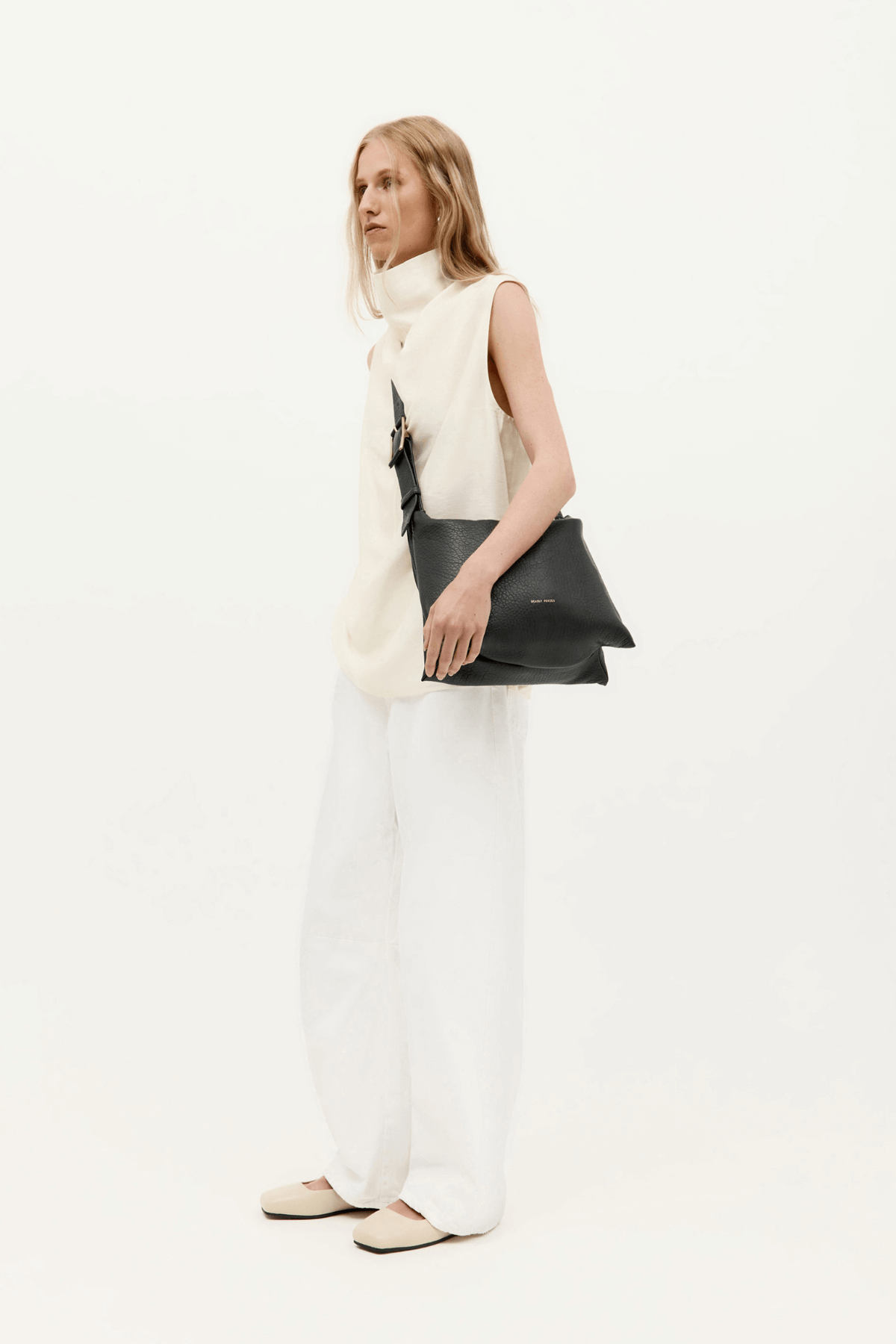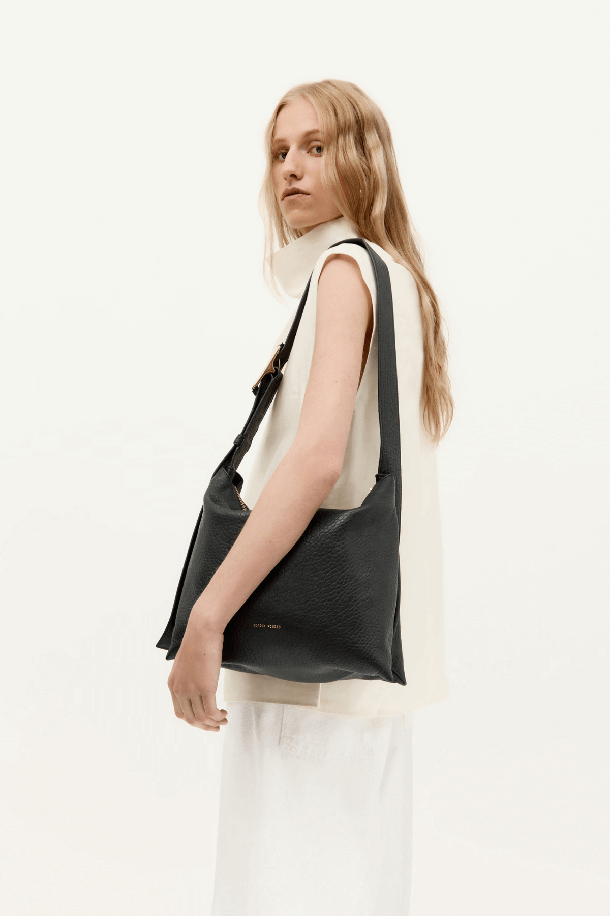 Mr Midimese in Black is a slouchy leather shoulder bag crafted from soft Calf Nappa, with zip closure, brass buckle strap, and smart internal compartments. Made from buttery Calf Nappa in classic black, it balances relaxed form with refined detail—think gloss brass hardware, concealed O-ring, and practical inner compartments. A staple piece, season after season.