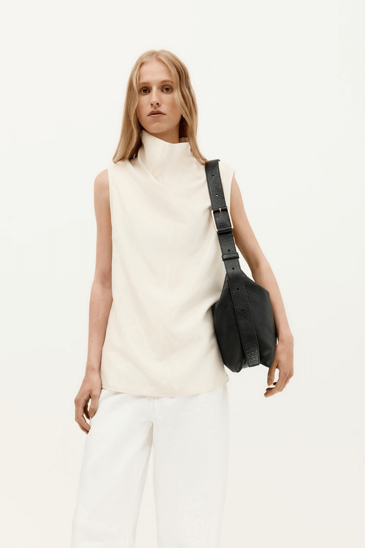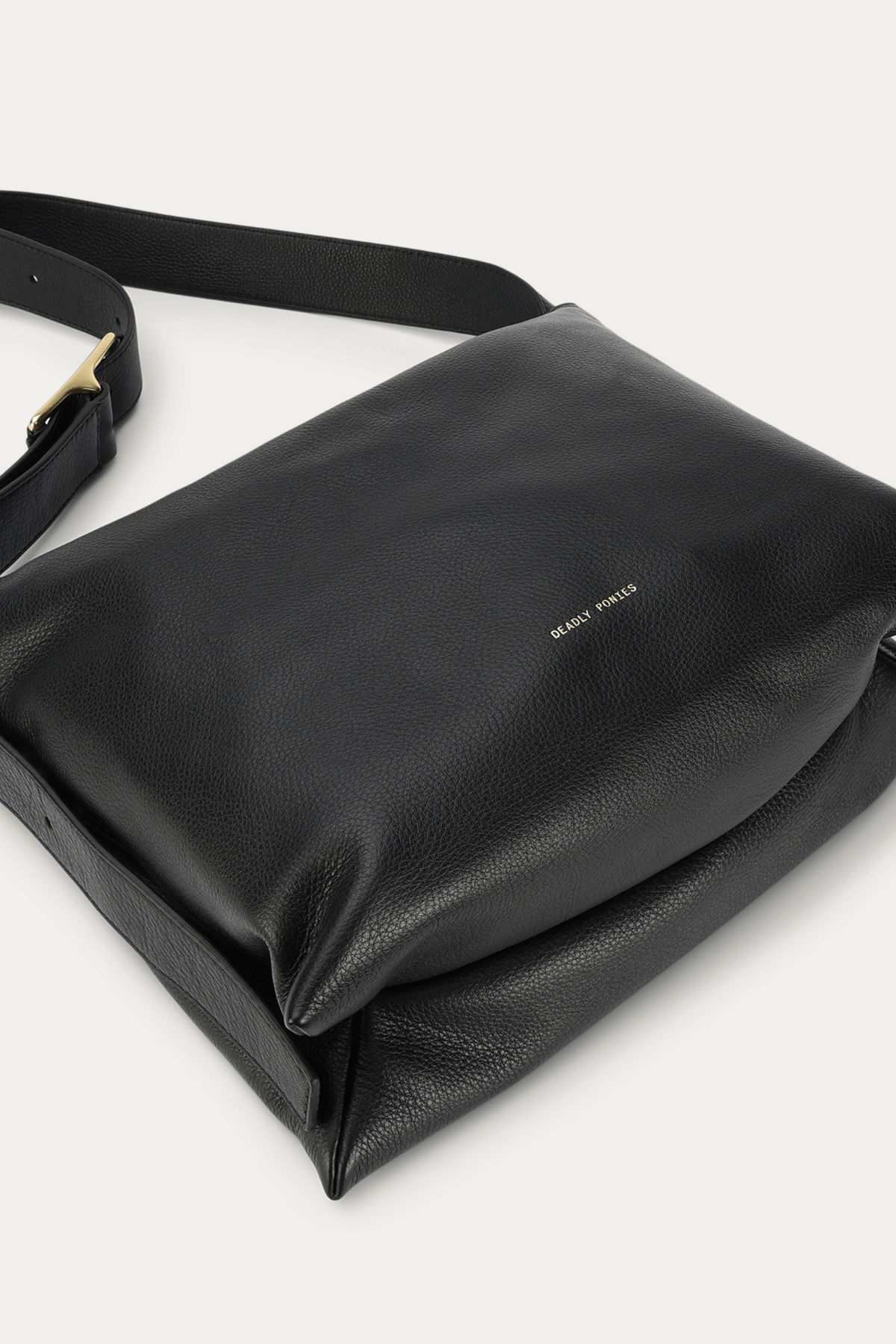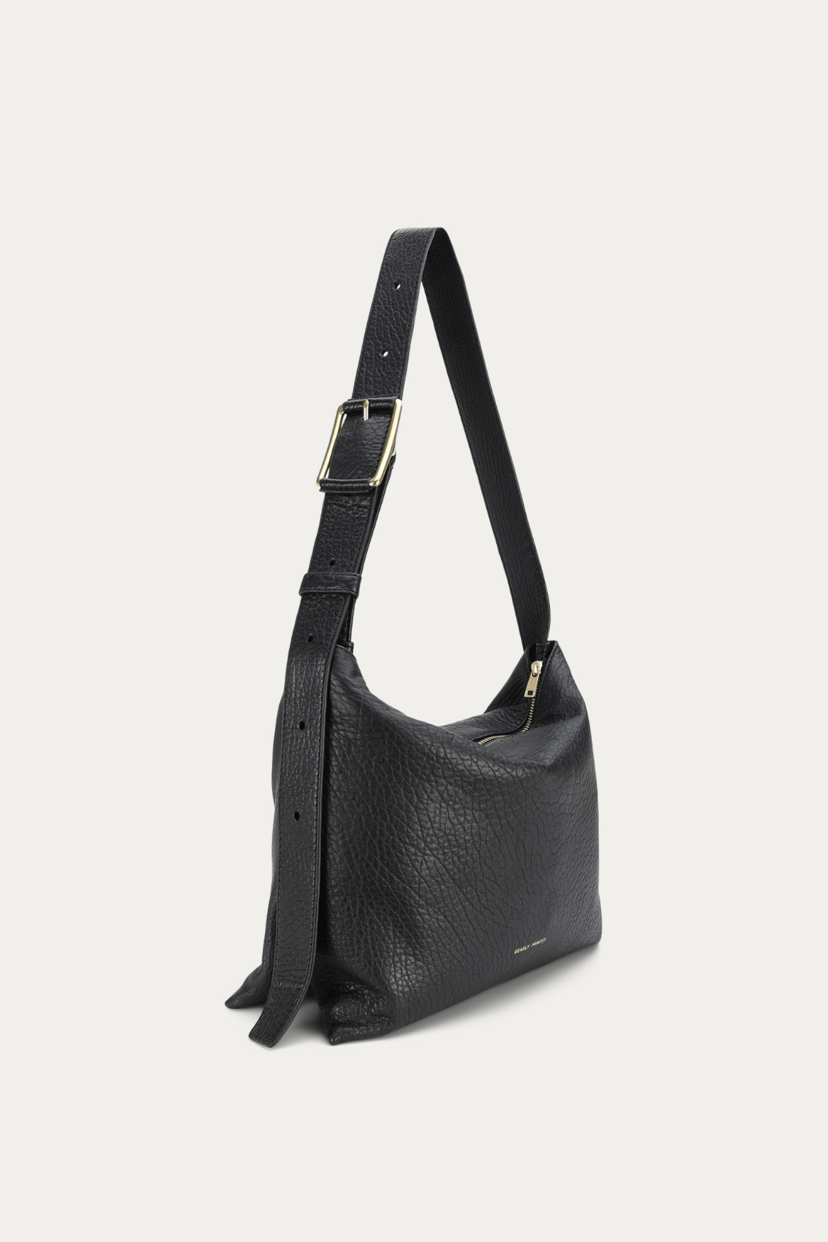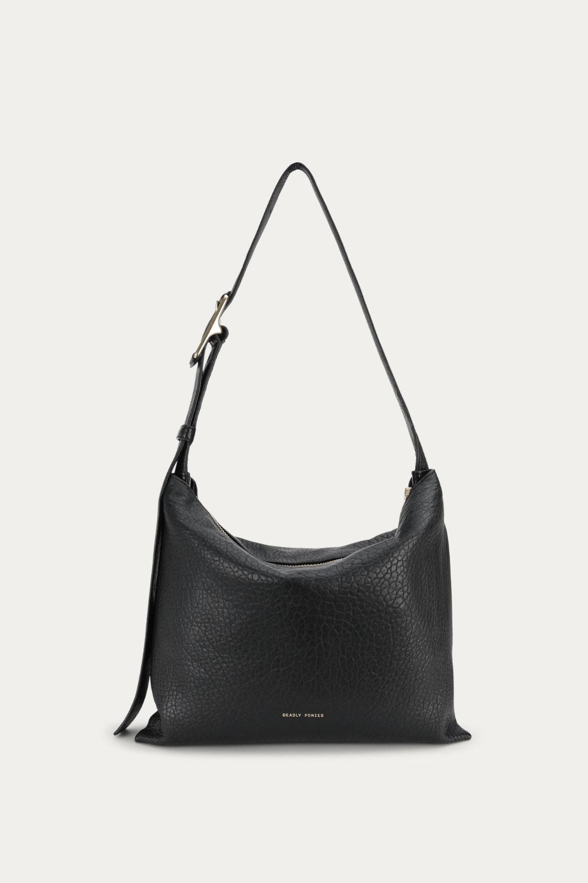 Mr Midimese in Black is a slouchy leather shoulder bag crafted from soft Calf Nappa, with zip closure, brass buckle strap, and smart internal compartments. Made from buttery Calf Nappa in classic black, it balances relaxed form with refined detail—think gloss brass hardware, concealed O-ring, and practical inner compartments. A staple piece, season after season.