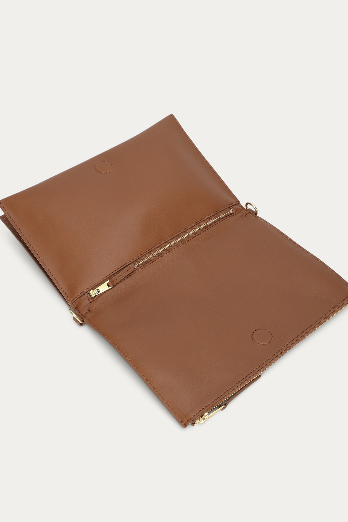 Zip closure at top flap edge and underneath flap.