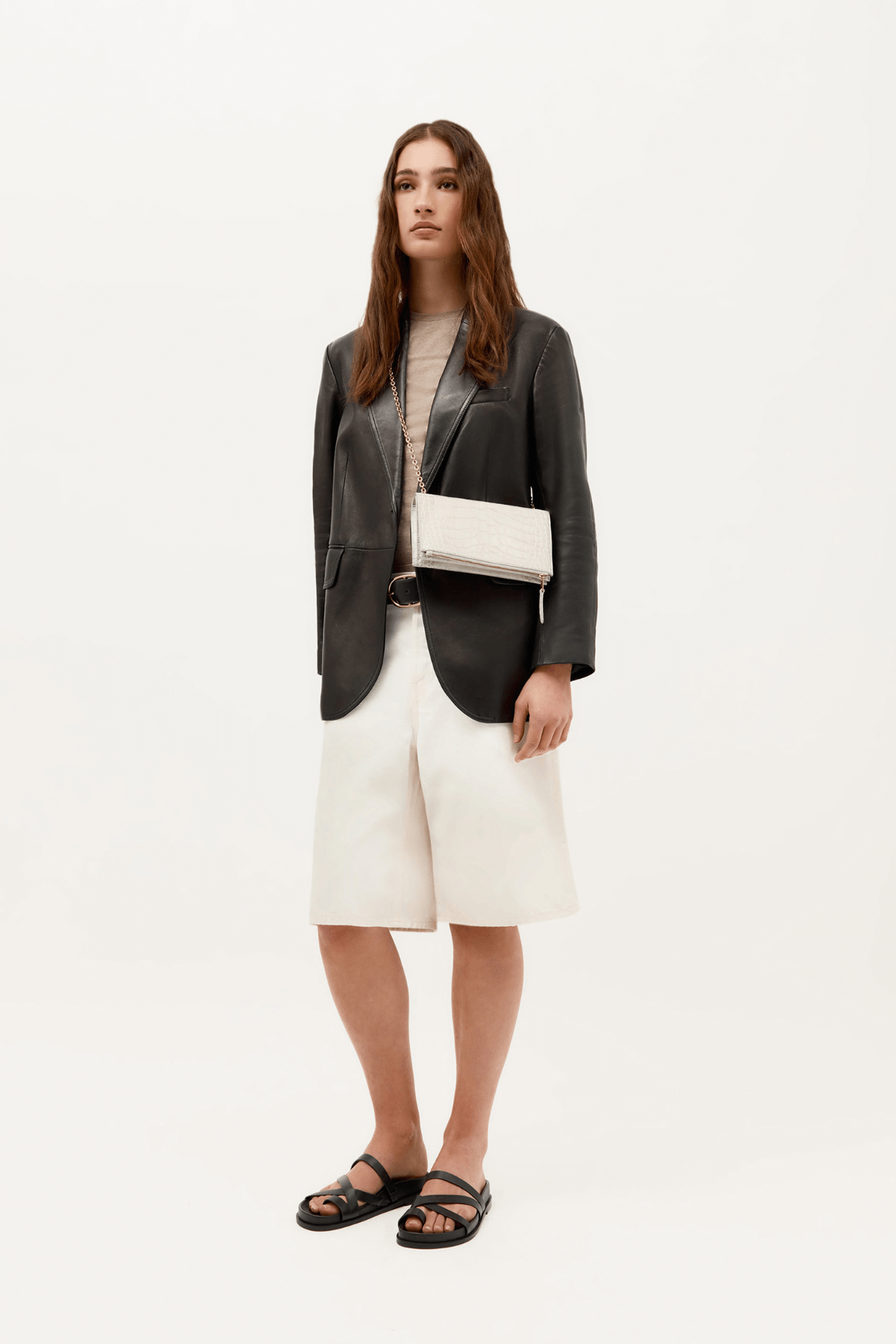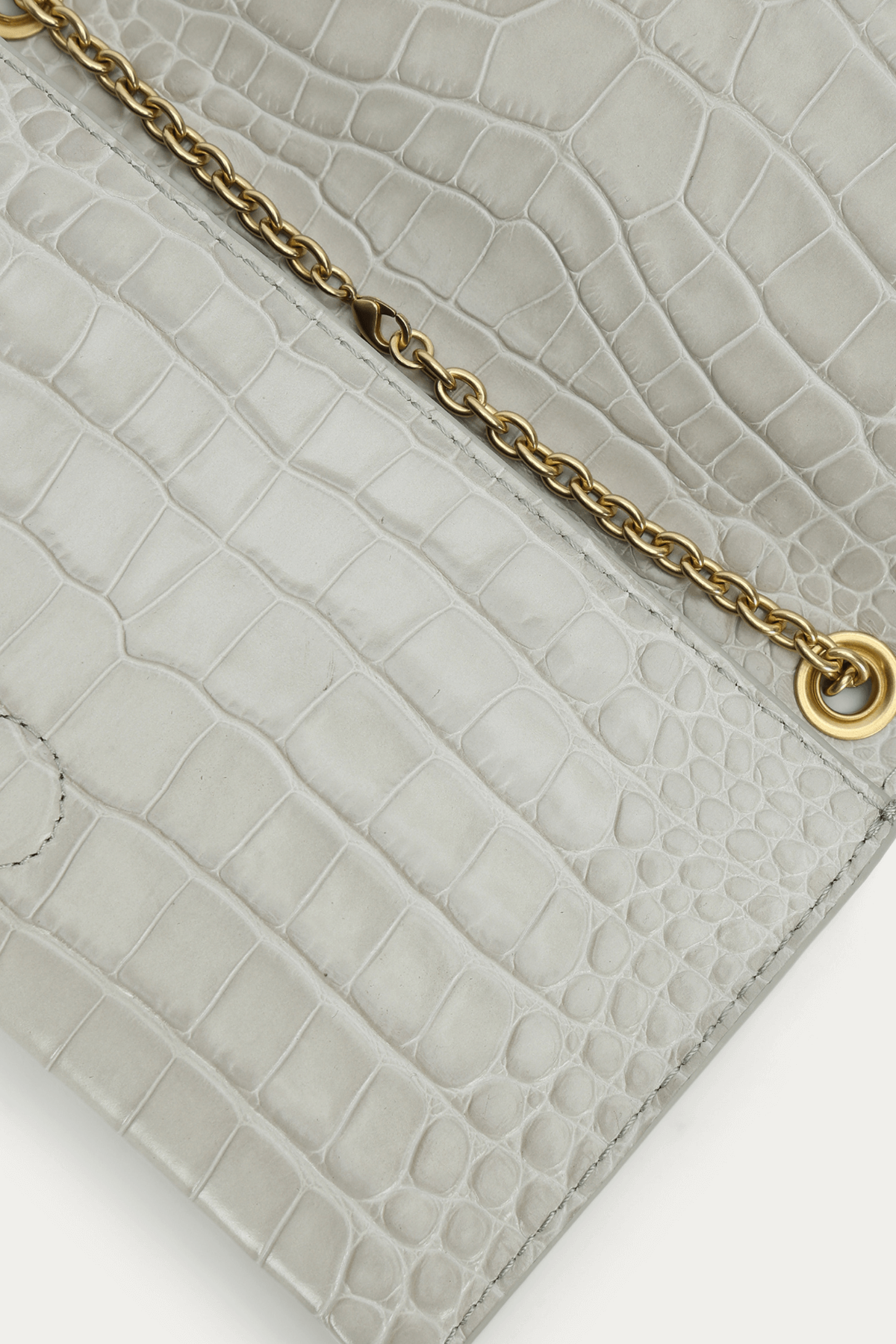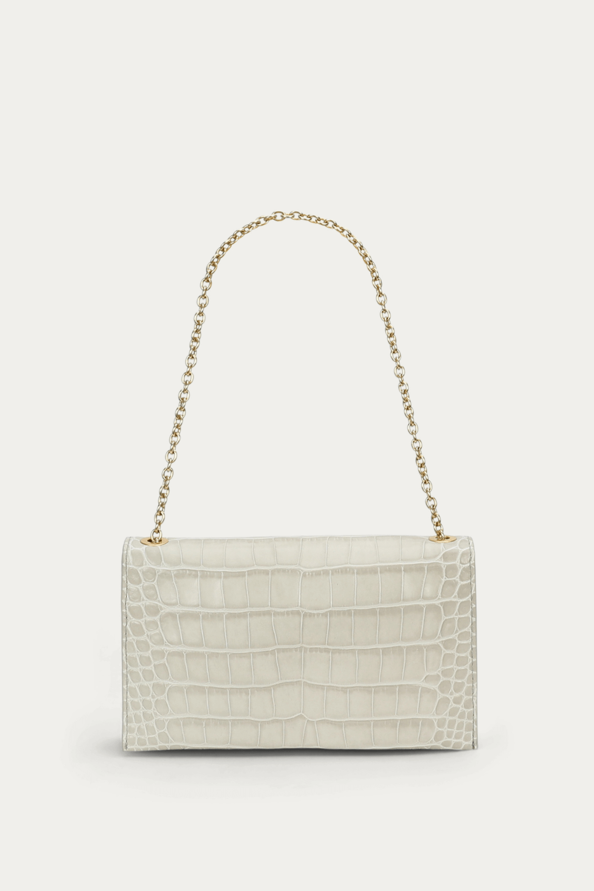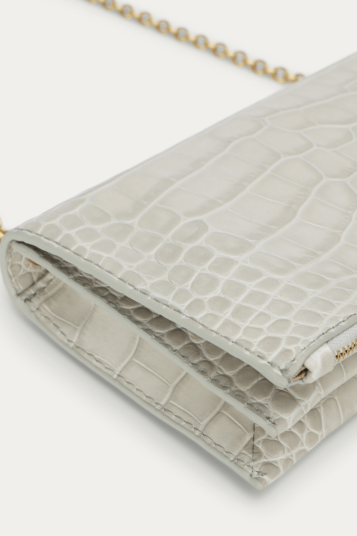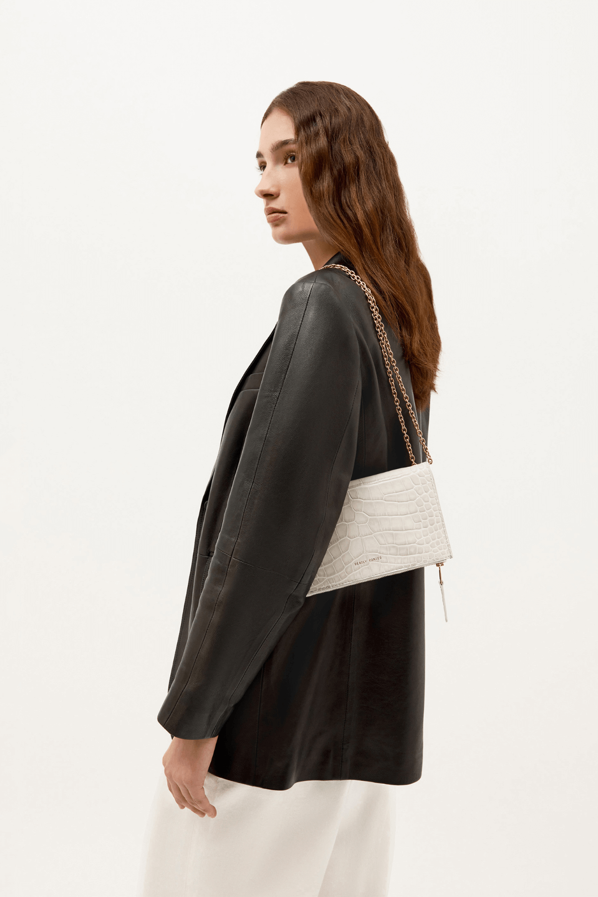 The Mr Komodo Mini by Deadly Ponies is a chic Kina Croc-embossed Calf Leather bag. With a magnetic flap, zip closure, and detachable chain strap, it offers versatile styling for day or night. Internal compartments and a gold foil logo complete the luxe, versatile design.