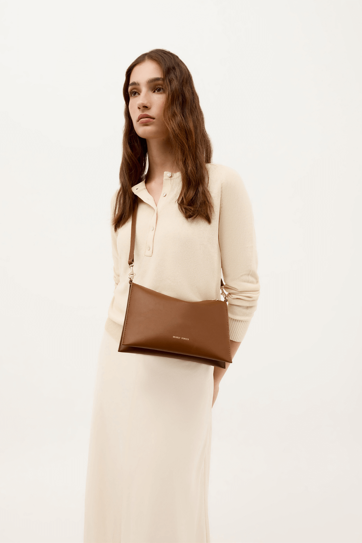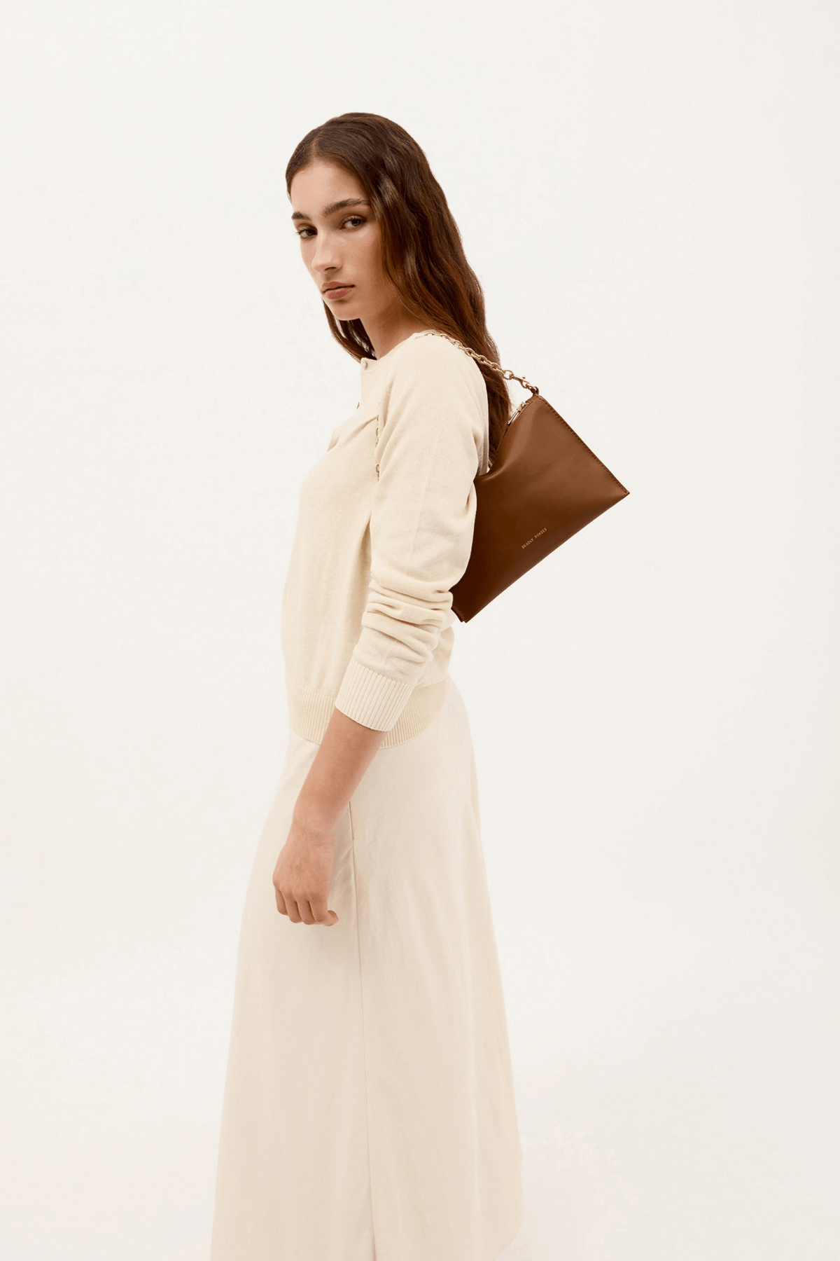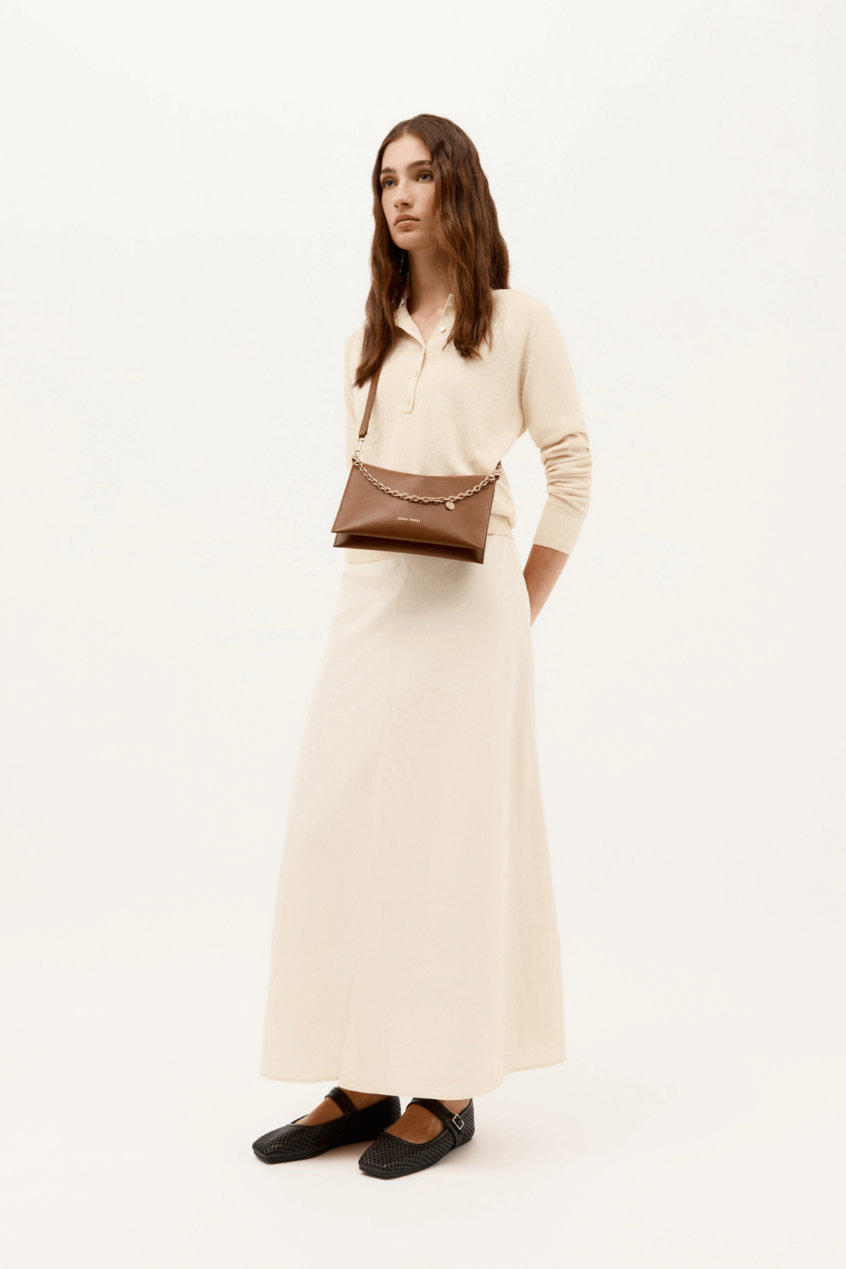 Crafted from smooth Ironed Calf Nappa, the Mr Minimese in Driftwood features a refined folded design, dual gussets, and a brass chain for versatile crossbody or shoulder styling. Keeps essentials close for day-to-night wear.