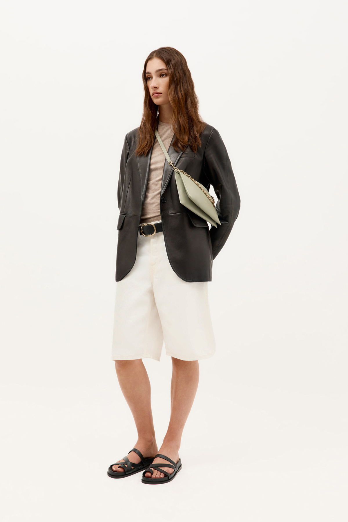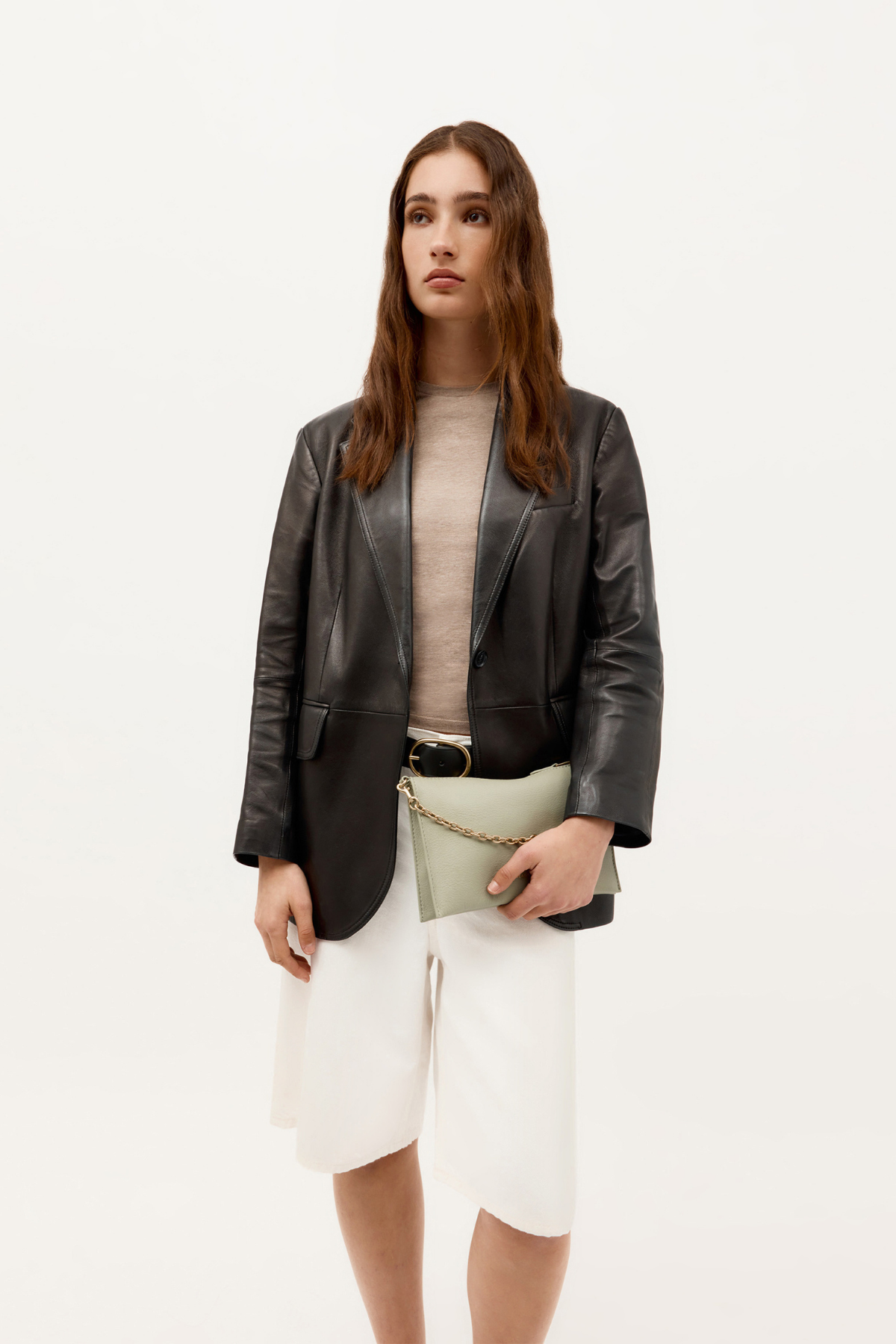 • Straps: Detachable brass chain handle and adjustable leather strap