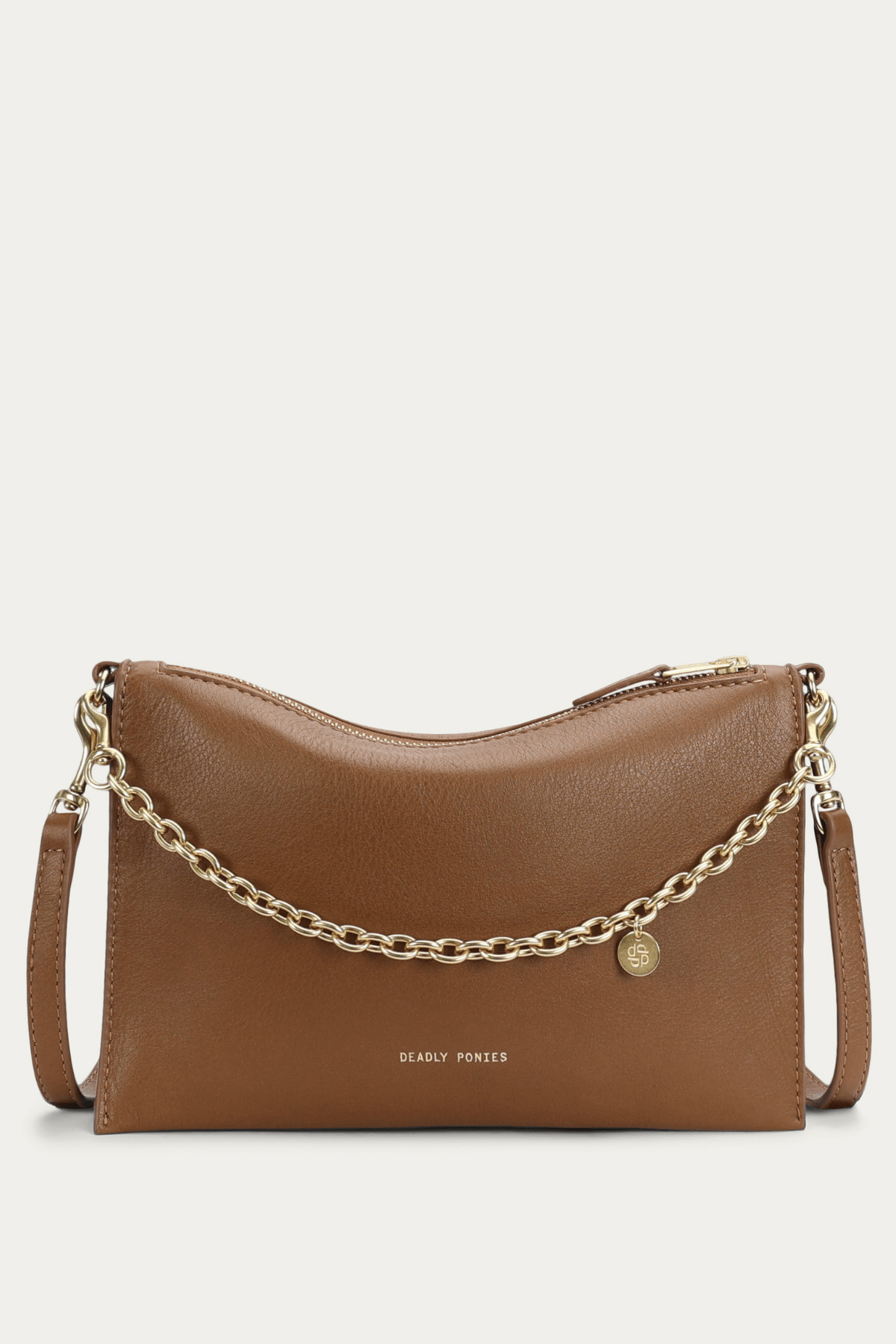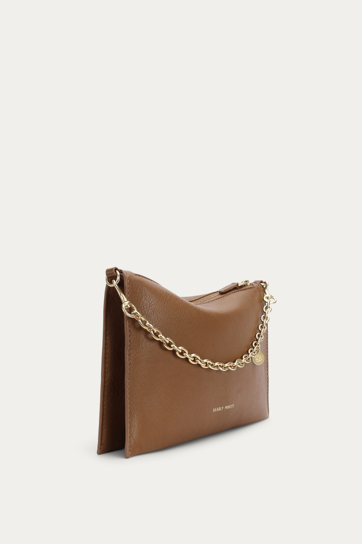 The Mr Siamese in Toffee by Deadly Ponies blends minimalist elegance with functionality. Its streamlined silhouette is enhanced by a detachable brass chain and adjustable strap, letting you wear it as a clutch, shoulder bag, or crossbody. Internal and external pockets keep essentials organised, perfect for modern, on-the-go styling.