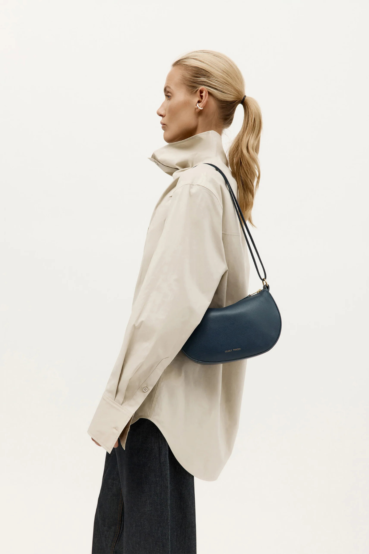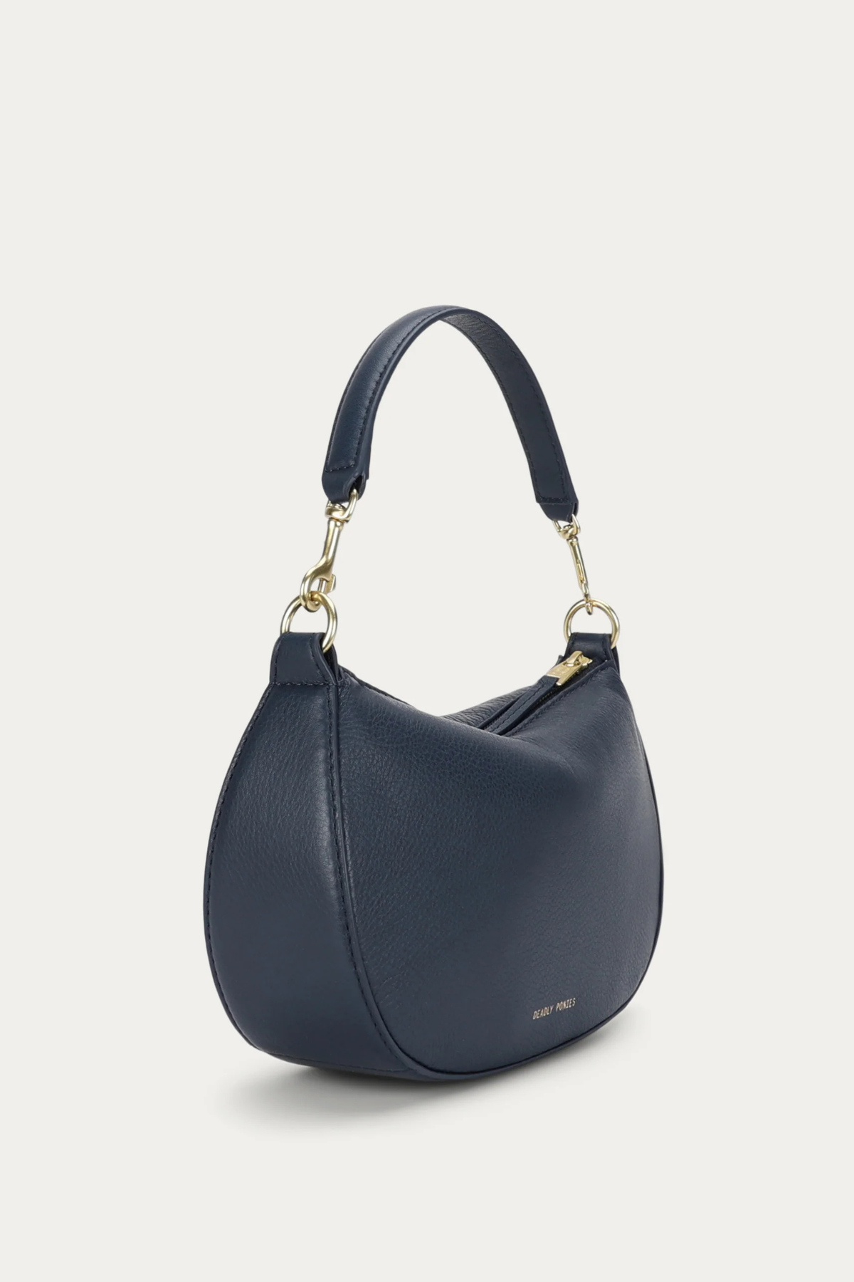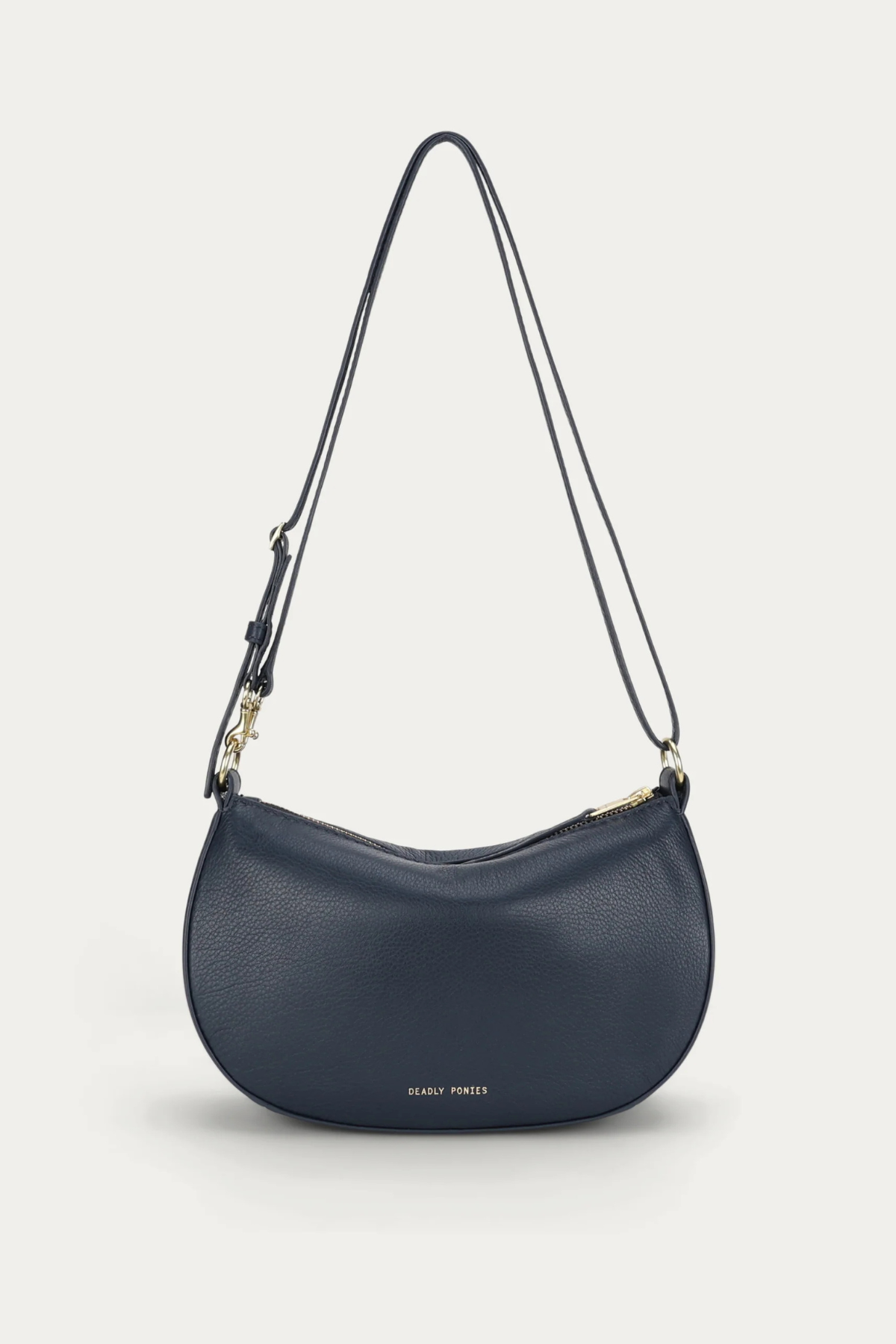 The Mr Sling Micro bag in Ink by Deadly Ponies is a petite, versatile Calf Nappa design with internal slip and zip pockets. Detachable top handle and adjustable strap allow shoulder or crossbody wear. The gold foil logo embossment adds a subtle signature detail.