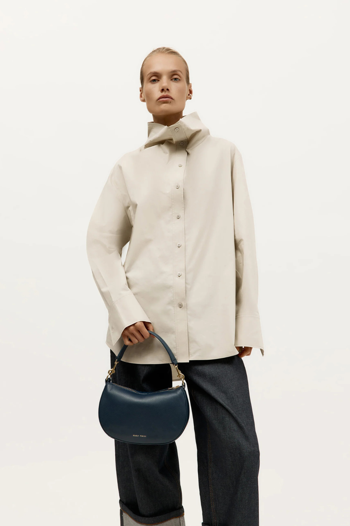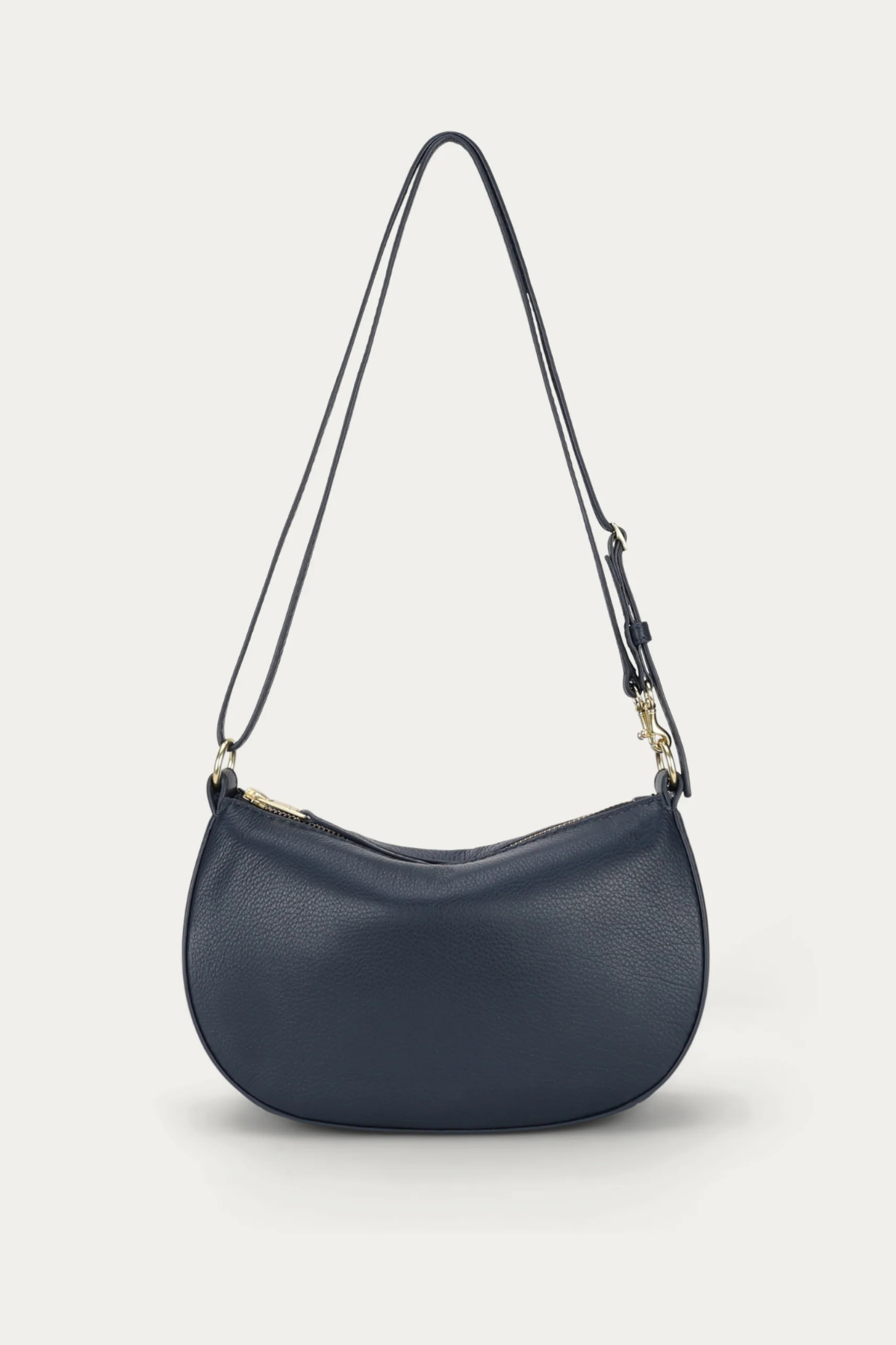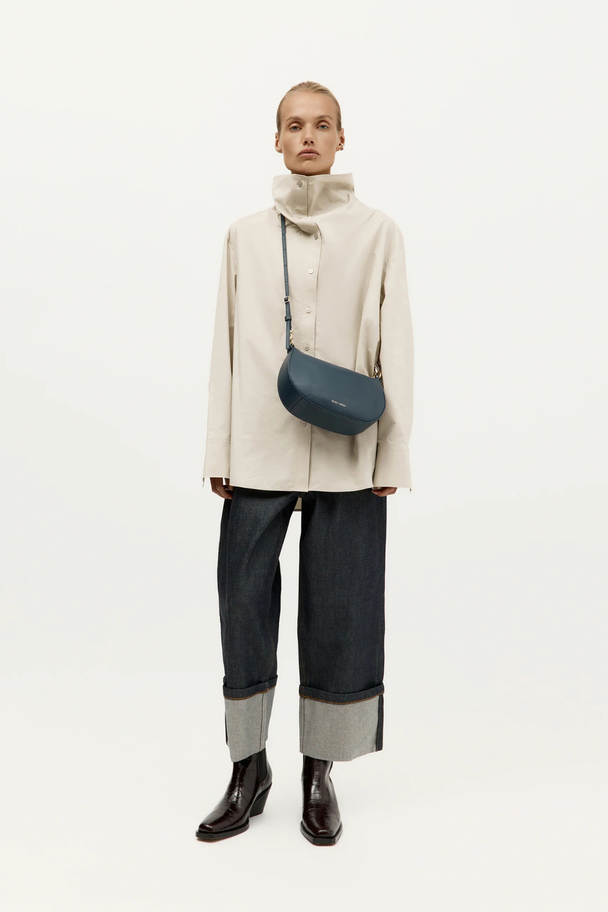 The Mr Sling Micro bag in Ink by Deadly Ponies is a petite, versatile Calf Nappa design with internal slip and zip pockets. Detachable top handle and adjustable strap allow shoulder or crossbody wear. The gold foil logo embossment adds a subtle signature detail.