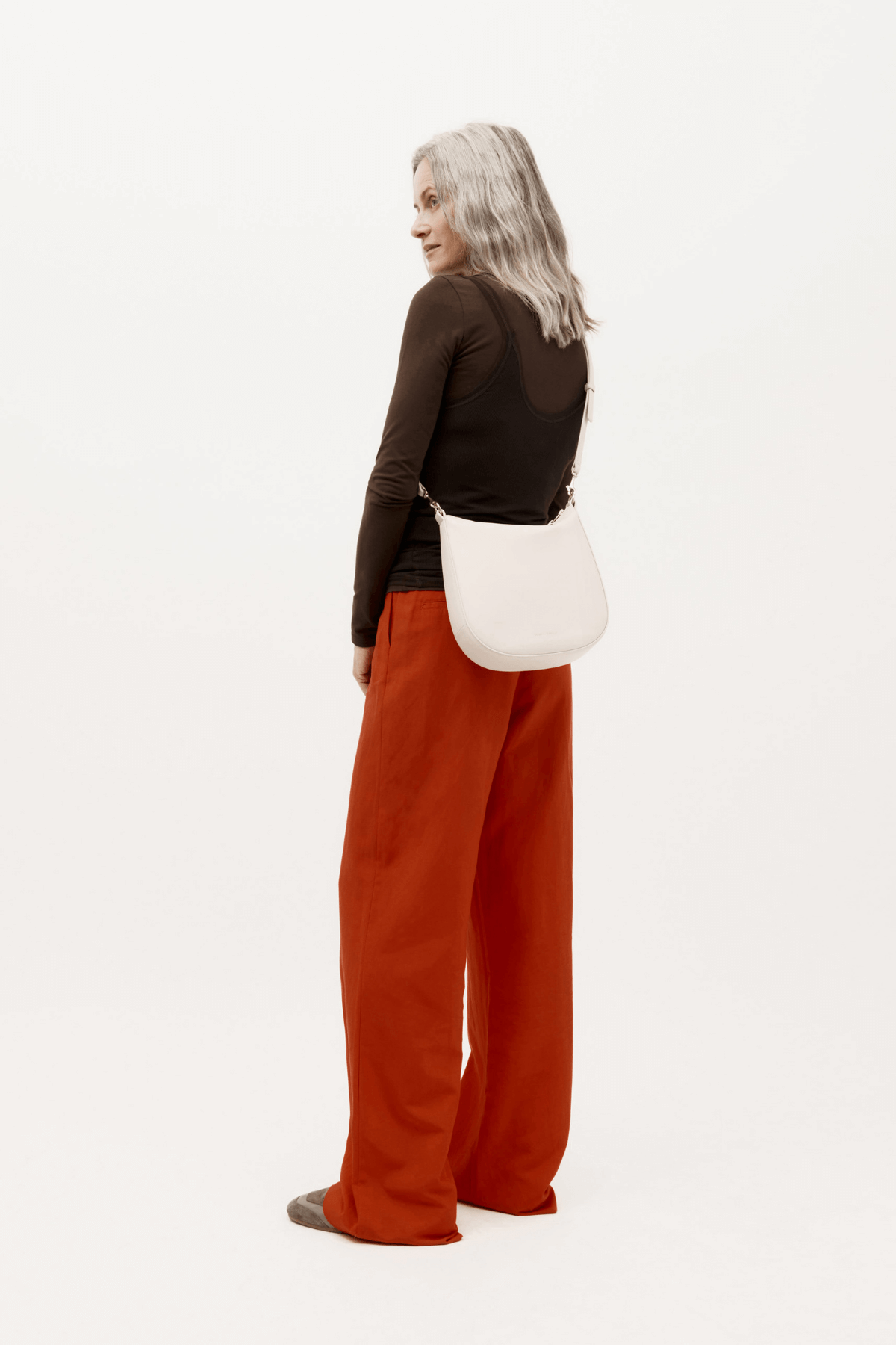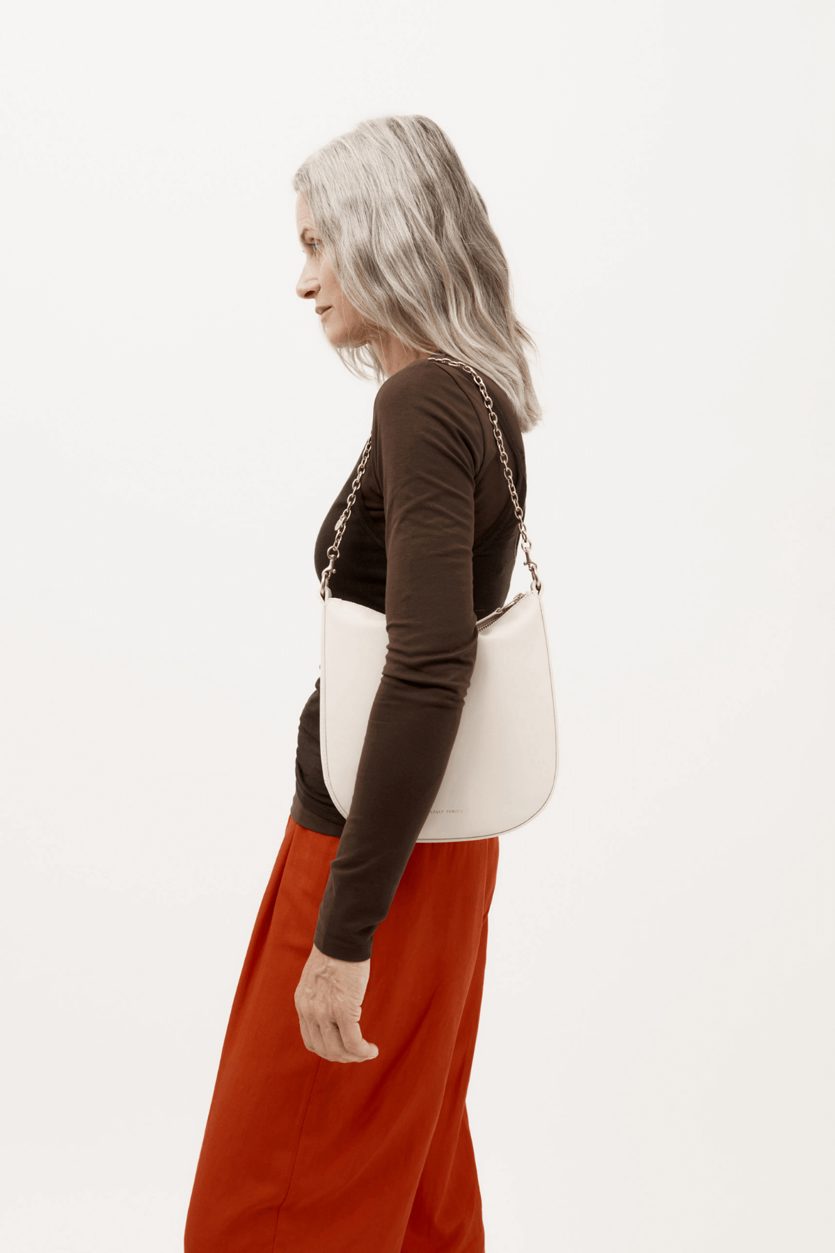 The Mr Sling in Porcelain by Deadly Ponies is a versatile crossbody bag in buttery Calf Nappa, featuring soft folds, exposed gusset seams, a detachable brass chain, top handle, and zip-secured internal pockets. A timeless everyday companion for day-to-night wear.