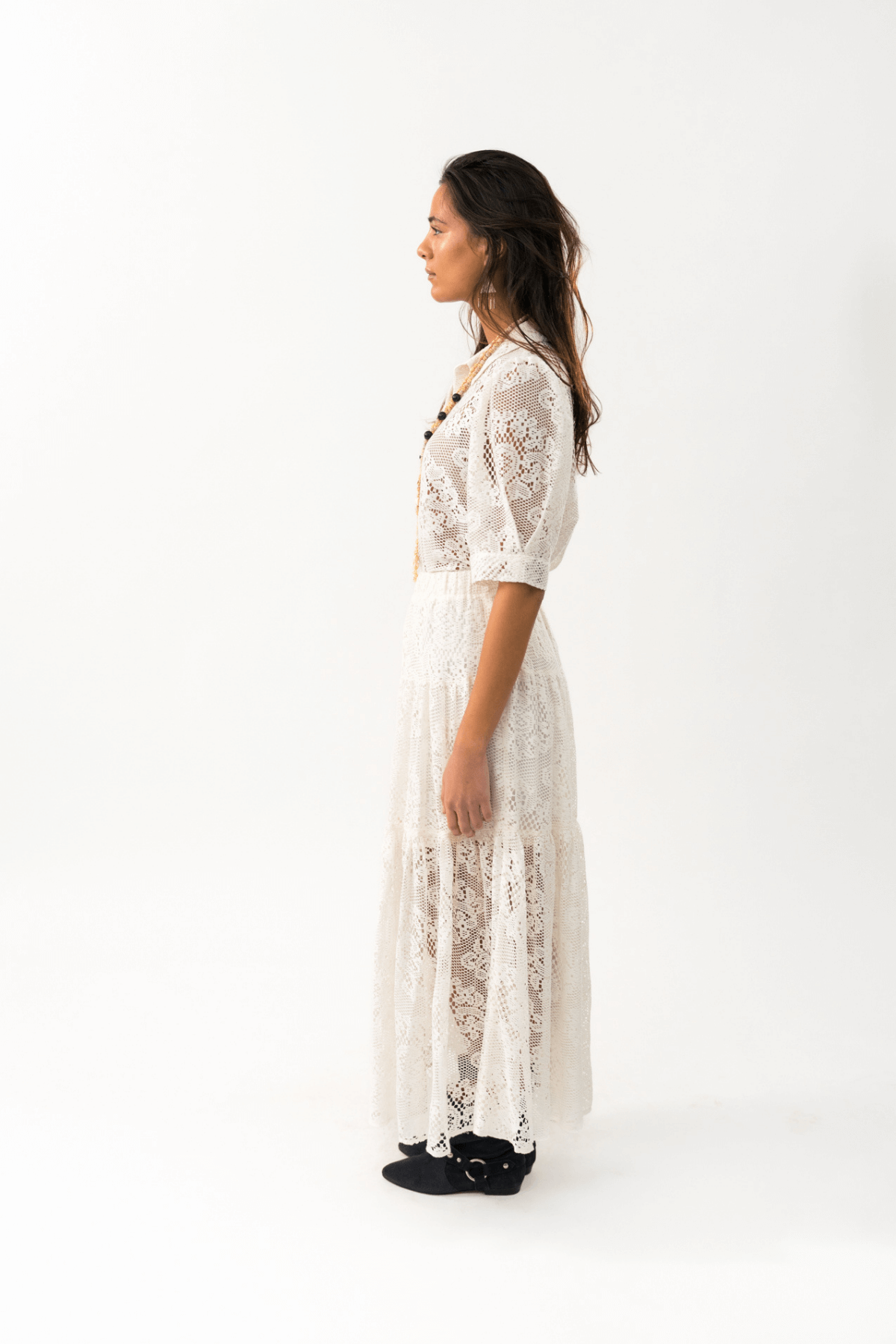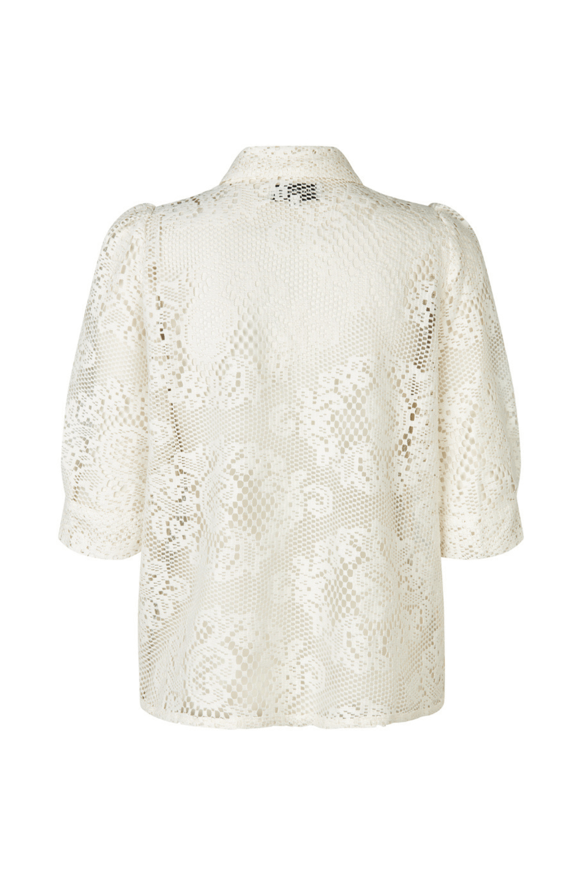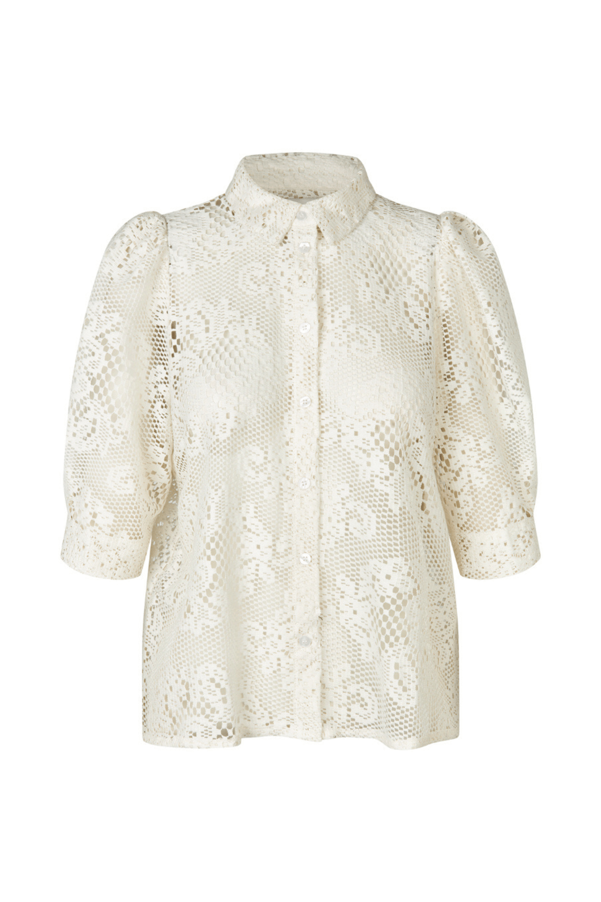 The Bono Shirt by Lollys Laundry is a creme lace top with 3/4 puffed sleeves, pleated shoulders, and button closure - offering a sophisticated silhouette for everyday wear. Layer with a lightweight blazer or cardigan for versatile styling.