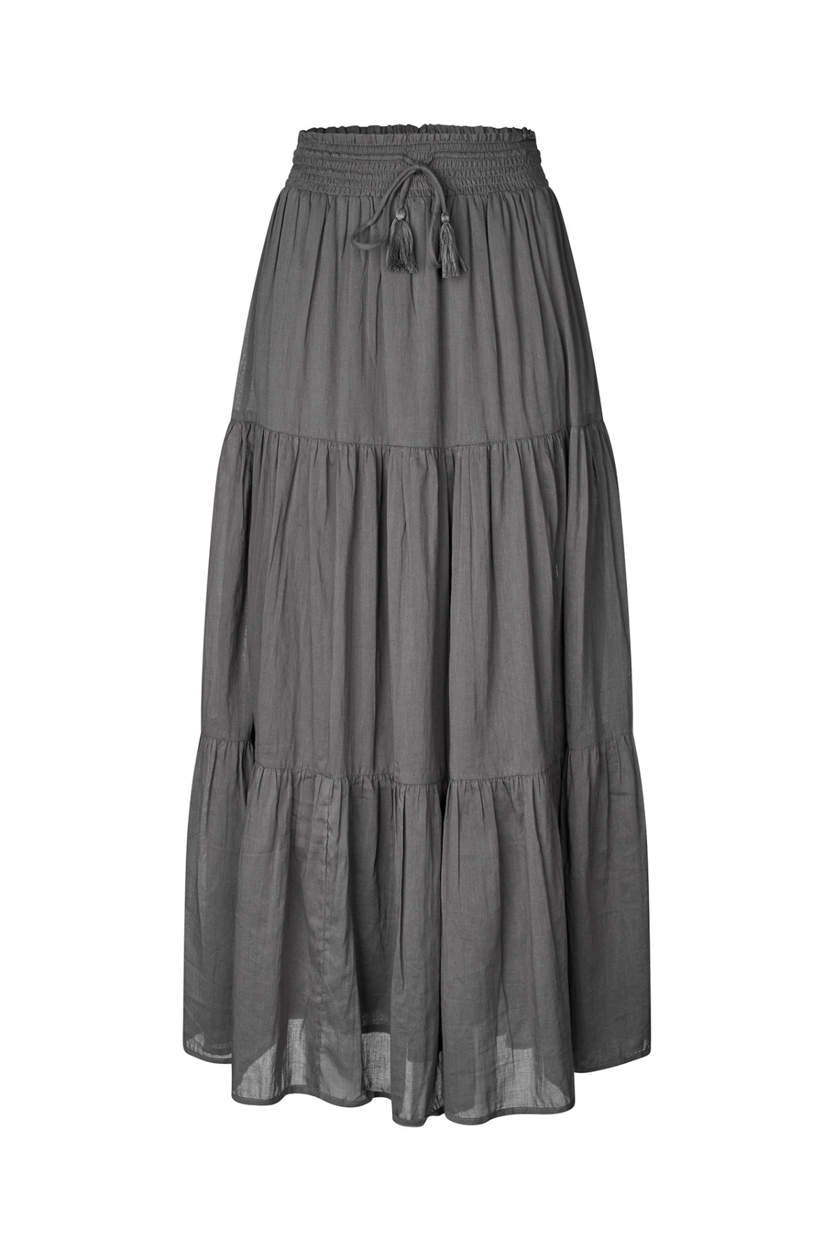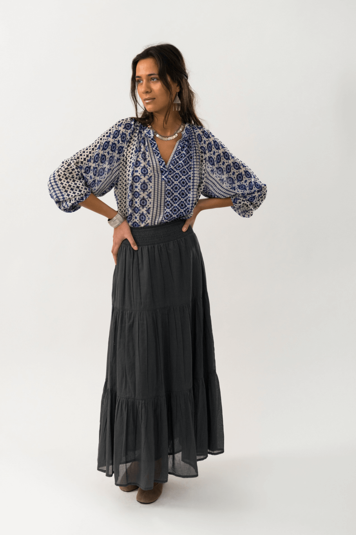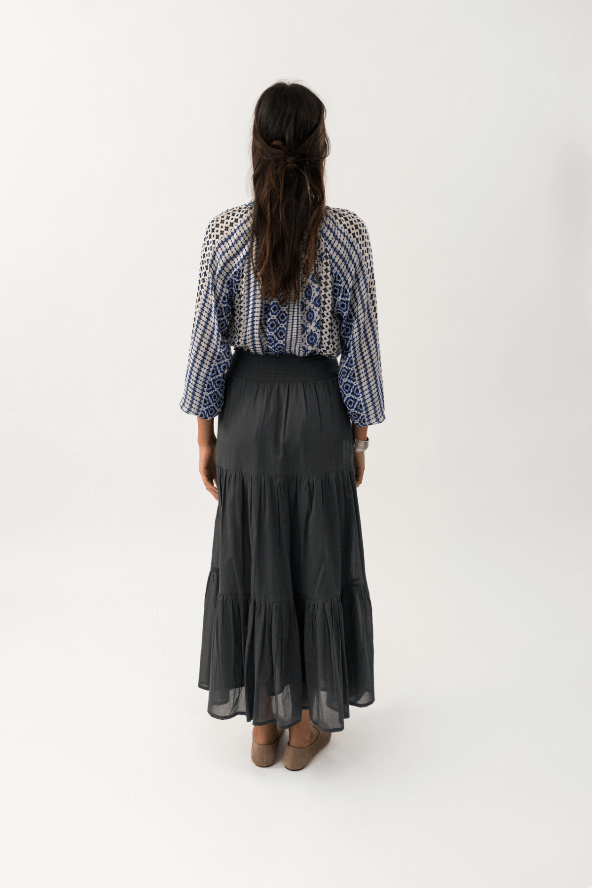 The Diamond Skirt by Lollys Laundry is a washed black maxi skirt in lightweight cotton with an elastic waistband. Pair it with a tucked-in blouse or casual tee for everyday wear, or elevate it with a top and heels for festive occasions. Ideal for summer outings or effortless summer styling, it combines comfort and charm in every step.