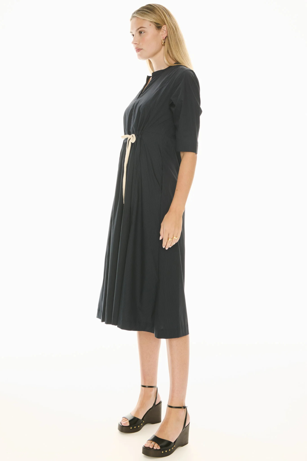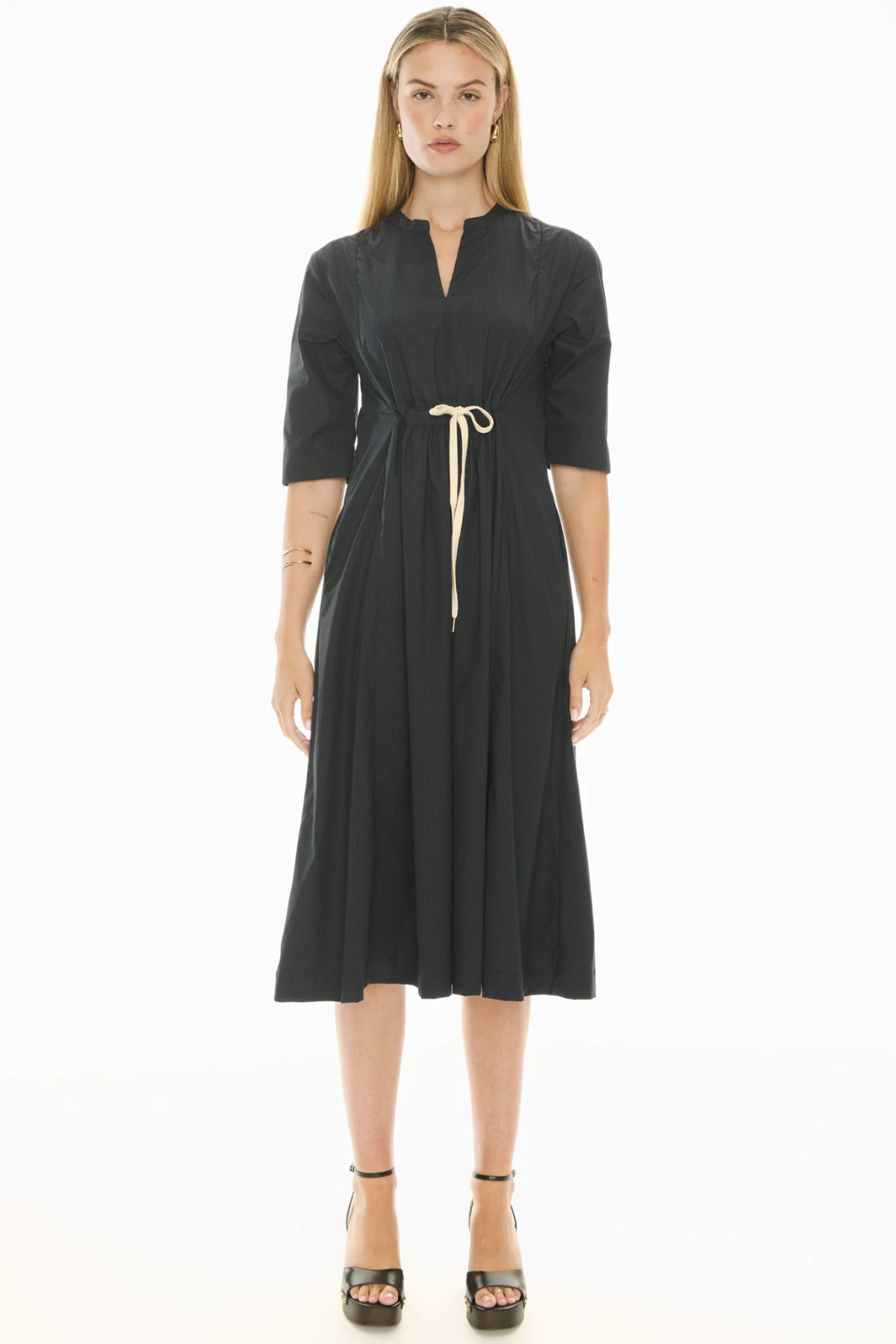 POL’s Fable Shirt Dress in Ink/Ink offers a relaxed, unfitted midi silhouette with 3/4 wide sleeves, slash neckline, and natural drawcord waist. Soft gathers create a flowy skirt, complemented by functional hip pockets. Ideal for casual daywear or summer outings.