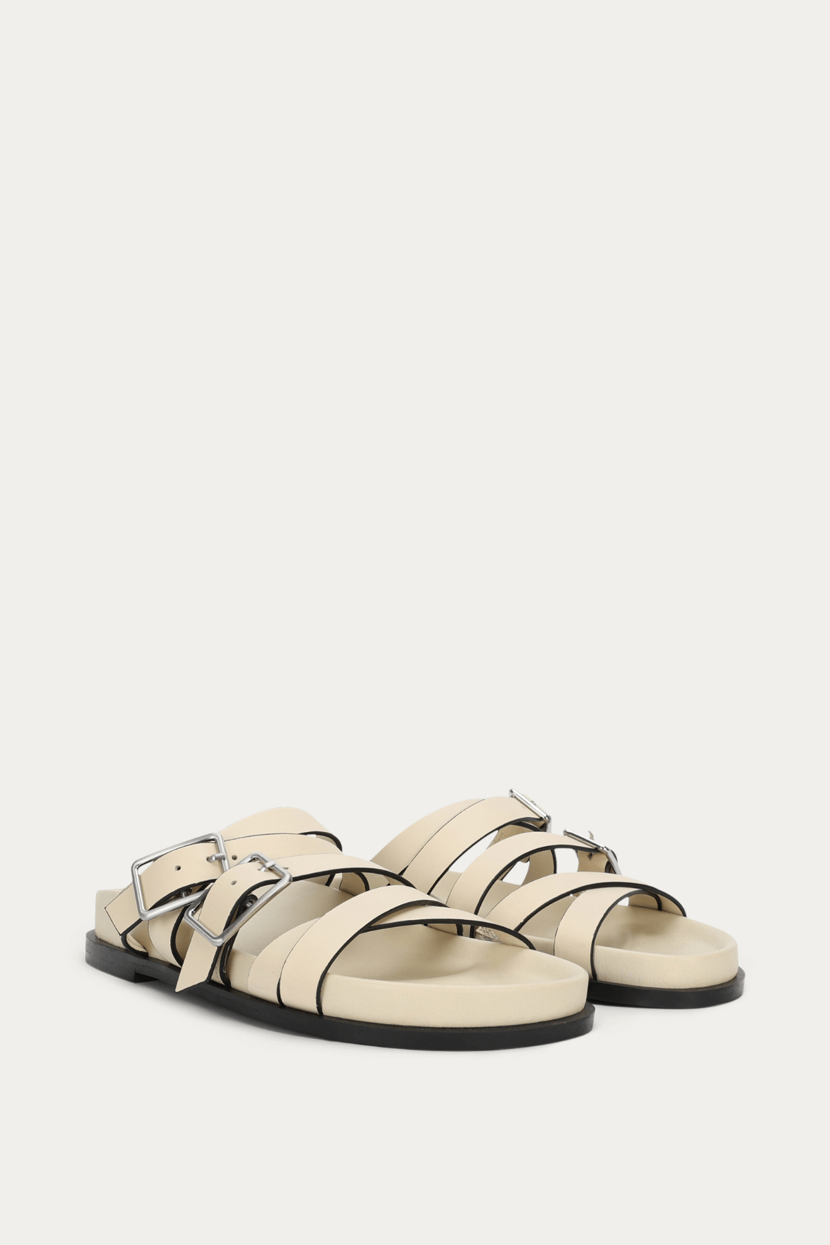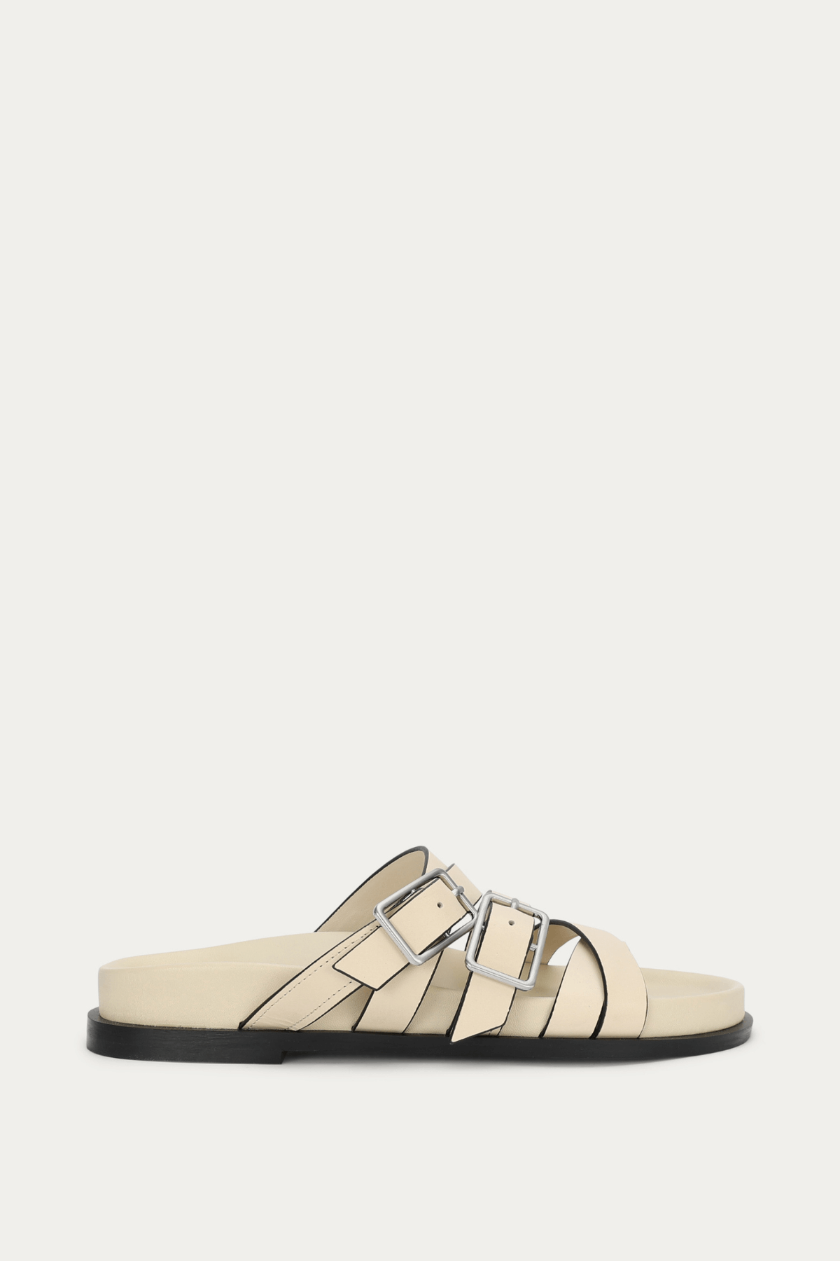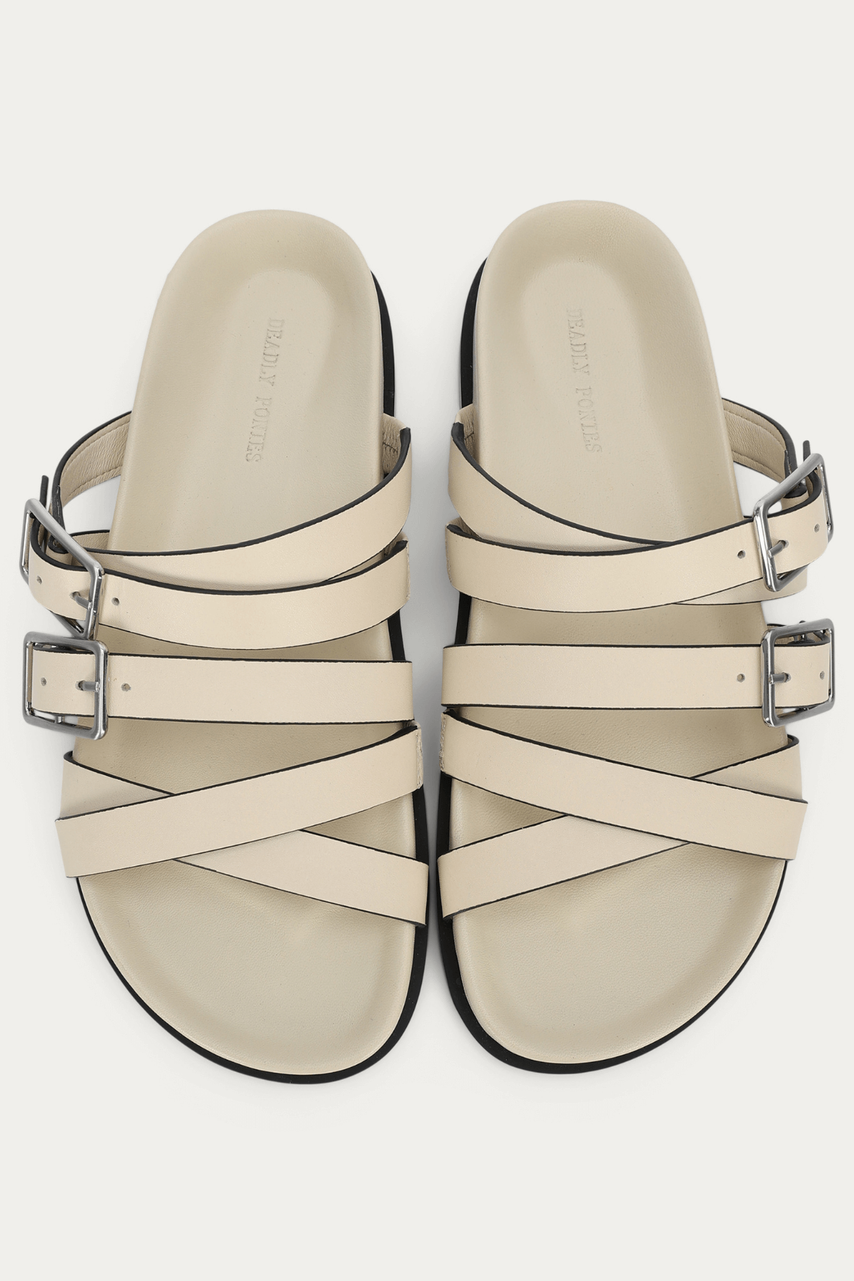 The Gemini Slide in Milk by Deadly Ponies combines soft Calf Nappa leather with adjustable buckle straps, a cushioned Lamb Nappa footbed, and a flexible rubber sole - designed for all-day ease. Perfect for relaxed weekends or elevated off-duty styling.