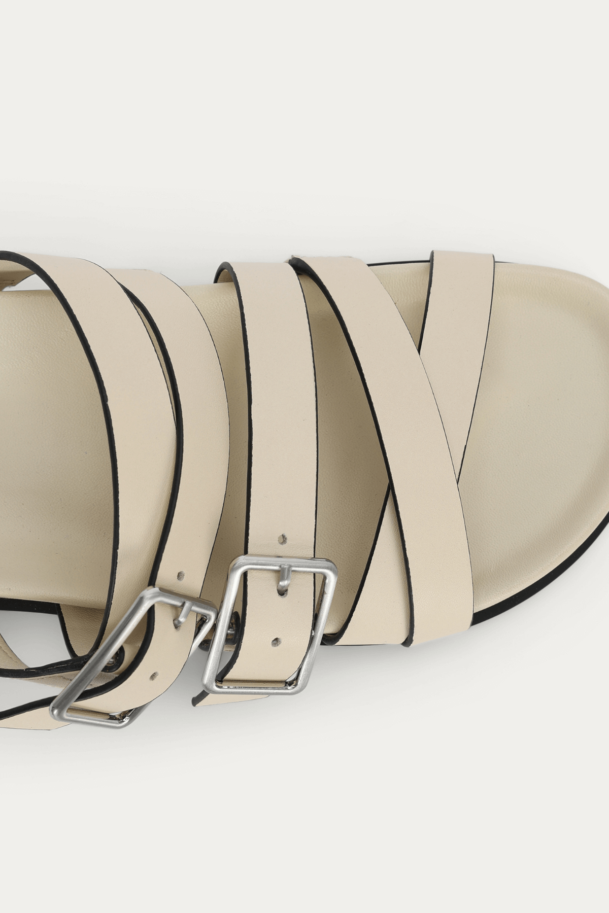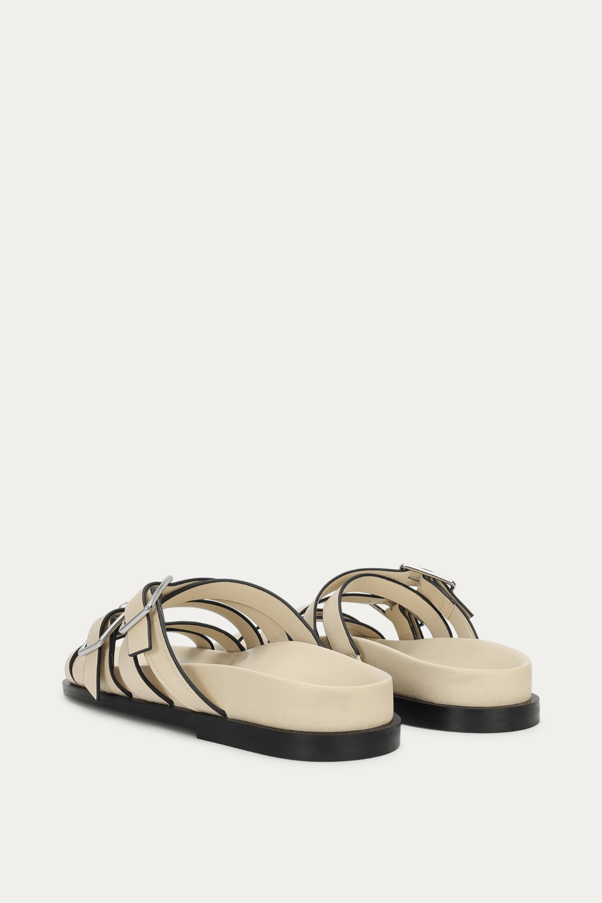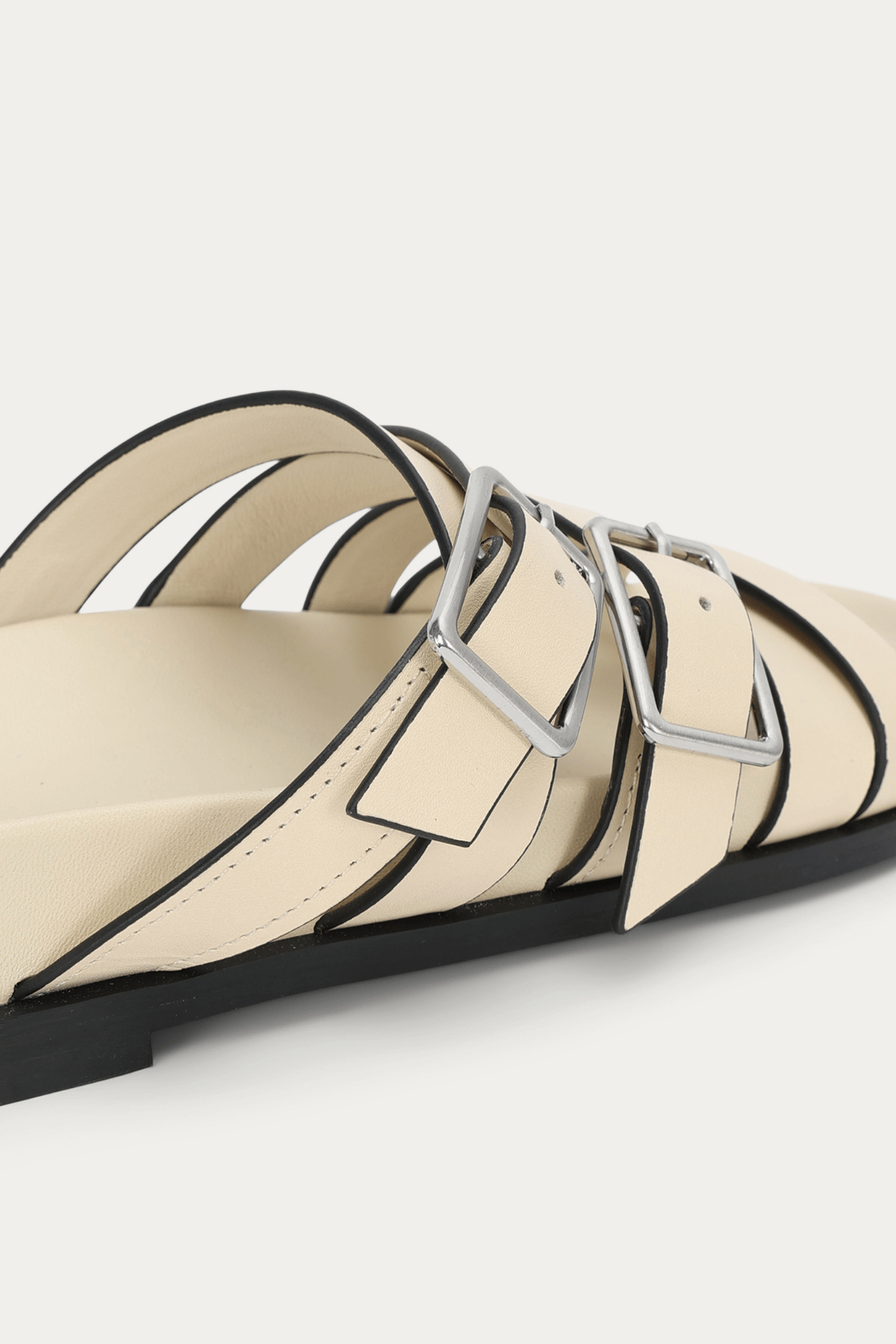 The Gemini Slide in Milk by Deadly Ponies combines soft Calf Nappa leather with adjustable buckle straps, a cushioned Lamb Nappa footbed, and a flexible rubber sole - designed for all-day ease. Perfect for relaxed weekends or elevated off-duty styling.