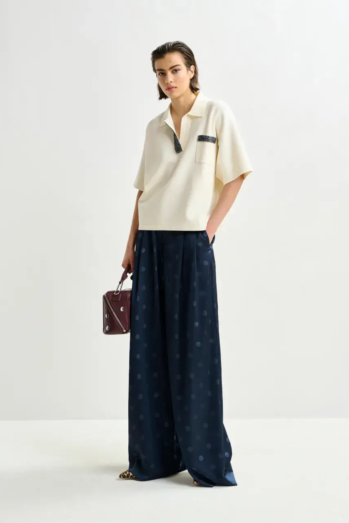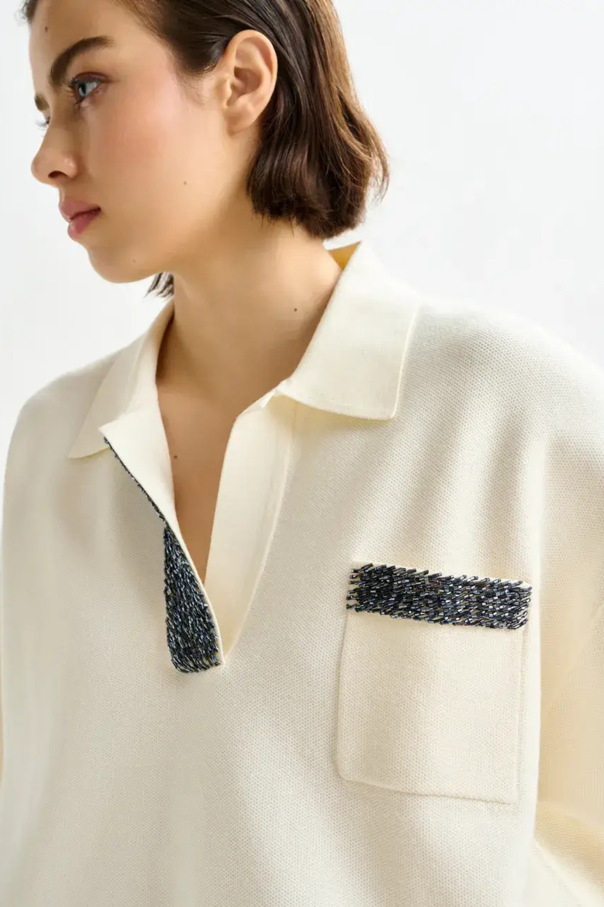The International Polo Top in Off White by Essentiel Antwerp features a fine-knit construction, relaxed fit, and a chic contrasting collar with delicate bead embellishments. Wear tucked into tailored trousers for a polished look, or pair with jeans and sneakers for effortless weekend style.