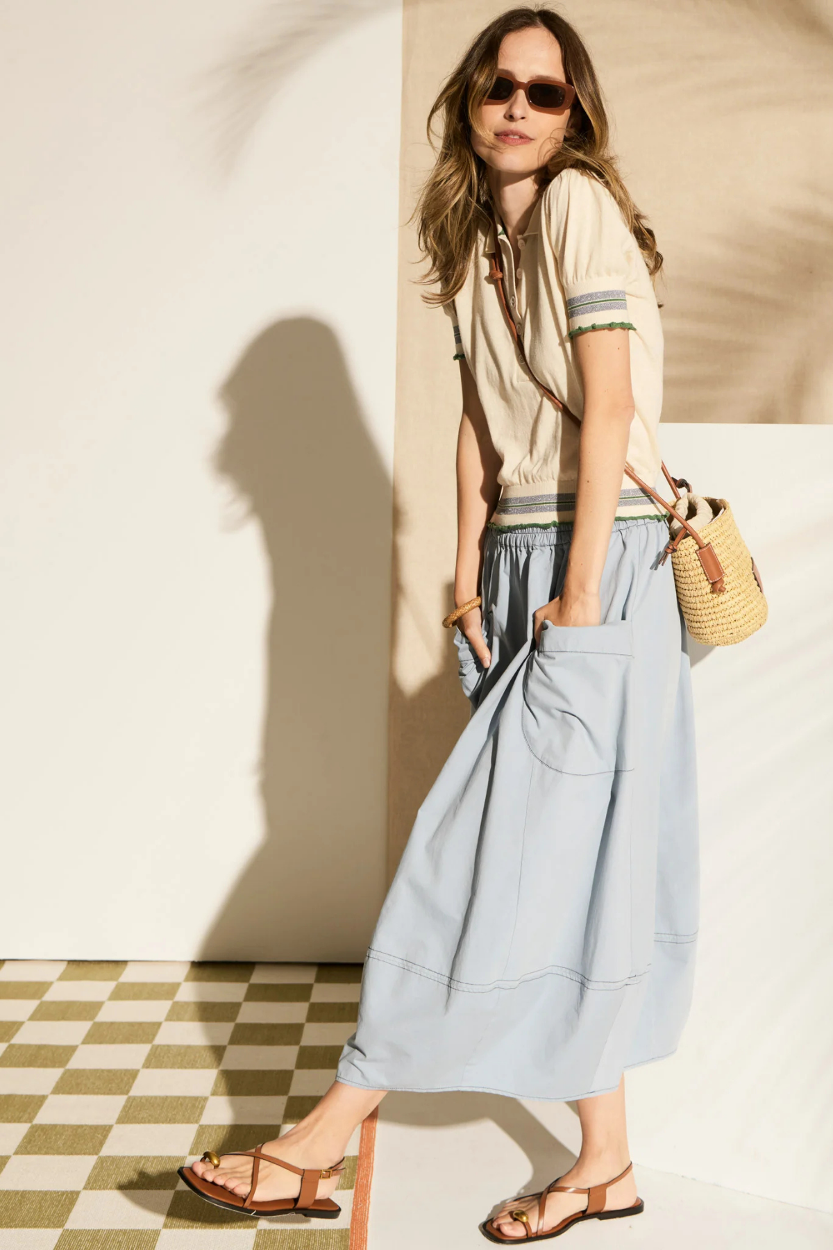 The POL Lask Knit Polo in Ecru/Green is a fully fashioned cotton knit top with lurex stripes, frill detailing at cuffs, and classic collar - ideal for layering and casual chic styling. Pair with tailored pants, skirts, or shorts for versatile seasonal outfits.