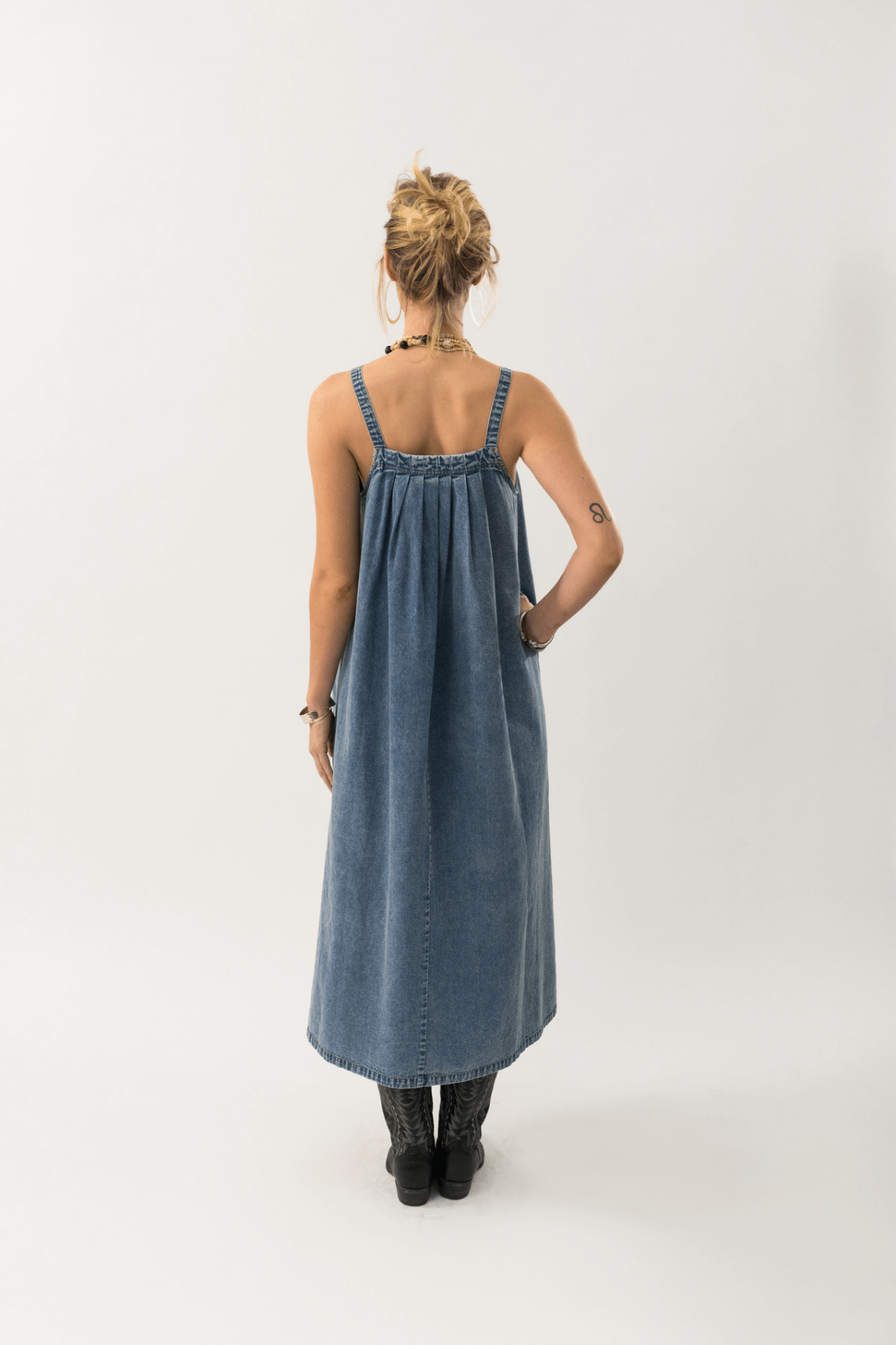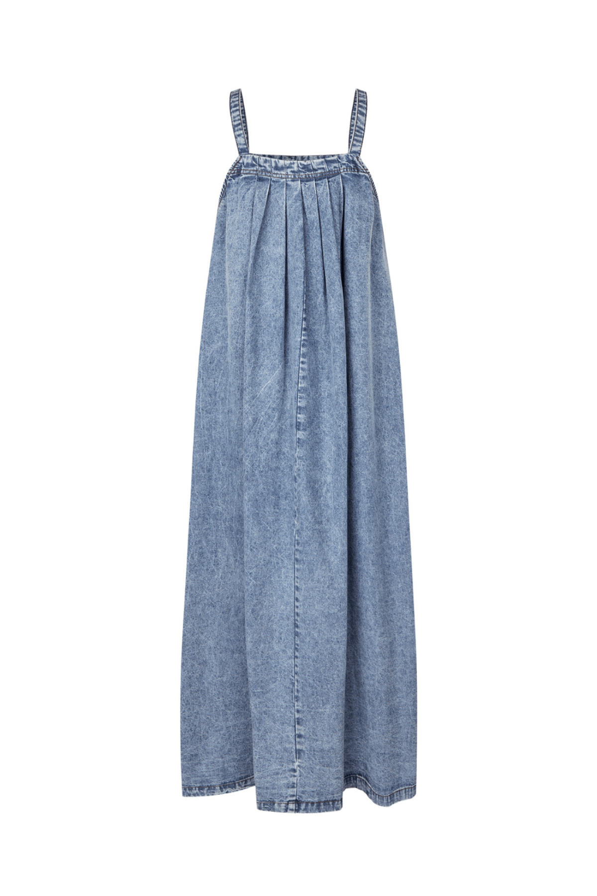 The Lungo Maxi Dress in washed denim by Lollys Laundry offers a soft, breathable cotton blend, loose fit, and pleated neckline. Pair the Lungo denim maxi with sandals for effortless summer days or layer with a knit cardigan and ankle boots during cooler months.