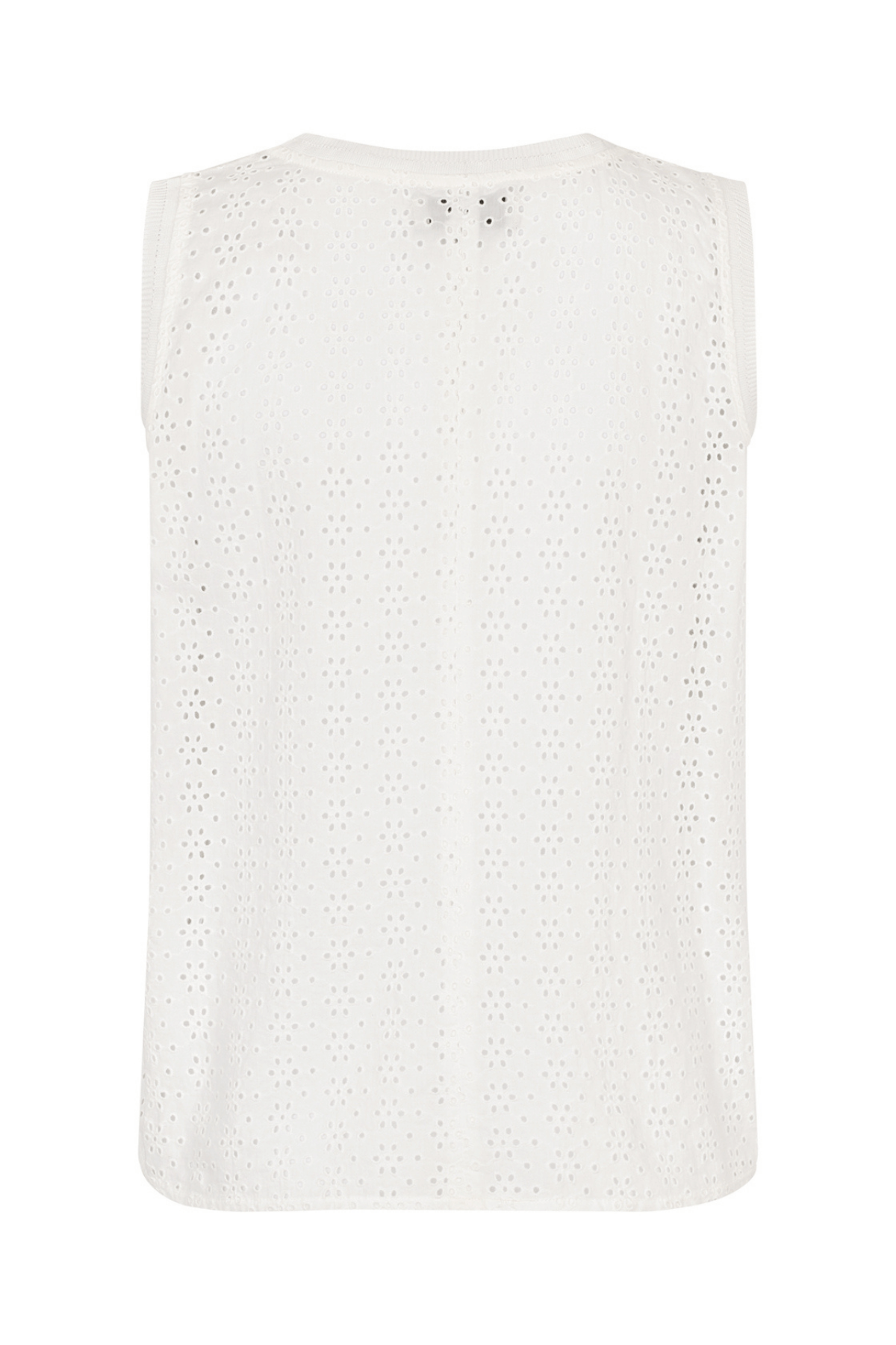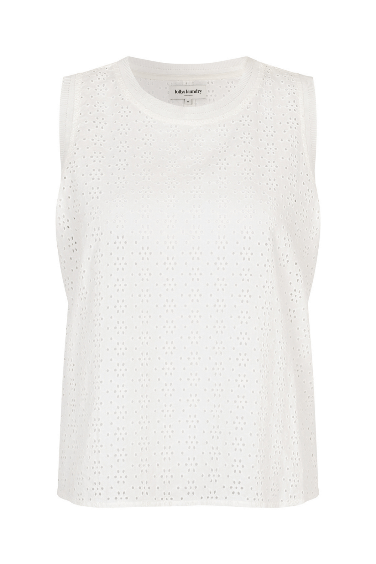 The Mo Top by Lollys Laundry is a white broderie anglaise cotton top with delicate details and a relaxed fit. Layer with a light cardigan for cooler evenings or wear solo for effortless warm-weather elegance.