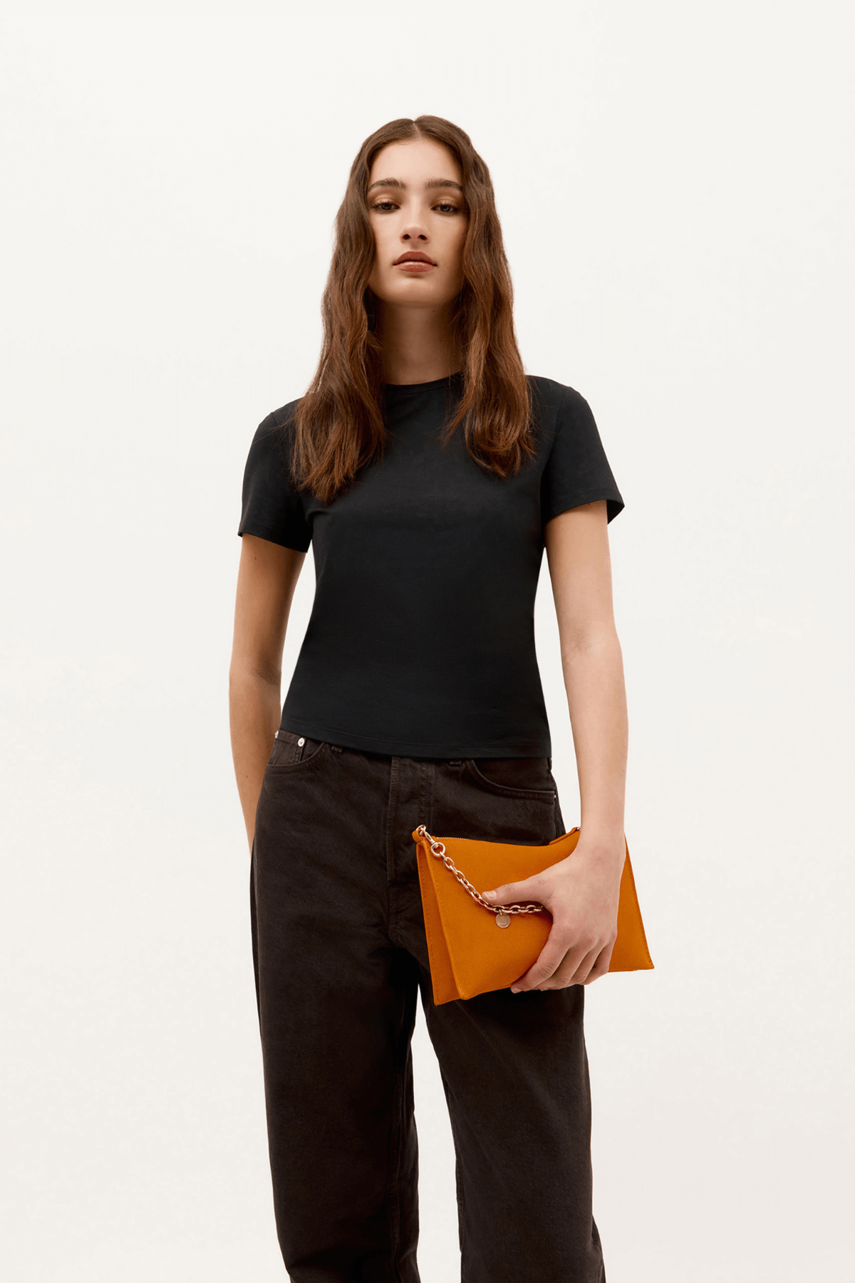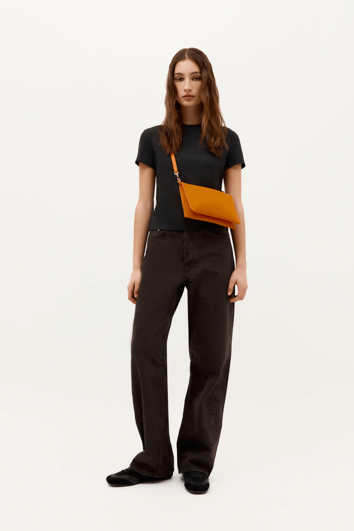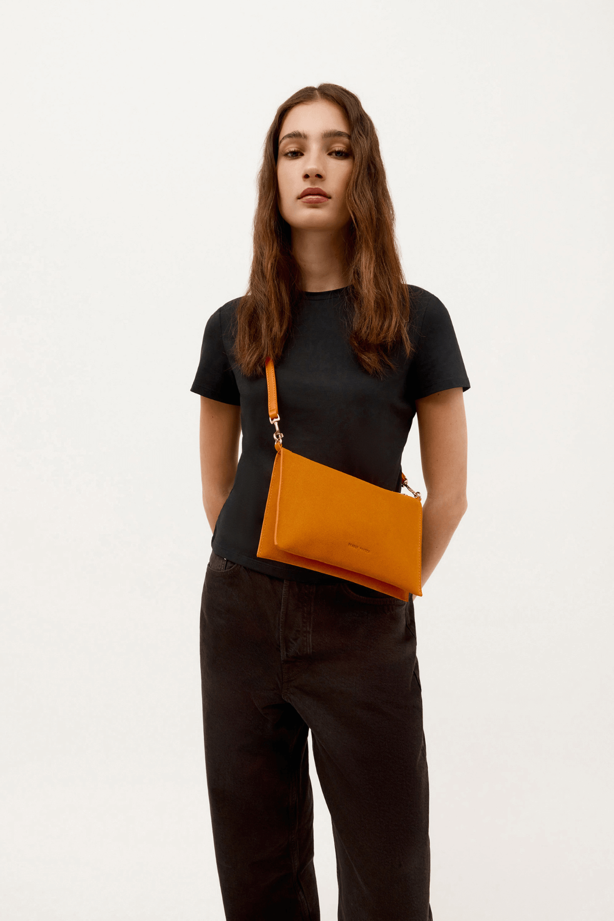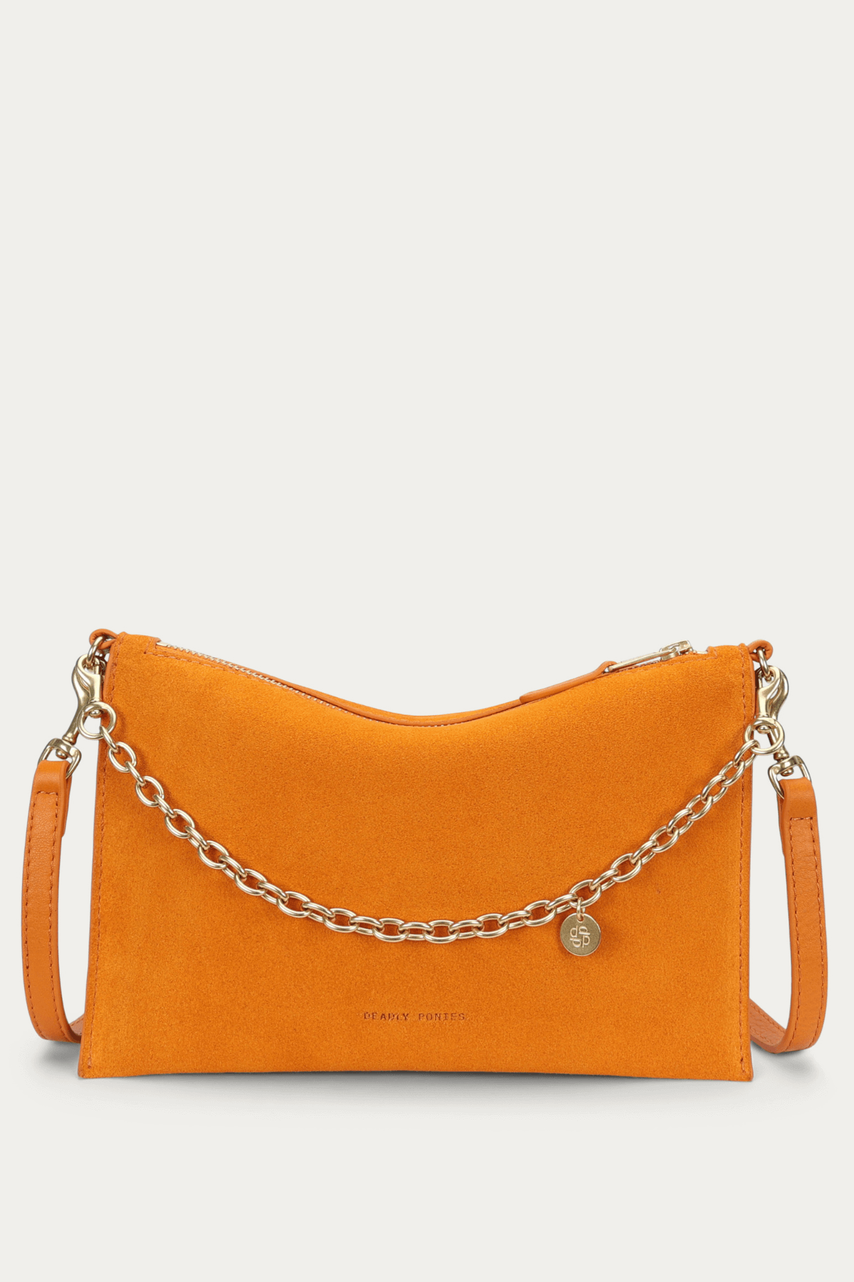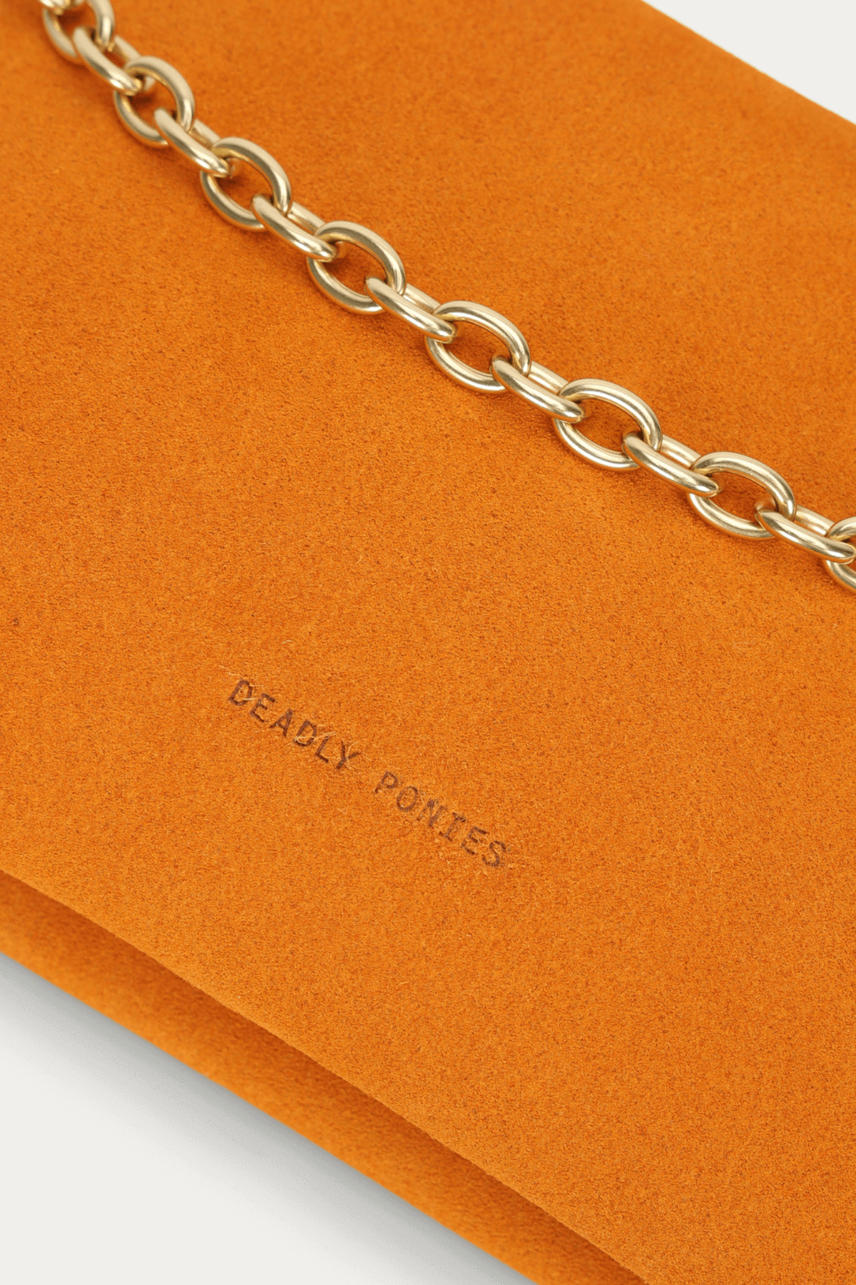 The Mr Siamese Bag by Deadly Ponies is crafted from soft Marmalade Calf Suede. Featuring a detachable brass chain, adjustable strap, and multiple pockets, it effortlessly transitions from clutch to crossbody. Sleek and streamlined, it’s perfect for day-to-night wear or elevating any casual outfit.