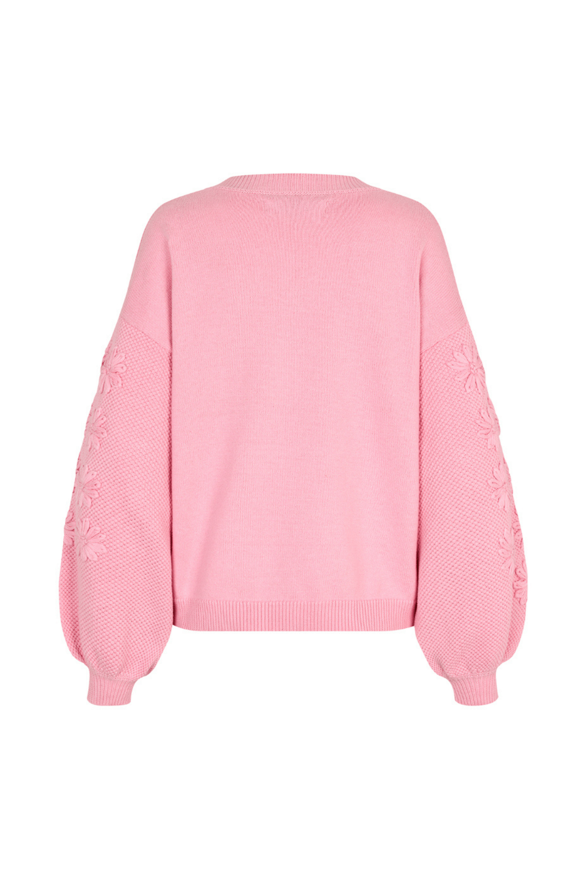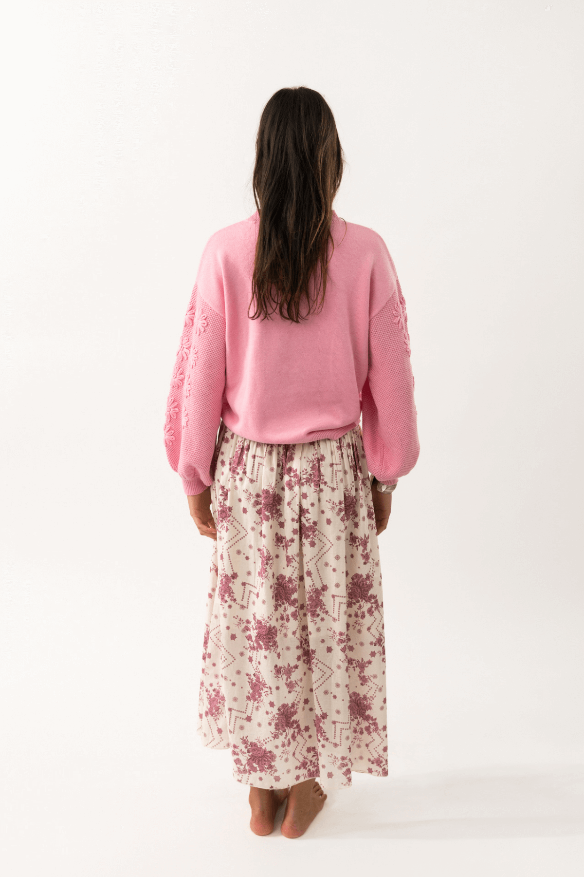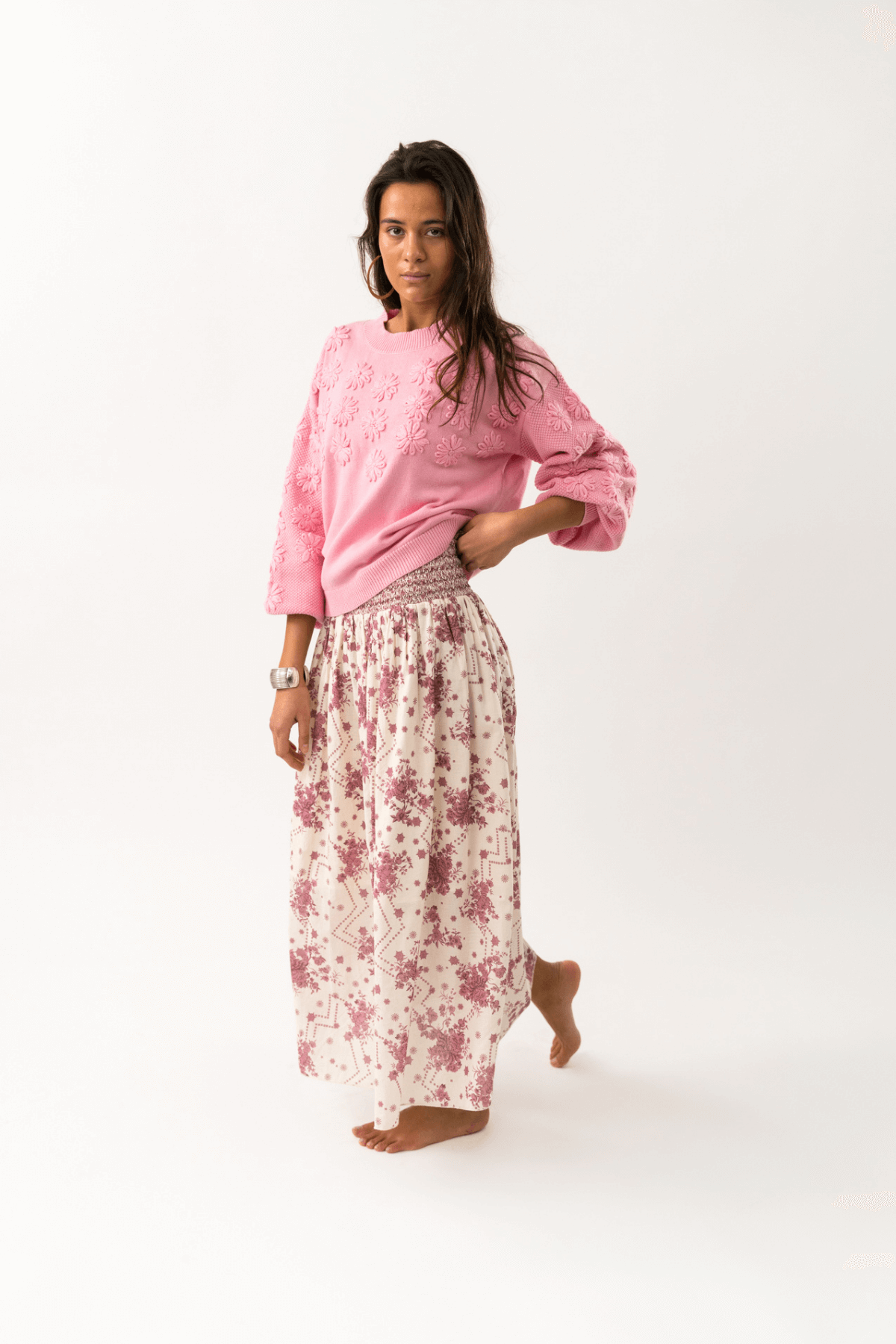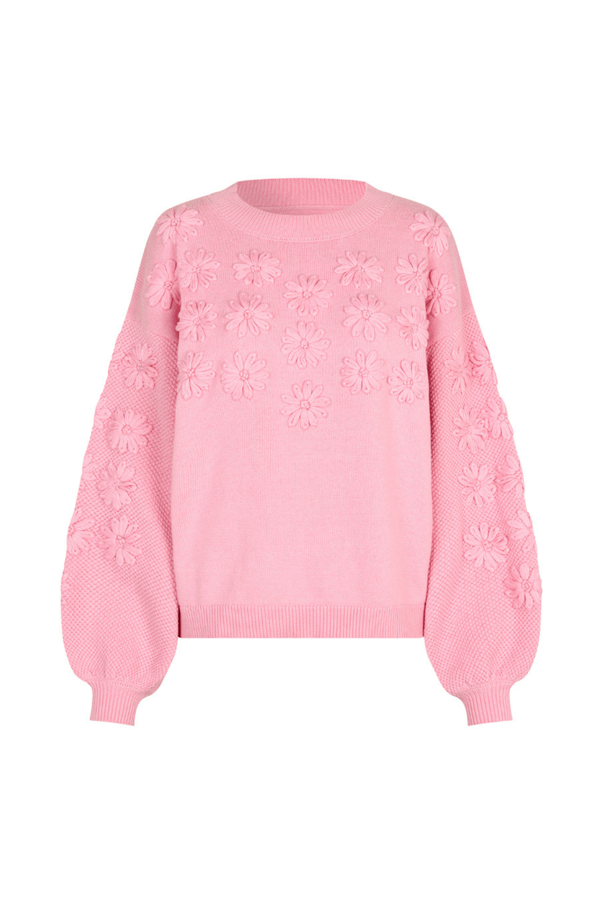 Make a statement with the Musa Knit Jumper. Its neon pink hue, 3D knitted flowers, and voluminous textured sleeves bring playful elegance to casual or city styling. Layer over jeans or skirts for a bold look perfect for winters or outings.
