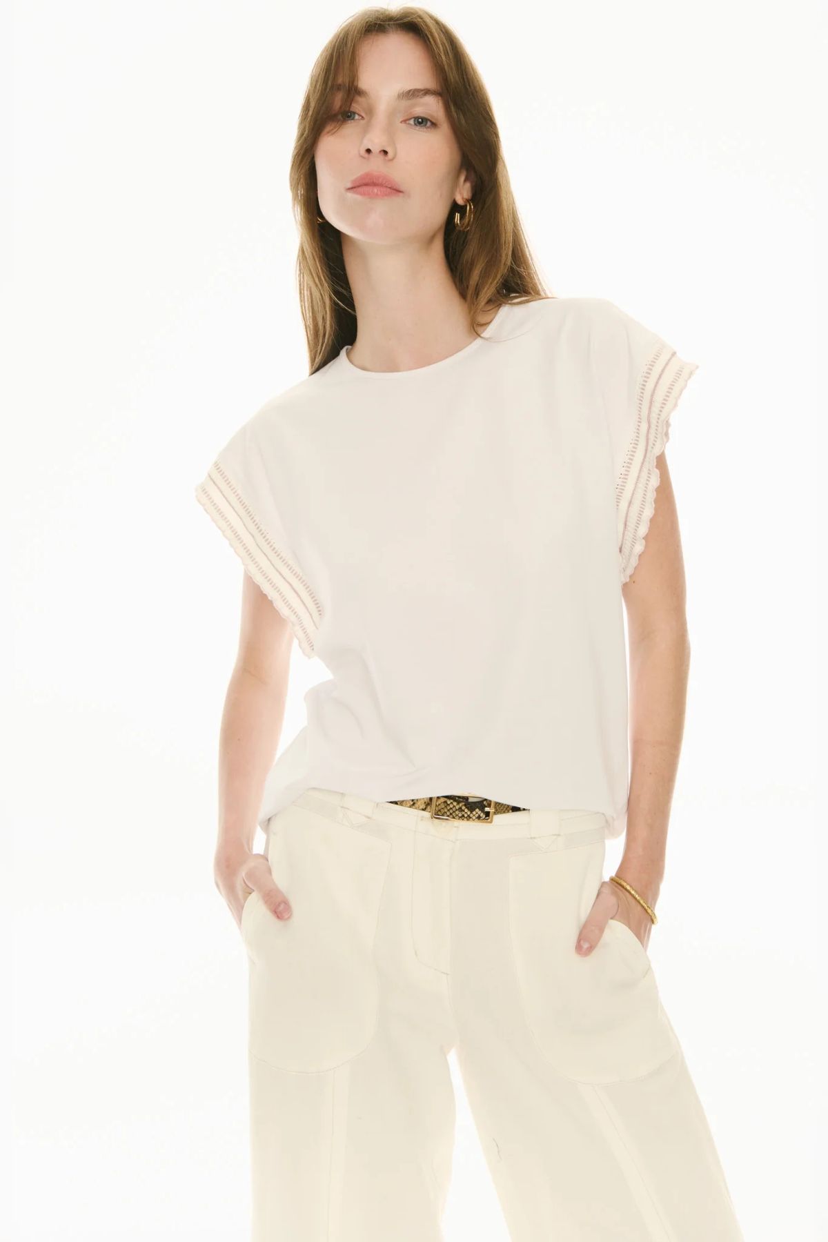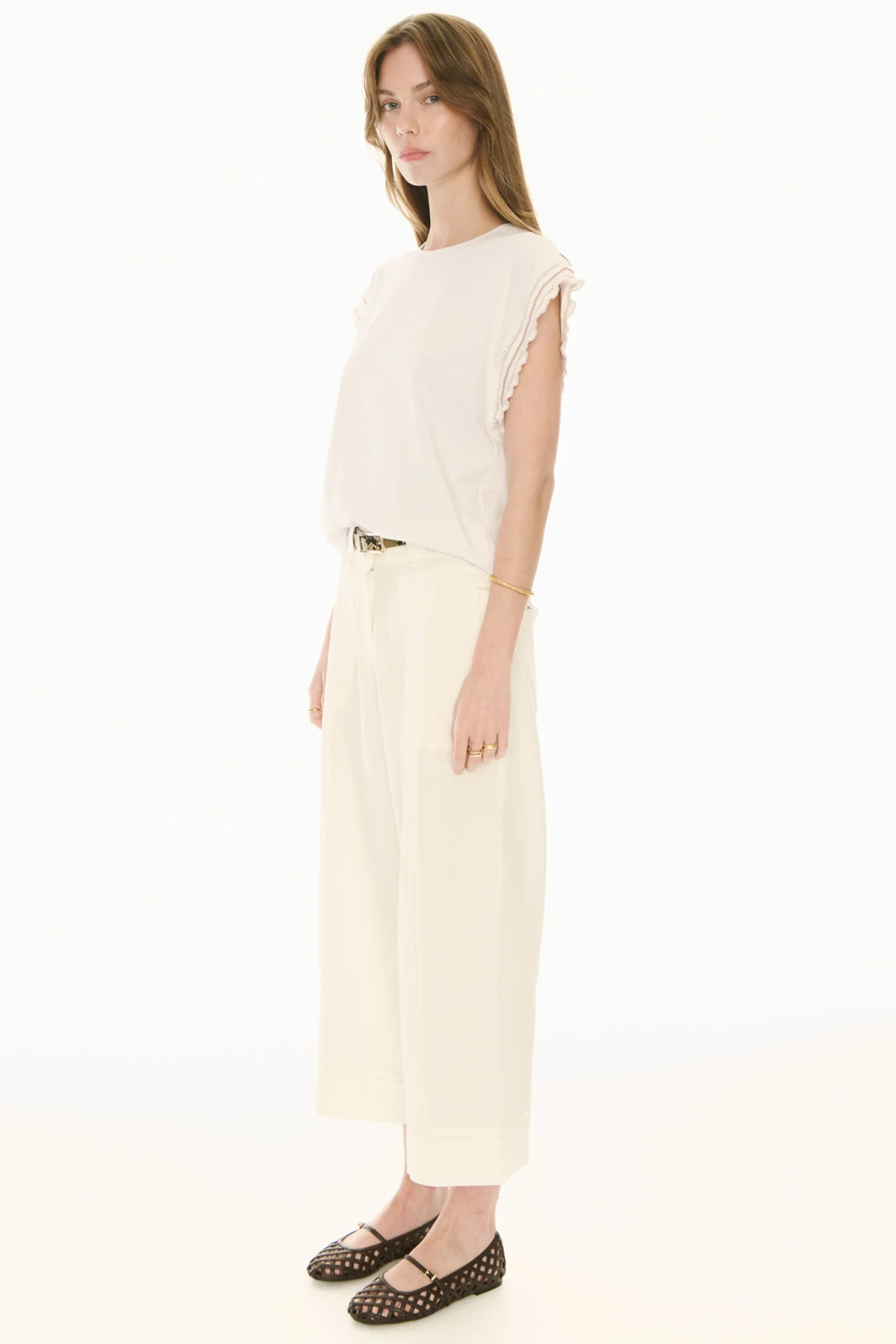 The Oskar Cropped Pant in Ecru by POL offers a relaxed wide-leg fit, cropped length, and curved hip pockets. Crafted from a comfortable ramie-cotton blend, it’s available in Black, and Ecru.