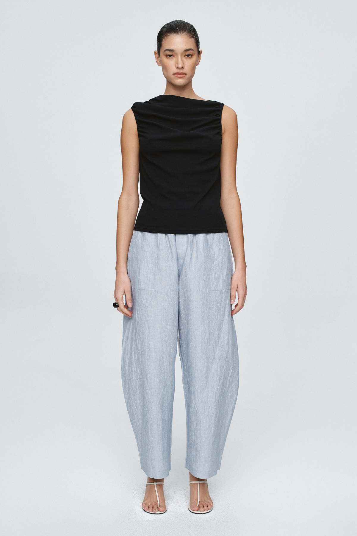 Crafted from soft stretch cotton, the Risa Singlet in Black by Marle features an artfully draped neckline and fitted silhouette. Wear it on or off the shoulder for versatile, elegant styling.