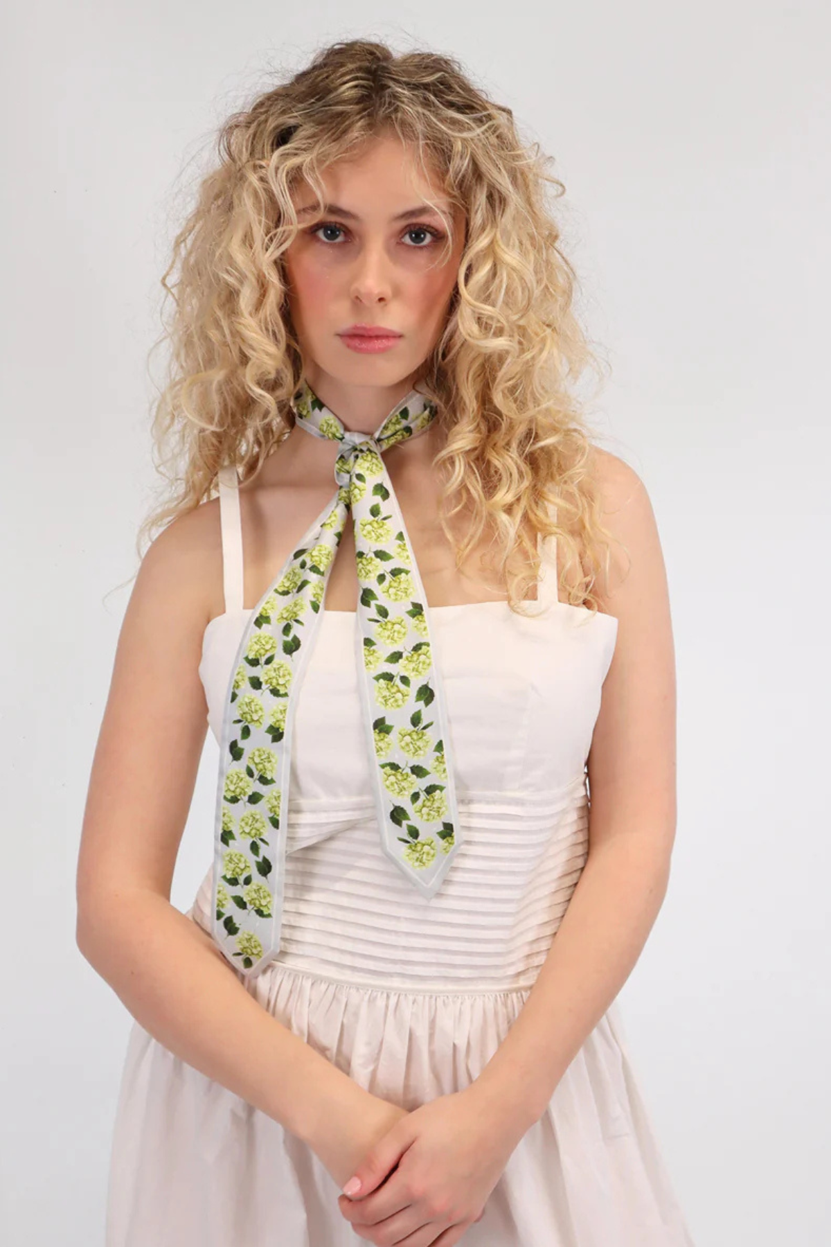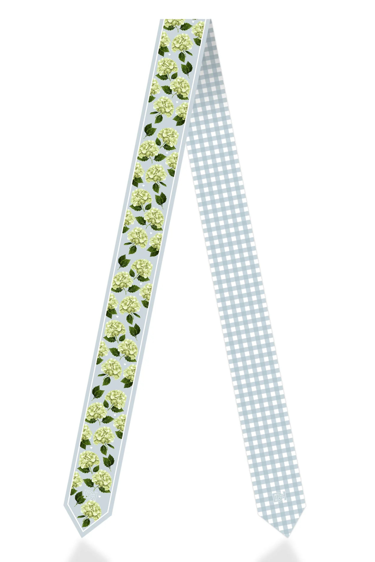 The Cousin Silk Twilly by Dark Hampton blends elegant blue hydrangeas with a playful gingham reverse - crafted from 100% Mulberry silk for timeless charm and versatile styling. Wear it around your neck, wrist, or handbag for effortless sophistication.