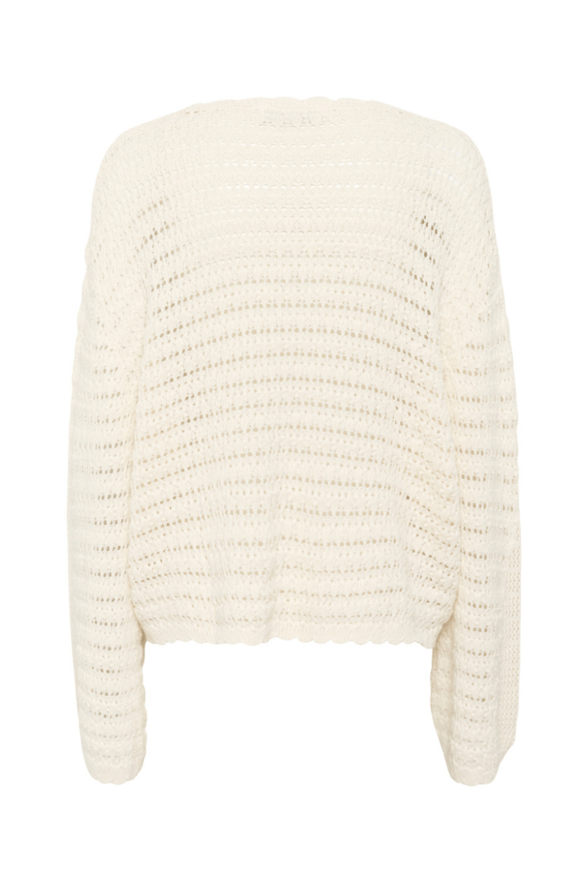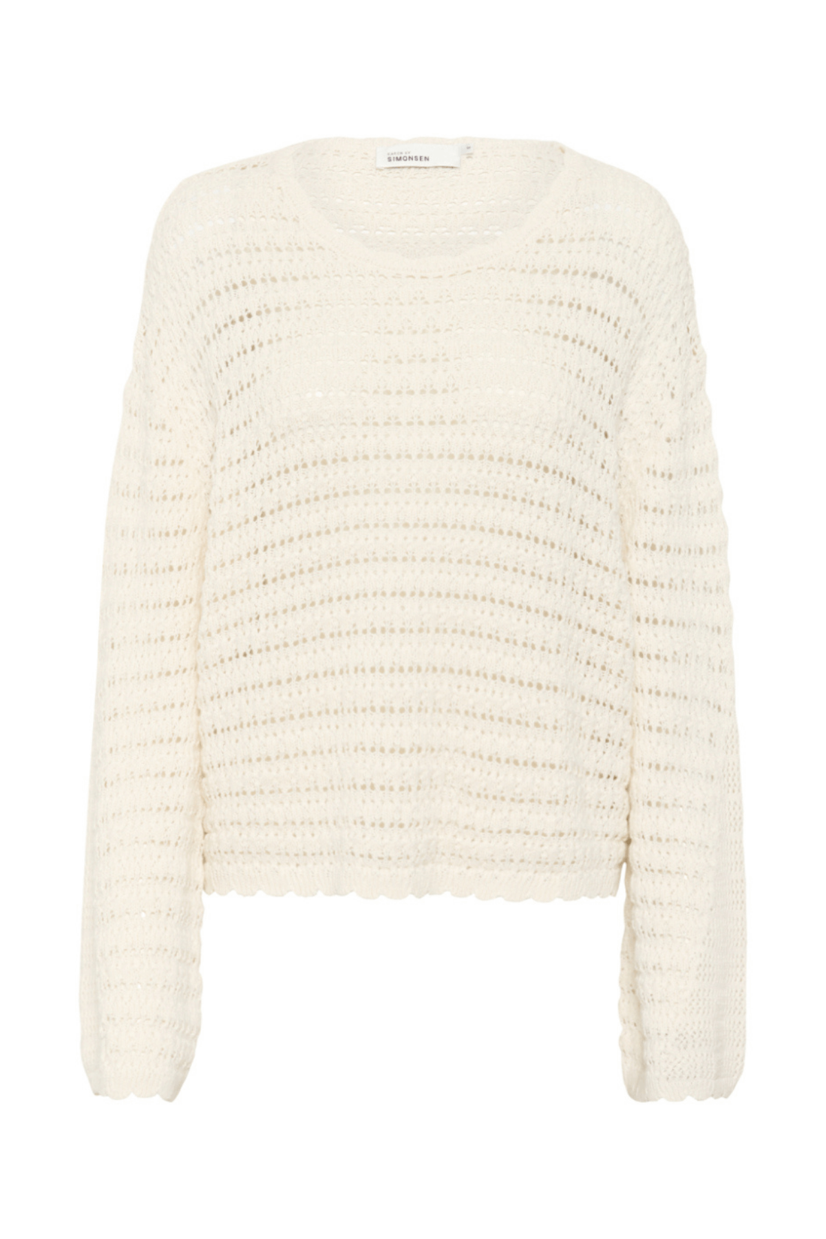 The Venus Pullover in soft egret shade by Karen By Simonsen with round neckline, long sleeves, and mid-hip boxy silhouette. Perfect for layering or standalone casual summer outfits.
