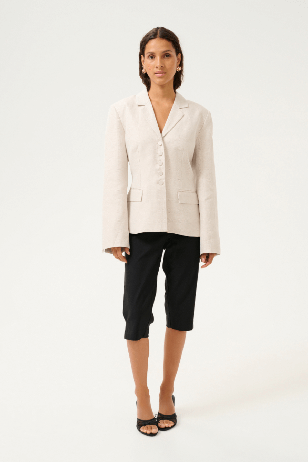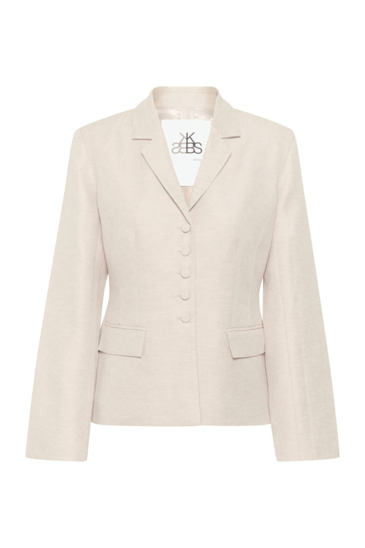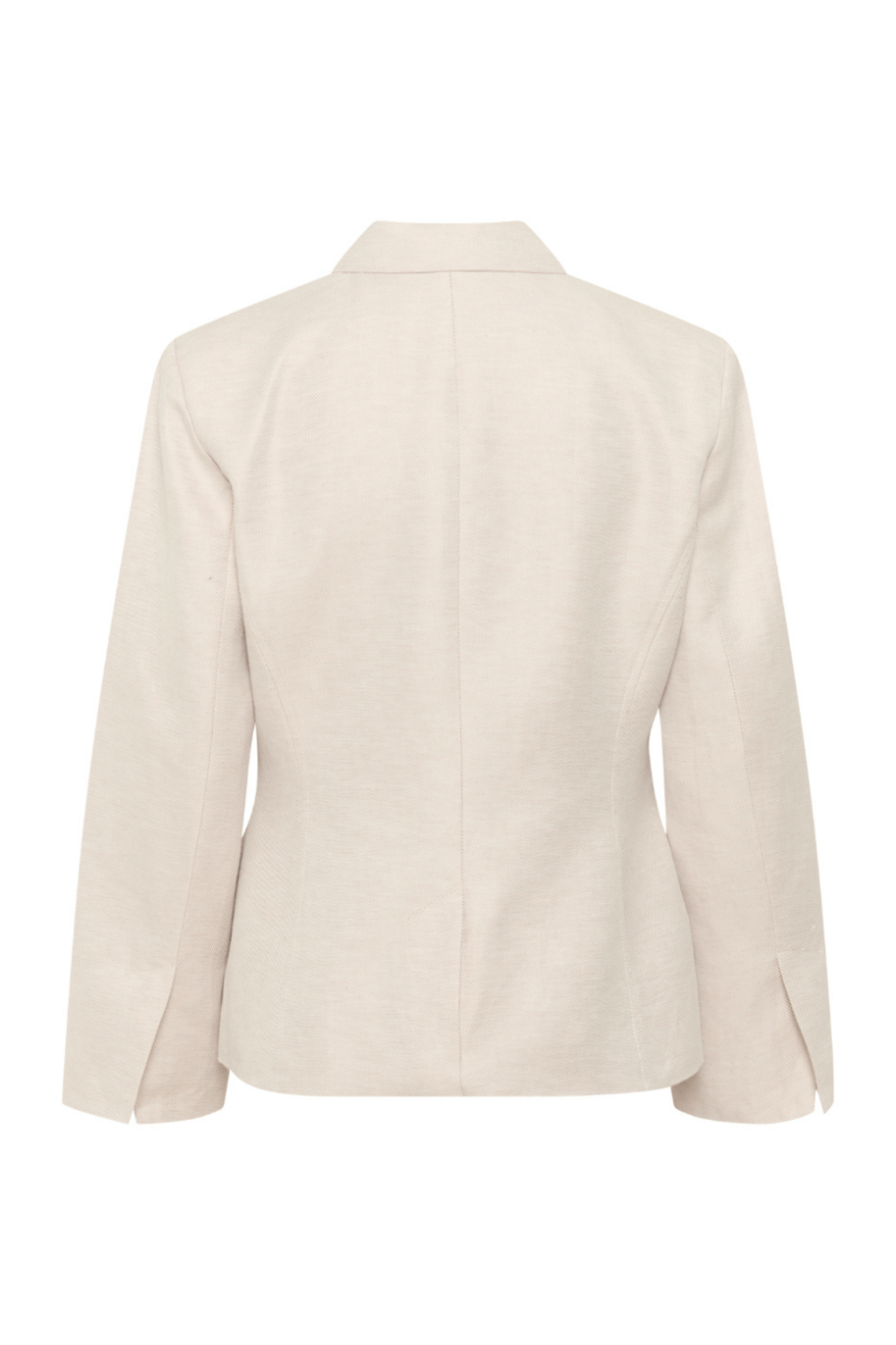 The Via Blazer by Karen by Simonsen delivers a tailored feminine silhouette in a natural melange shade with cotton-linen blend comfort, perfect for professionals and shoppers seeking polished layering.