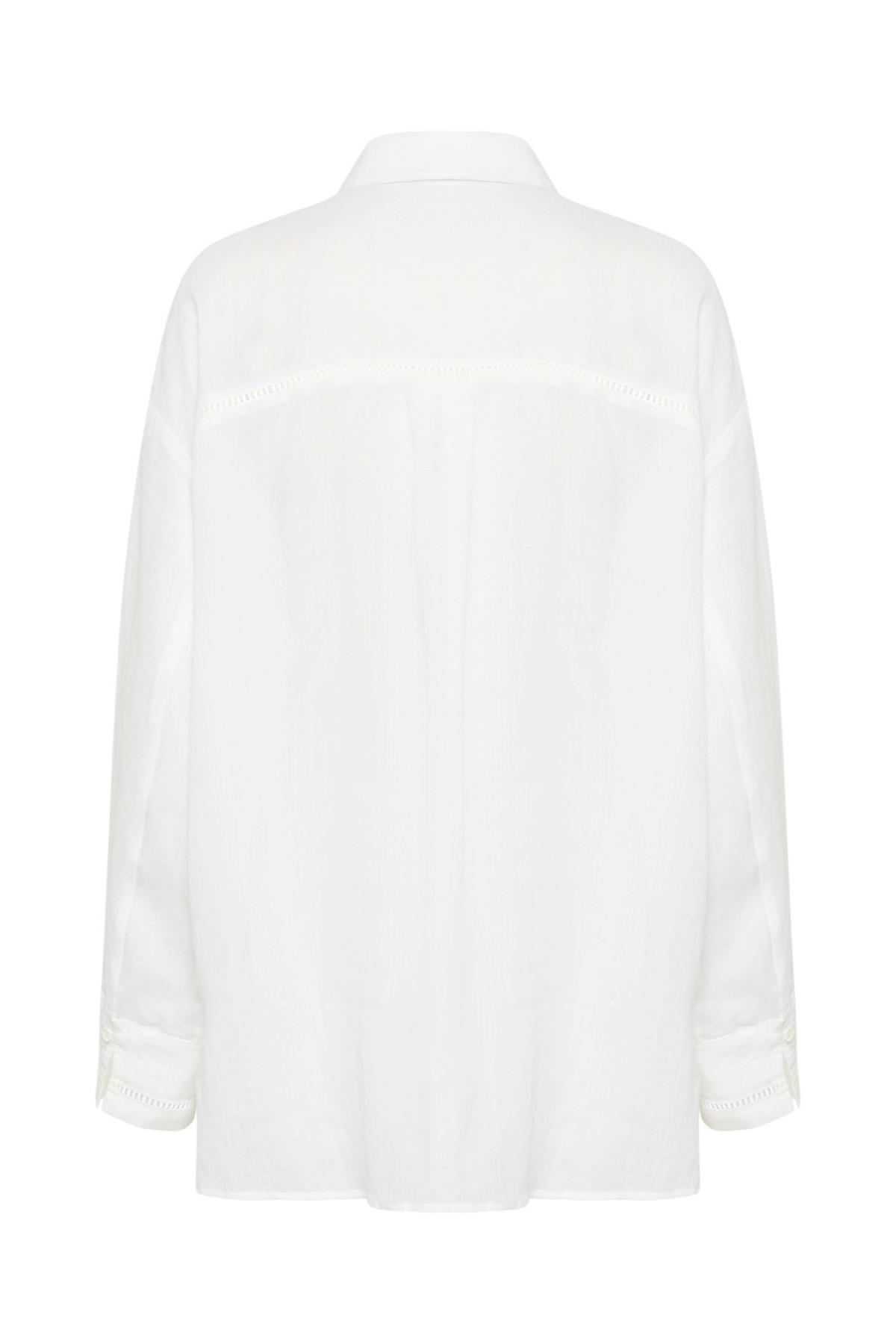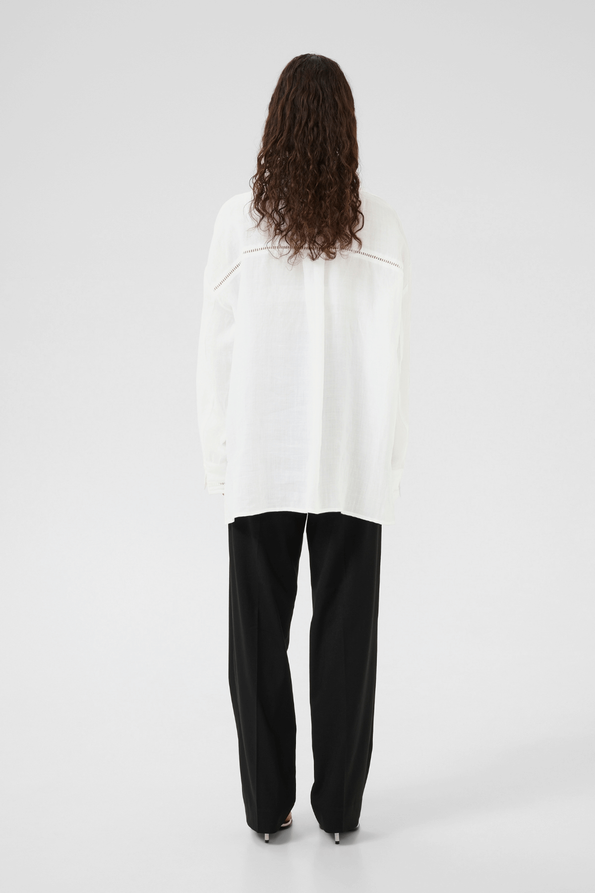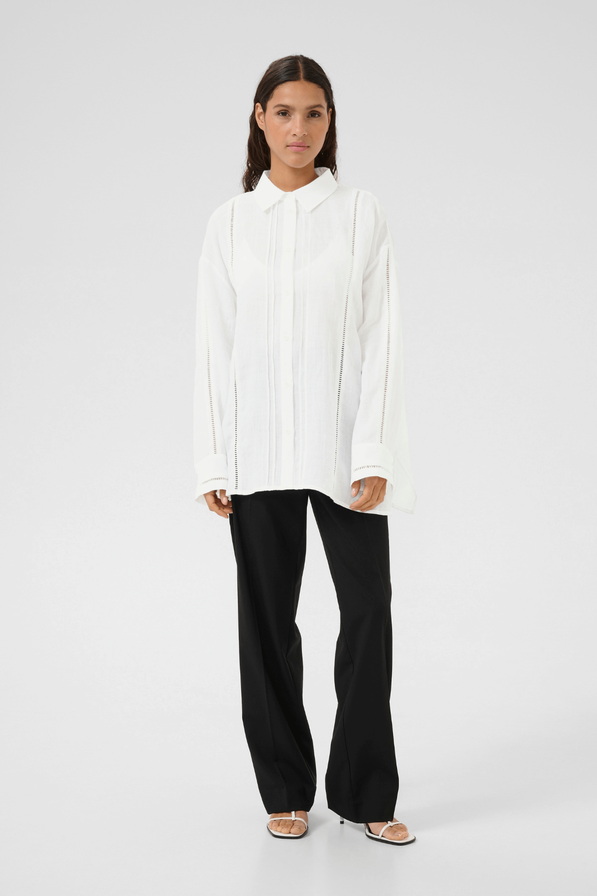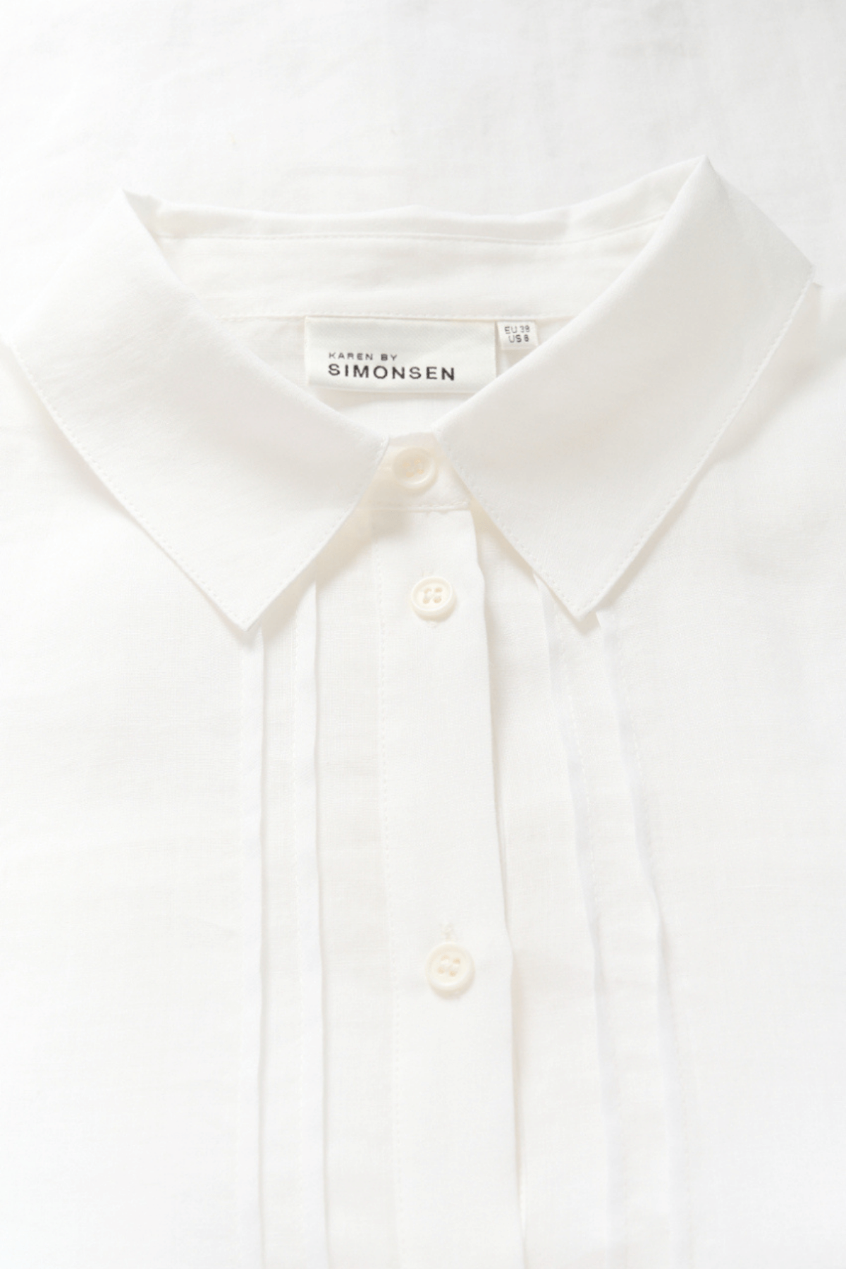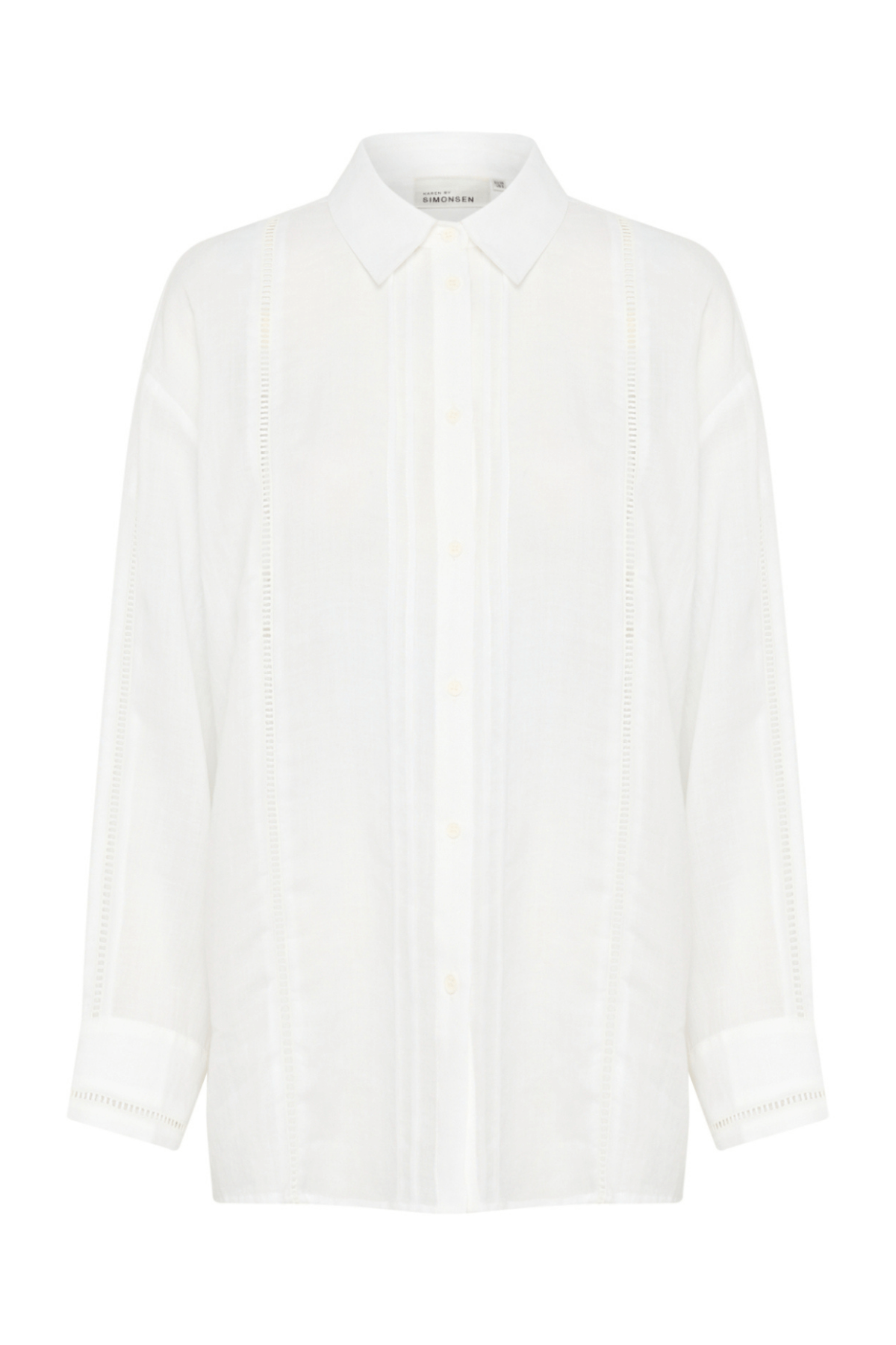 The Vilde Shirt in Bright White by Karen by Simonsen offers a modern, airy take on classic shirting. Made from 100% ramie, it features a structured yet breathable texture with subtle vertical openwork stripes that add interest without overwhelming the silhouette. The oversized fit, mid-thigh length, and long sleeves with wide cuffs. Pair it tucked into trousers, left loose over skirts, or layered for a versatile, contemporary look.