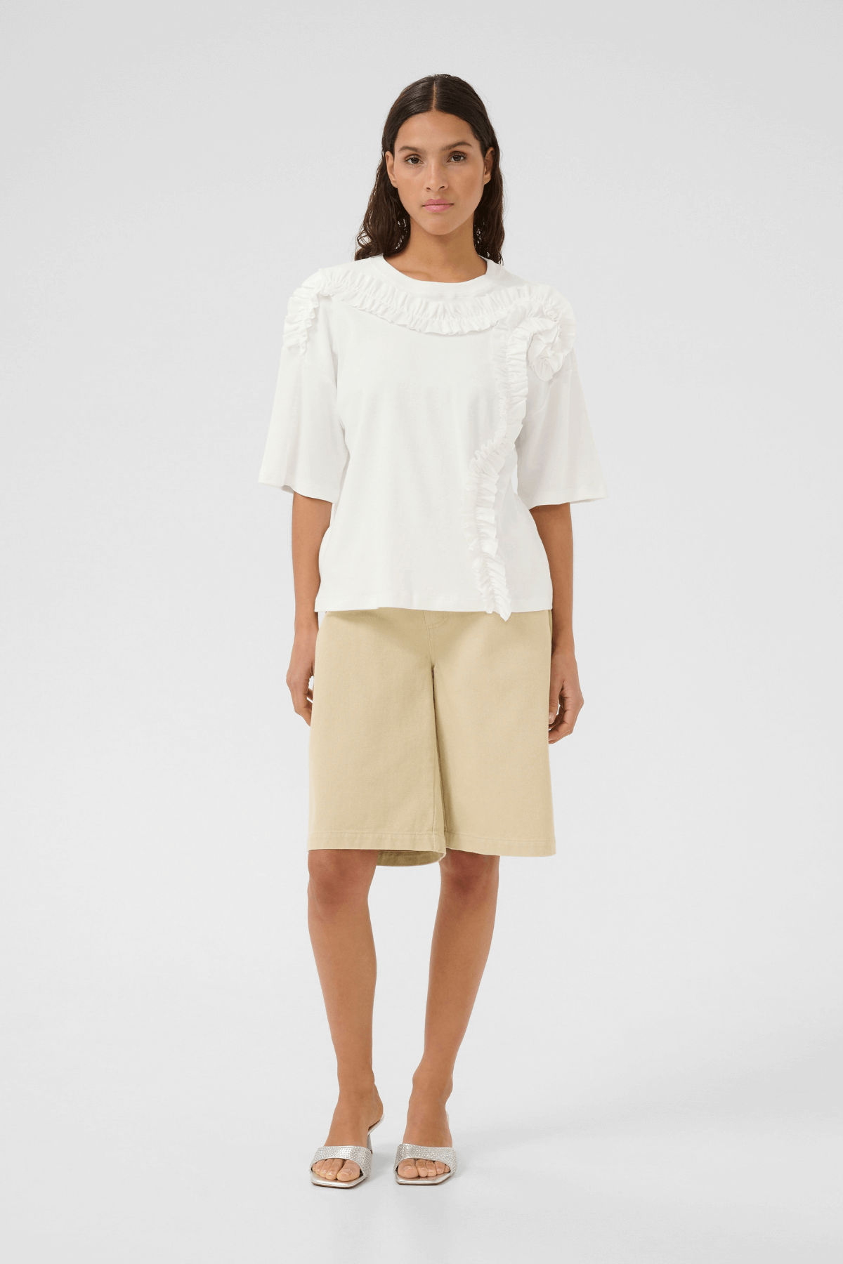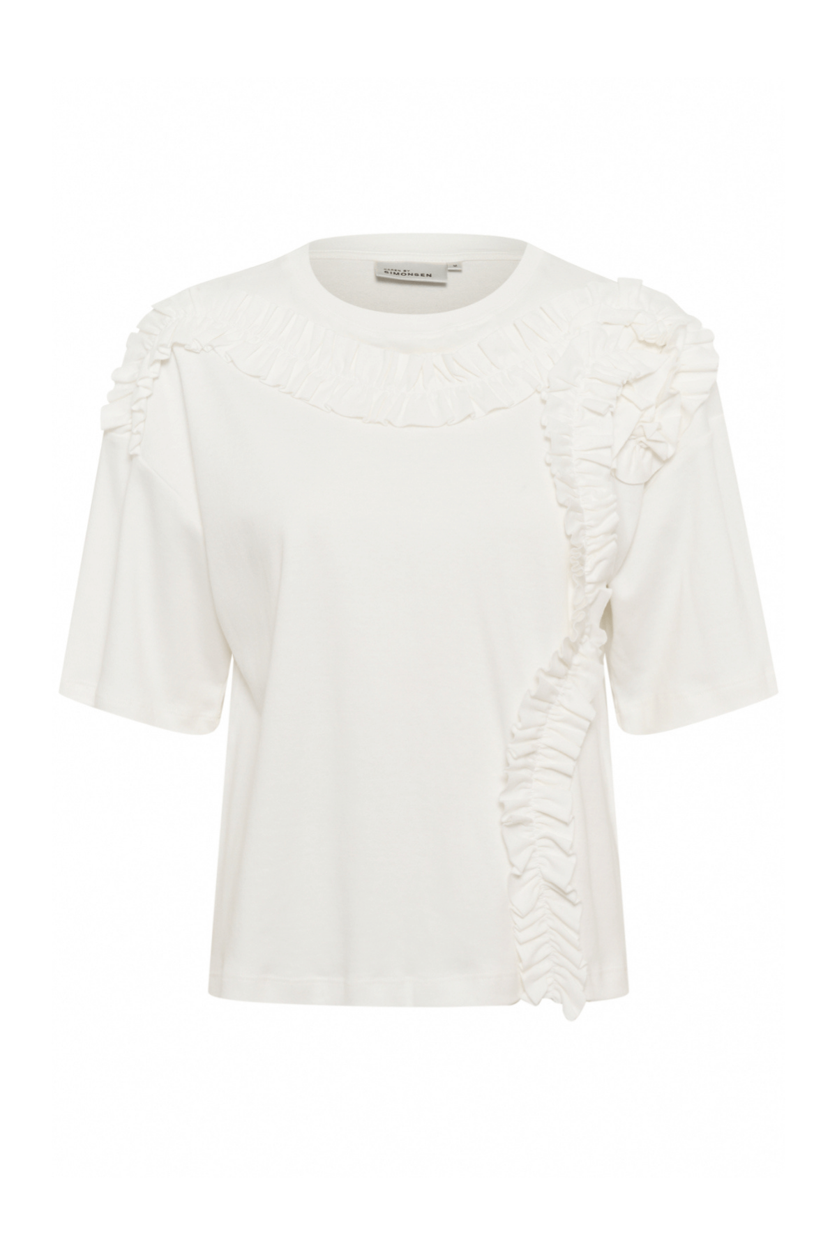 The Vivian Tee in Bright White by Karen by Simonsen gives the everyday cotton T-shirt a refined twist. Designed with a classic fit and hip-length cut, this elevated white tee features soft ruffle detailing that runs across the chest and shoulders for a feminine, textured finish.