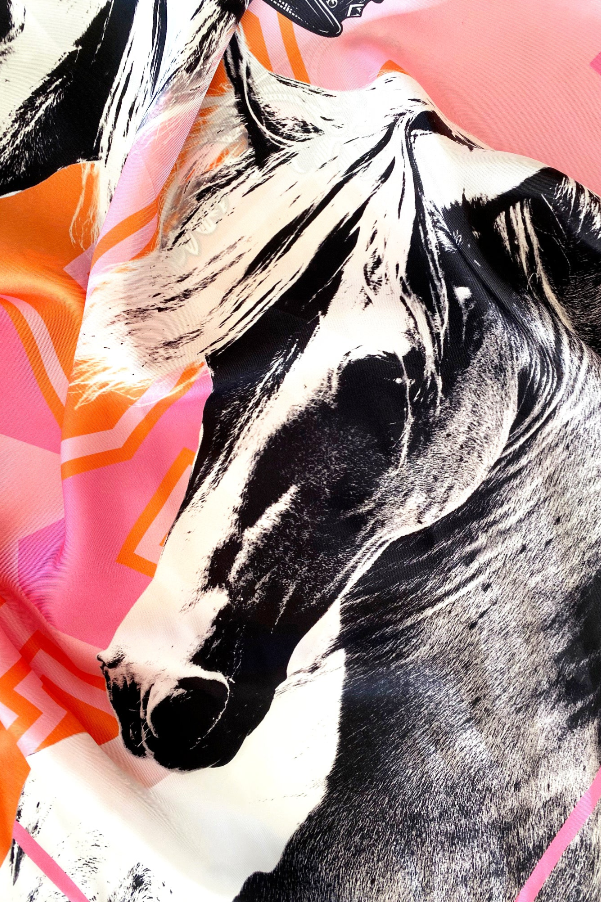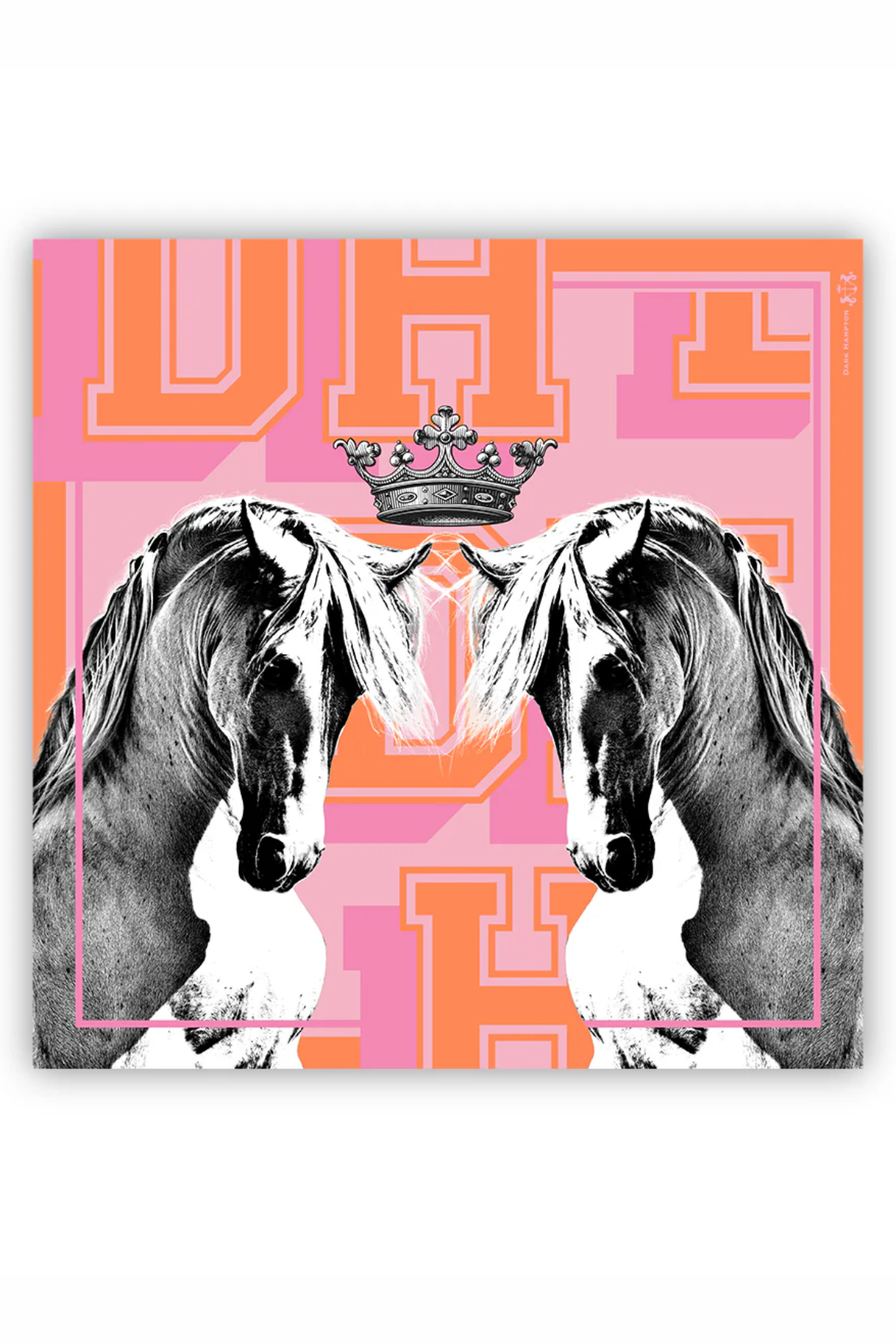 • Signature design - pink, orange, horses, and crown motifs.