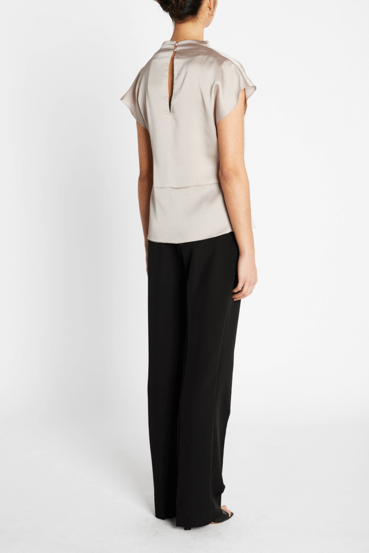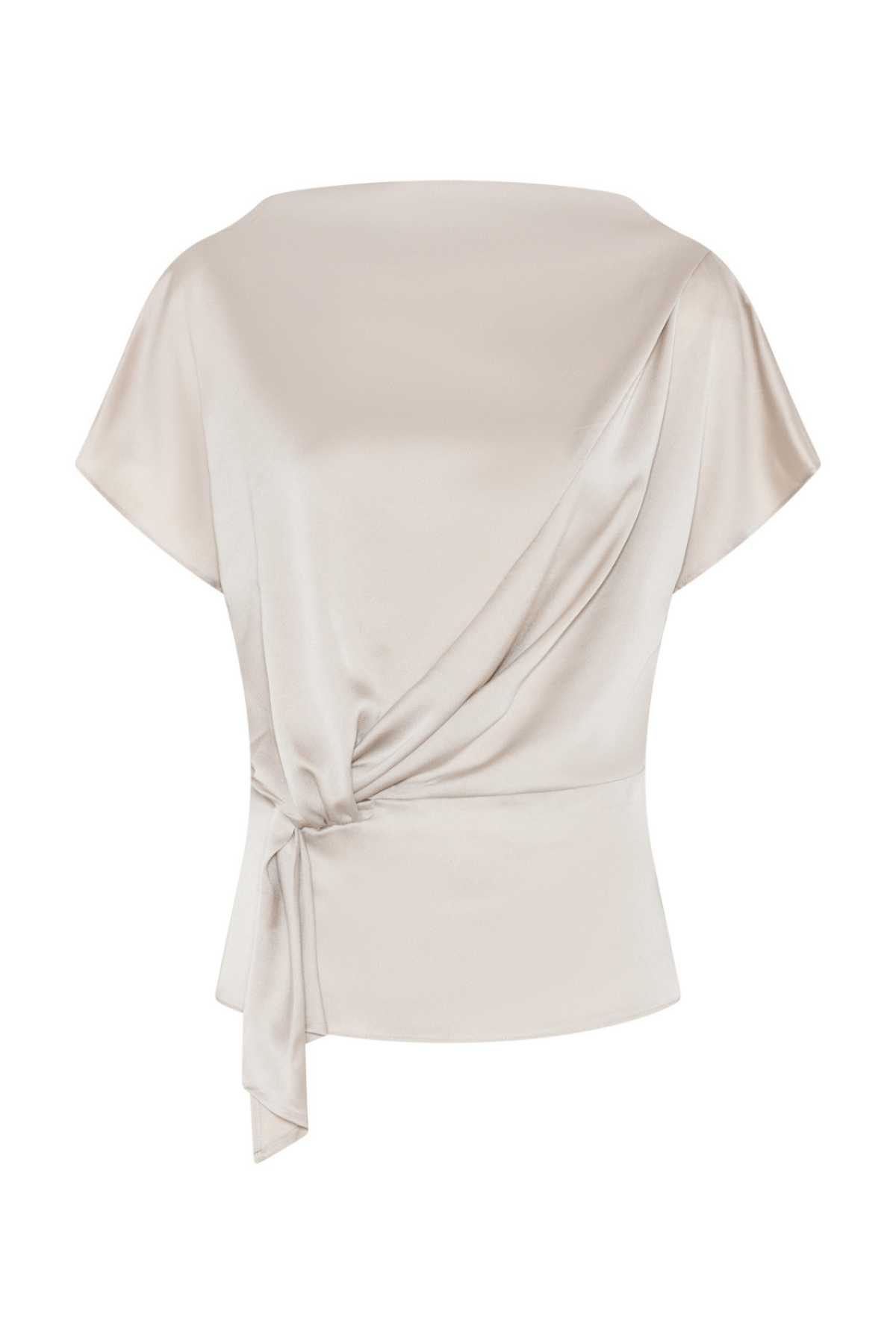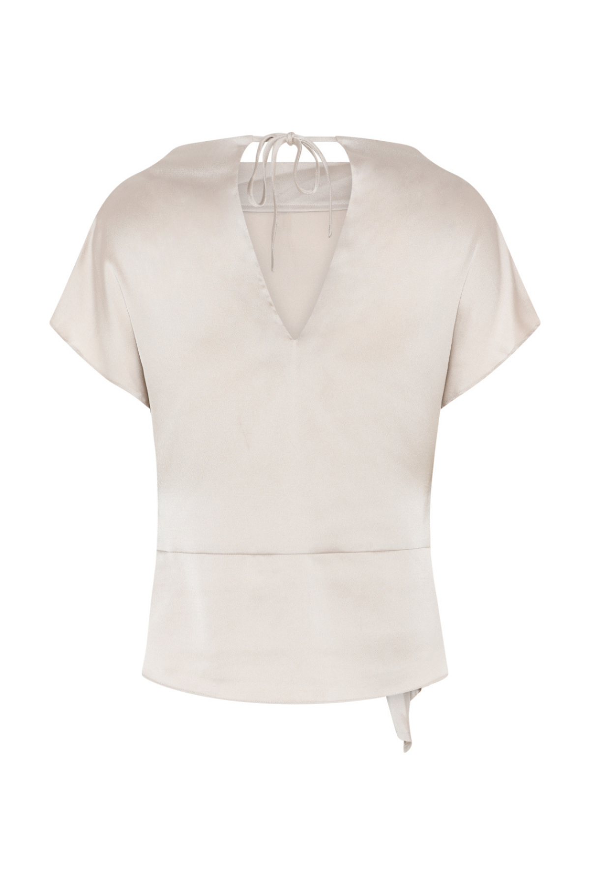 The Acacia Tinja Blouse by Bruuns Bazaar in Silver Cloud features a relaxed fit with soft pleats and a knotted waist -  elegant, feminine, and consciously made from recycled polyester. Perfect for pairing with tailored trousers or skirts for both office and evening wear.