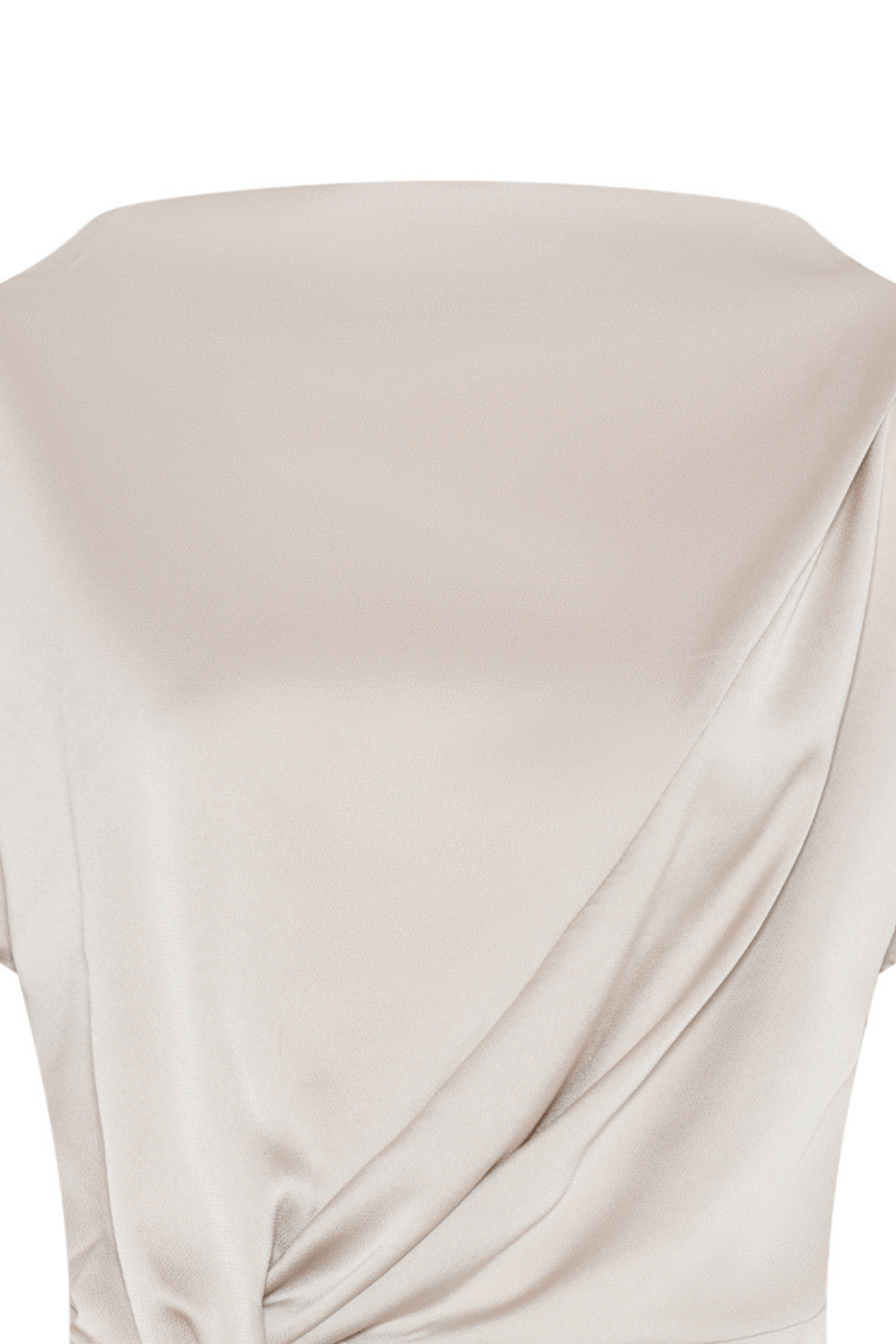 Its soft pleats and waist knot create an elegant drape that flatters the figure while keeping the look refined.
