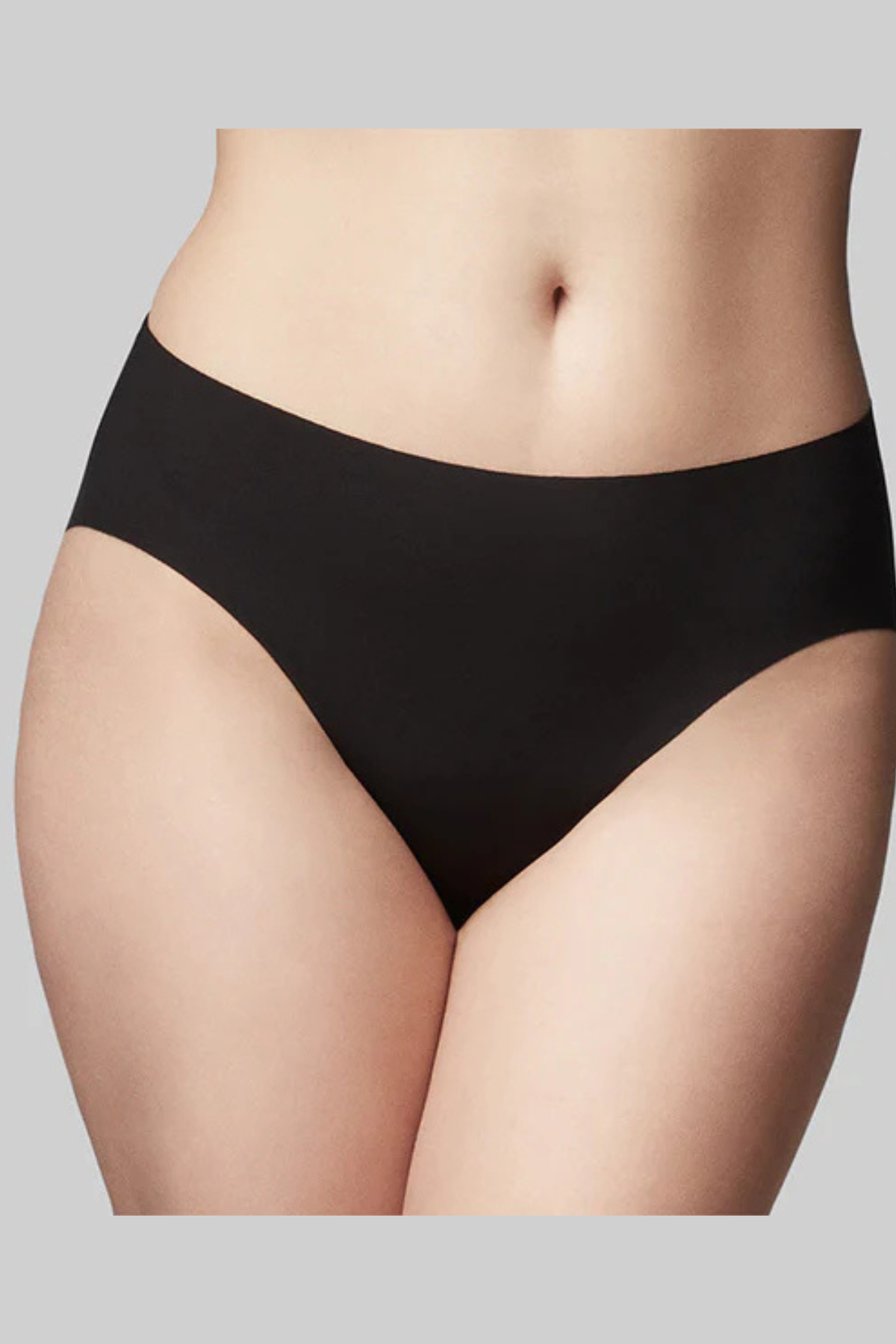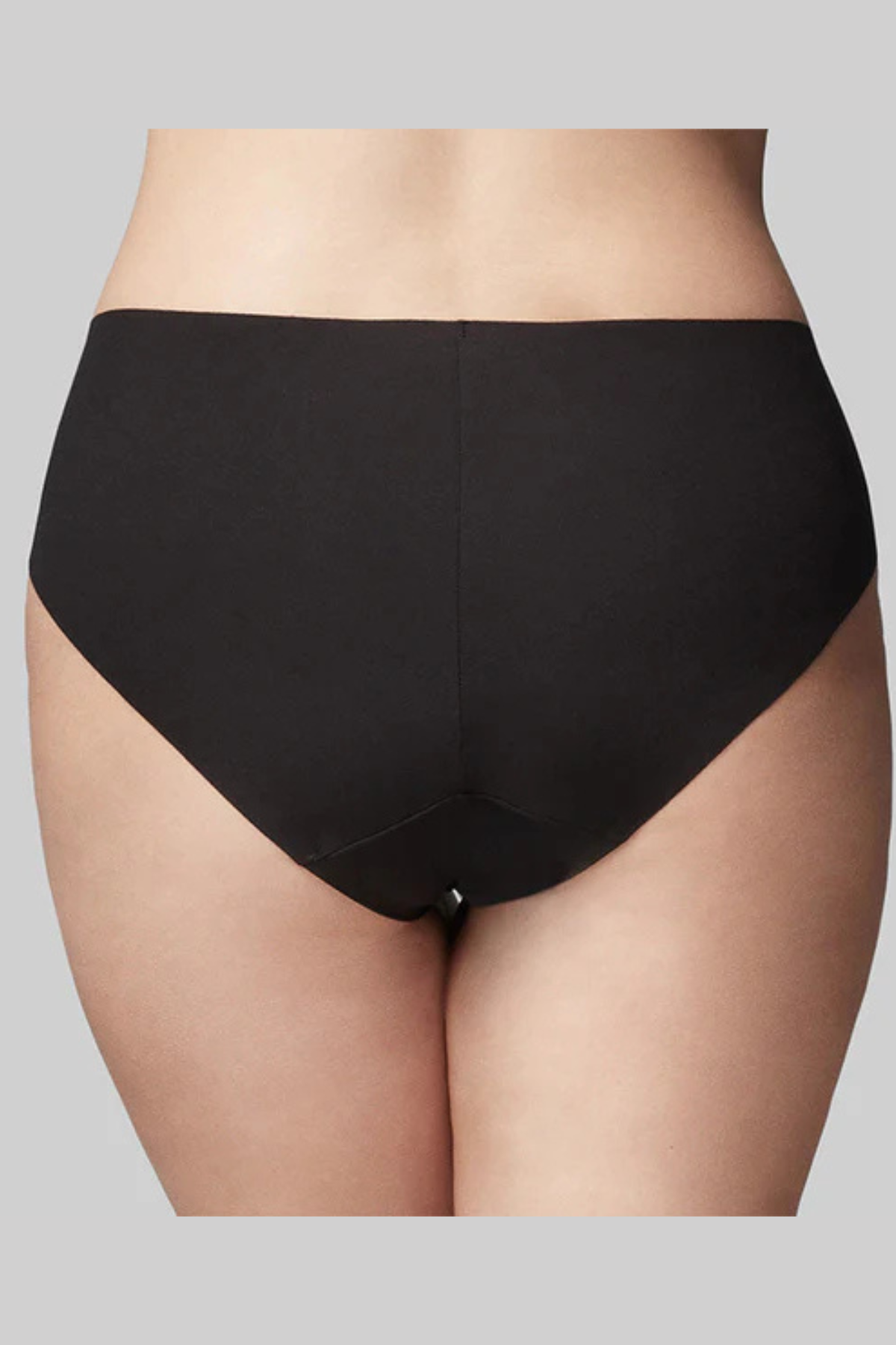 The Precision Hi Cut Brief in Black by The Knicker features laser-cut edges and high-cut leg design - hugs your body without elastic, prevents ride-up, provides smooth, no-pantyline coverage.
