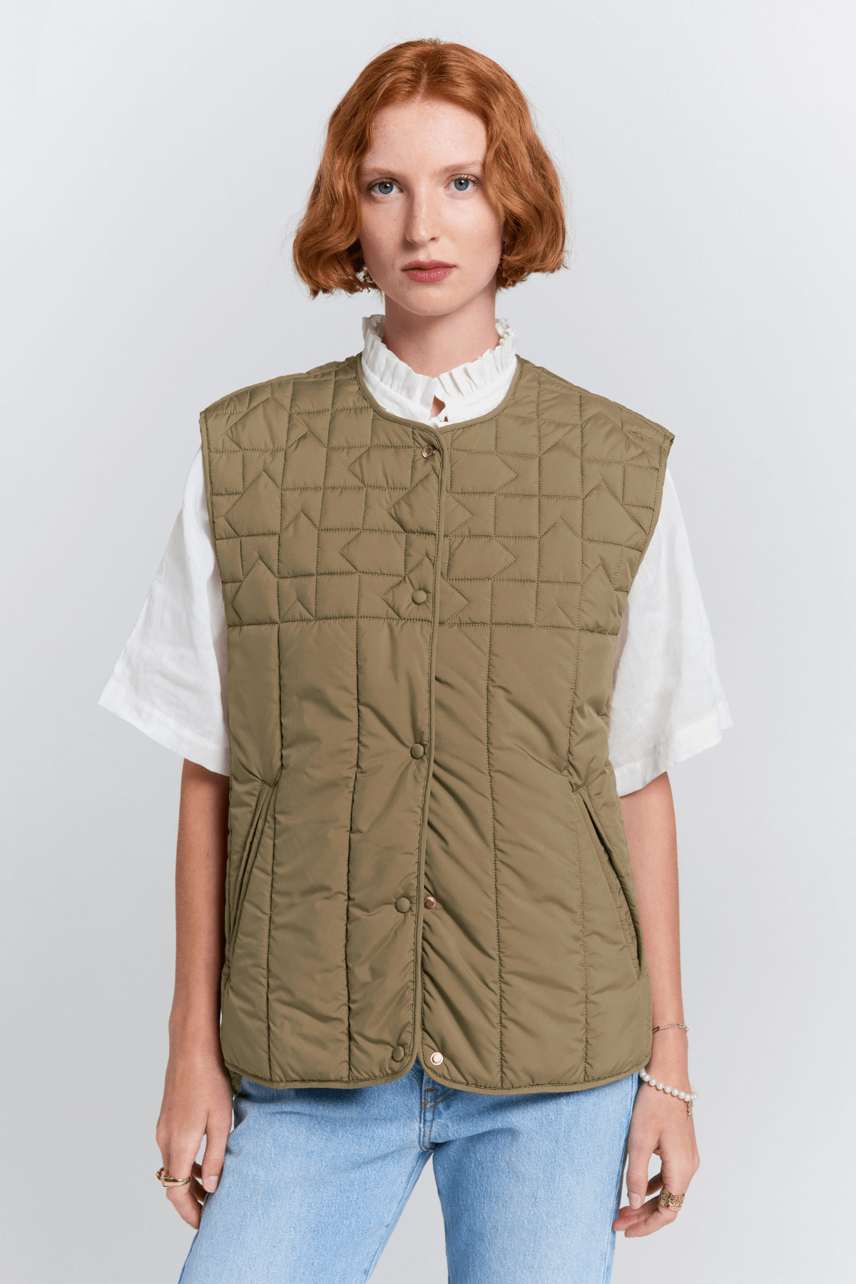 The Quilted Voyager Vest in Herb Green by Karen Walker is the perfect layering piece to add a dash of style and warmth to your winter wardrobe. With a sleek dome closure and a flattering quilted design, this vest is all about effortless chic. Whether you’re layering it over a sweater for chilly mornings or wearing it as an outerwear statement, it’s the ultimate way to stay cozy and cool. In that gorgeous herb green hue, it’s a must-have for those who want to stand out, without even trying!