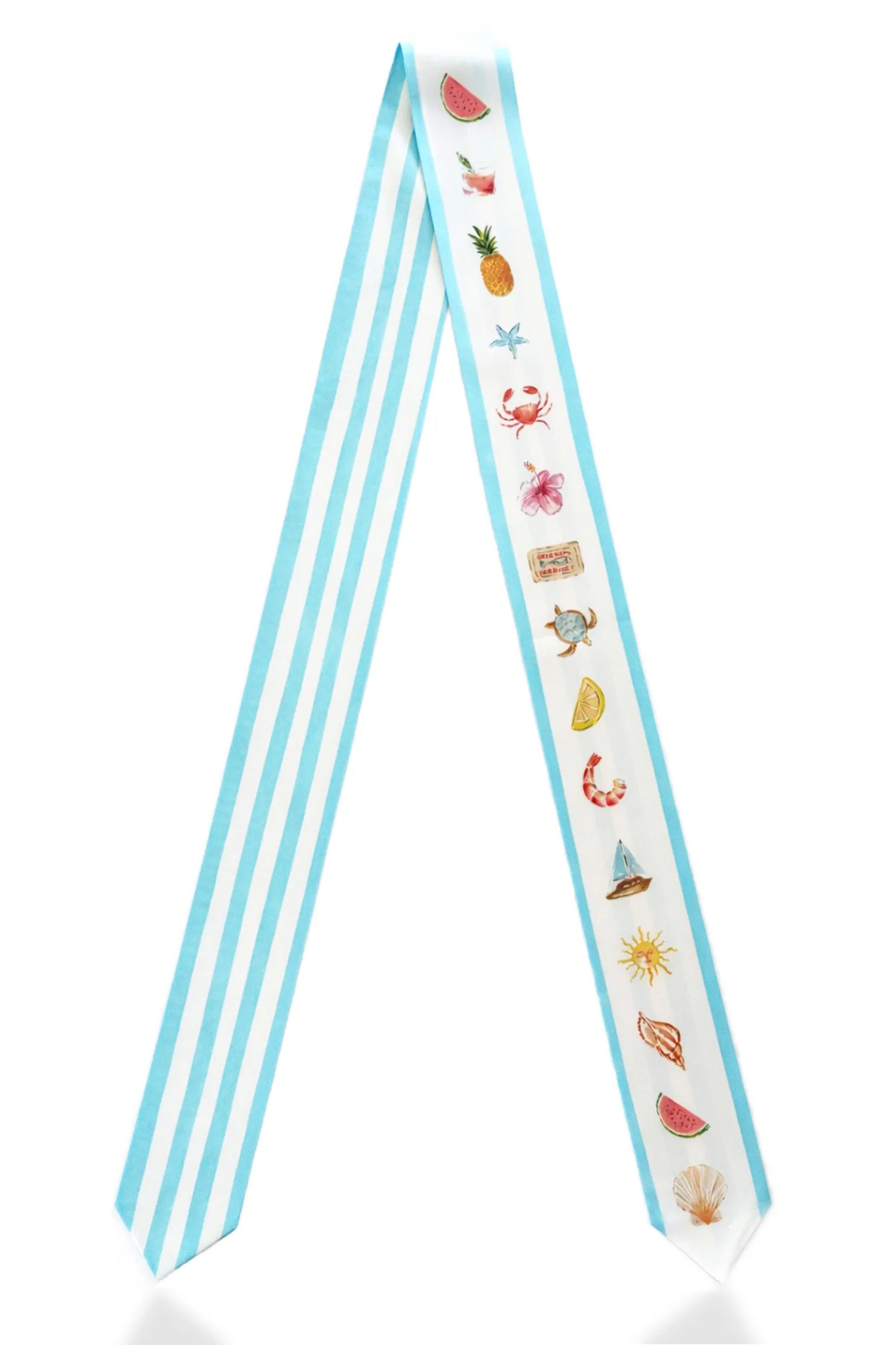 The Hastings silk twilly by Dark Hampton features Cass Deller’s hand-painted coastal illustrations, offering playful versatility for neck, hair, or handbags.